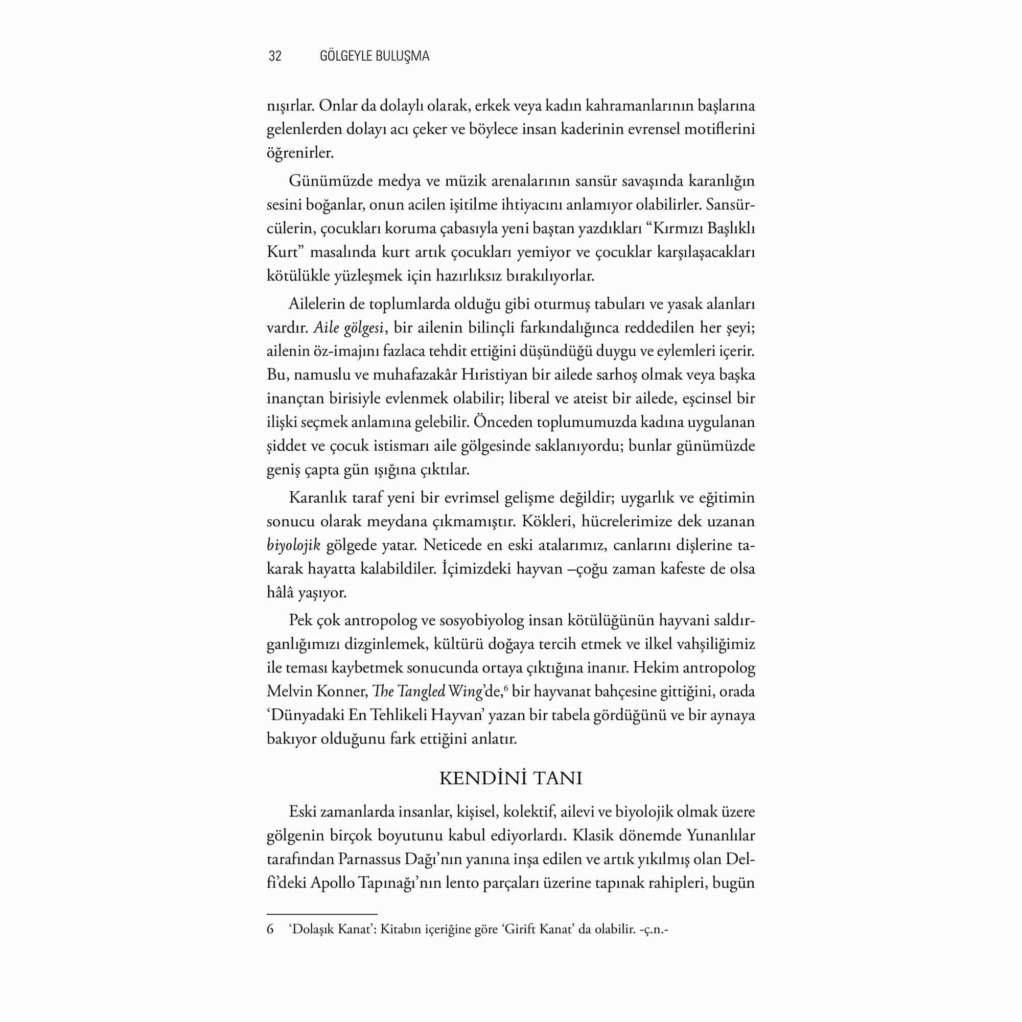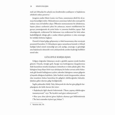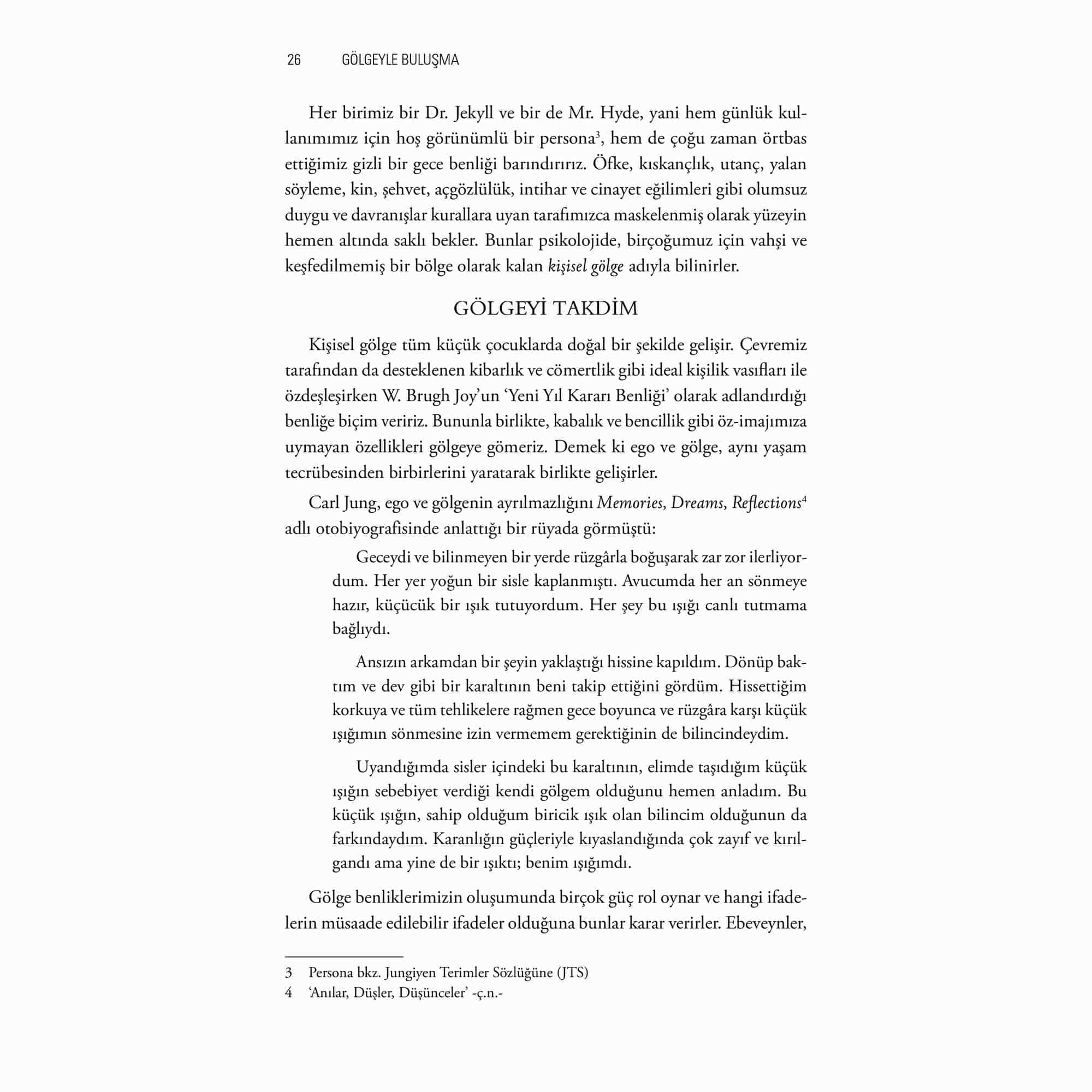 “Bilince çıkarmadığımız her şey hayatta kader olarak karşımıza çıkar.” Carl Gustav Jung Hiddet, kıskançlık, yalan söyleme, hınç, suçlama, açgözlülük… Bu yasak hisler ve davranışlar karanlıkta kalan ve inkâr ettiğimiz tarafımızdan yani kişisel gölgemizden ortaya çıkar. Herkesin bir gölgesi vardır ve bilinçli yaşamında birey ona ne kadar az yer verirse gölge o denli karanlık ve yoğun olur. Birisine karşı açıklanamaz bir antipati hissettiğimizde, kendimizde uzun süre gömülü kalmış, kabul edilemez bir özellik keşfettiğimizde, öfke, haset veya utançtan bunalıp bu duygulara yenik düştüğümüzde gölgemizle karşılaşırız. Gölge yalnızca bireysel bir sorun değildir. Grupların ve toplumların da ırkçılık, günah keçisi bulma, düşman yaratma ve savaş gibi tehlikeli davranışlara götüren kolektif gölgeleri vardır. Gölgeyle Buluşma, 65 makaleden oluşan bir makale koleksiyonunda, insan doğasının karanlık tarafının ailelerde, yakın ilişkilerde, işte, maneviyatta, politikada, psikoterapide ve sanatta belirdiği şekline kapsamlı bir bakış sunuyor. "İnsana ve insanlığa dair pek çok önemli konunun tıp, siyaset, din, sanat, tarih ve farklı disiplinler penceresinden ele alındığı bu eser gerek yazarları gerek makaleleri ile bir başyapıt olma hüviyeti taşıyor. Bireyi ve toplumu eşzamanlı görmekle kalmayıp bütünsel varoluşuna çektiği dikkat ile okuyucusunda bir tamlık duygusu bırakıyor. Gölgeyle Buluşma kendine, dünyaya, insan olma deneyimine ve uygarlığı doğuran tüm dinamiklere bakmak isteyen herkes için cüretkâr bir davet, berrak bir ayna. Carl Gustav Jung ve Analitik Psikoloji okulunun öncü isimlerinin yanı sıra pek çok düşün insanının katkısı ile oluşturulmuş bu çok yazarlı kitap özenli çevirisi sayesinde akışkan bir dille dimağımıza akıyor. Bu eser birey olarak kendini var etme ve anlamlandırma iddiasında olan herkesin kütüphanesindeki yerini almalı."Berin Orhan