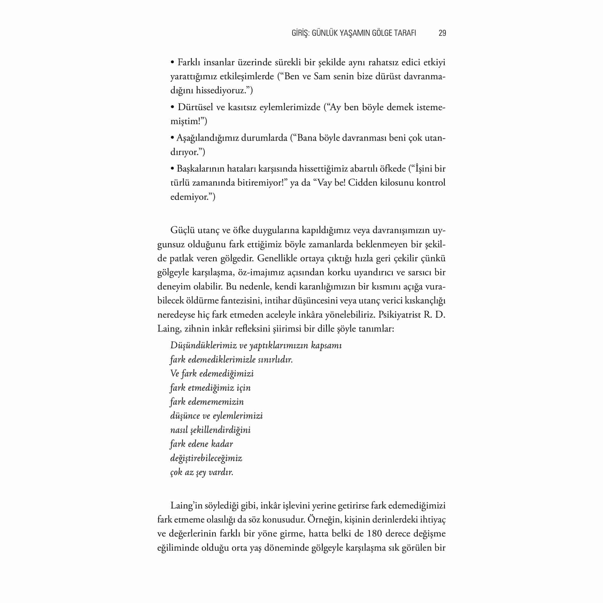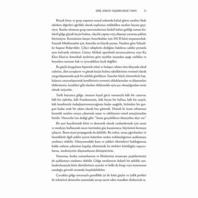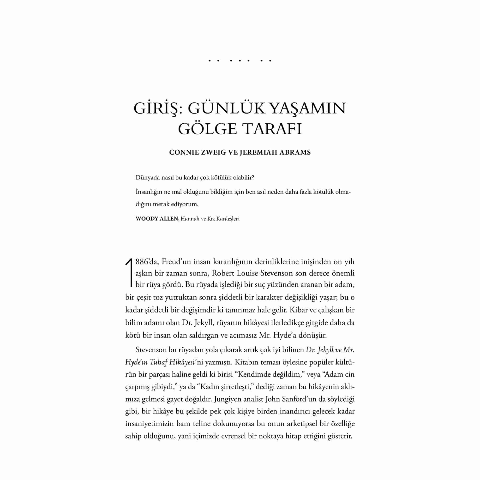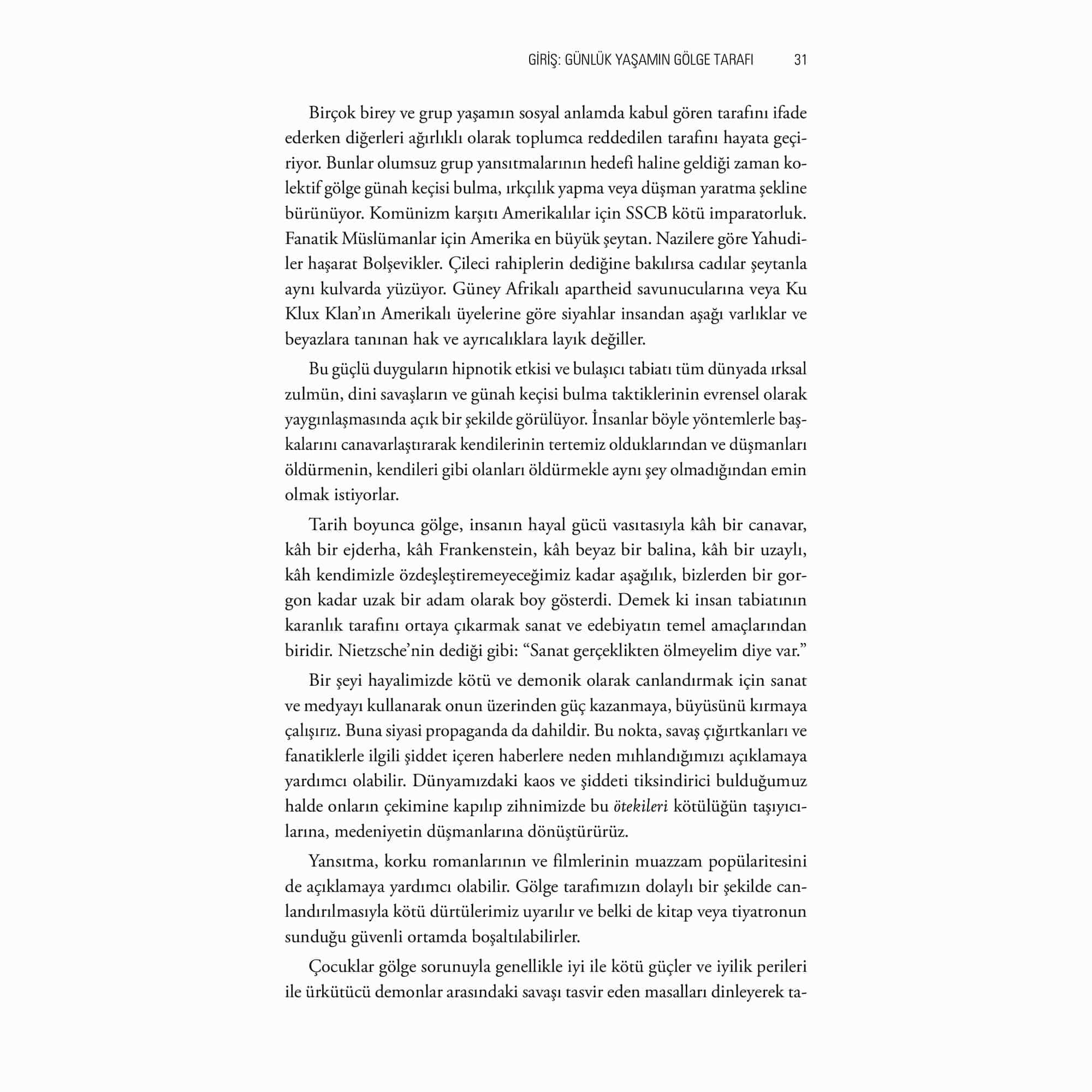“Bilince çıkarmadığımız her şey hayatta kader olarak karşımıza çıkar.” Carl Gustav Jung Hiddet, kıskançlık, yalan söyleme, hınç, suçlama, açgözlülük… Bu yasak hisler ve davranışlar karanlıkta kalan ve inkâr ettiğimiz tarafımızdan yani kişisel gölgemizden ortaya çıkar. Herkesin bir gölgesi vardır ve bilinçli yaşamında birey ona ne kadar az yer verirse gölge o denli karanlık ve yoğun olur. Birisine karşı açıklanamaz bir antipati hissettiğimizde, kendimizde uzun süre gömülü kalmış, kabul edilemez bir özellik keşfettiğimizde, öfke, haset veya utançtan bunalıp bu duygulara yenik düştüğümüzde gölgemizle karşılaşırız. Gölge yalnızca bireysel bir sorun değildir. Grupların ve toplumların da ırkçılık, günah keçisi bulma, düşman yaratma ve savaş gibi tehlikeli davranışlara götüren kolektif gölgeleri vardır. Gölgeyle Buluşma, 65 makaleden oluşan bir makale koleksiyonunda, insan doğasının karanlık tarafının ailelerde, yakın ilişkilerde, işte, maneviyatta, politikada, psikoterapide ve sanatta belirdiği şekline kapsamlı bir bakış sunuyor. "İnsana ve insanlığa dair pek çok önemli konunun tıp, siyaset, din, sanat, tarih ve farklı disiplinler penceresinden ele alındığı bu eser gerek yazarları gerek makaleleri ile bir başyapıt olma hüviyeti taşıyor. Bireyi ve toplumu eşzamanlı görmekle kalmayıp bütünsel varoluşuna çektiği dikkat ile okuyucusunda bir tamlık duygusu bırakıyor. Gölgeyle Buluşma kendine, dünyaya, insan olma deneyimine ve uygarlığı doğuran tüm dinamiklere bakmak isteyen herkes için cüretkâr bir davet, berrak bir ayna. Carl Gustav Jung ve Analitik Psikoloji okulunun öncü isimlerinin yanı sıra pek çok düşün insanının katkısı ile oluşturulmuş bu çok yazarlı kitap özenli çevirisi sayesinde akışkan bir dille dimağımıza akıyor. Bu eser birey olarak kendini var etme ve anlamlandırma iddiasında olan herkesin kütüphanesindeki yerini almalı."Berin Orhan
