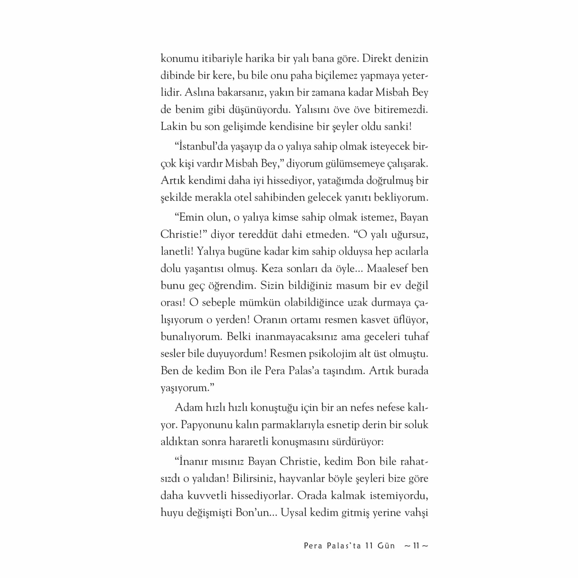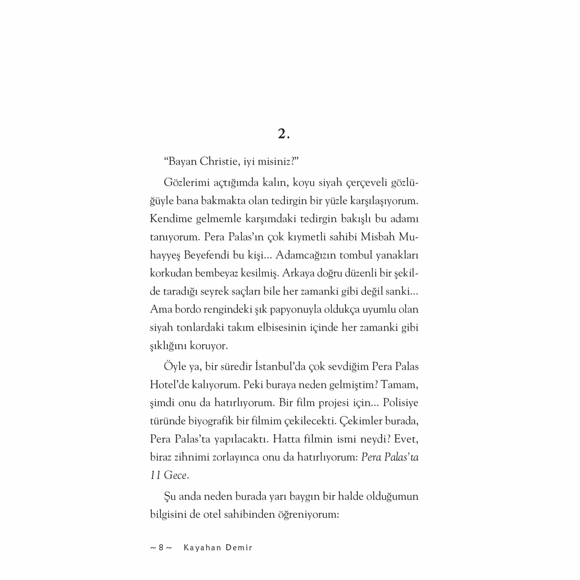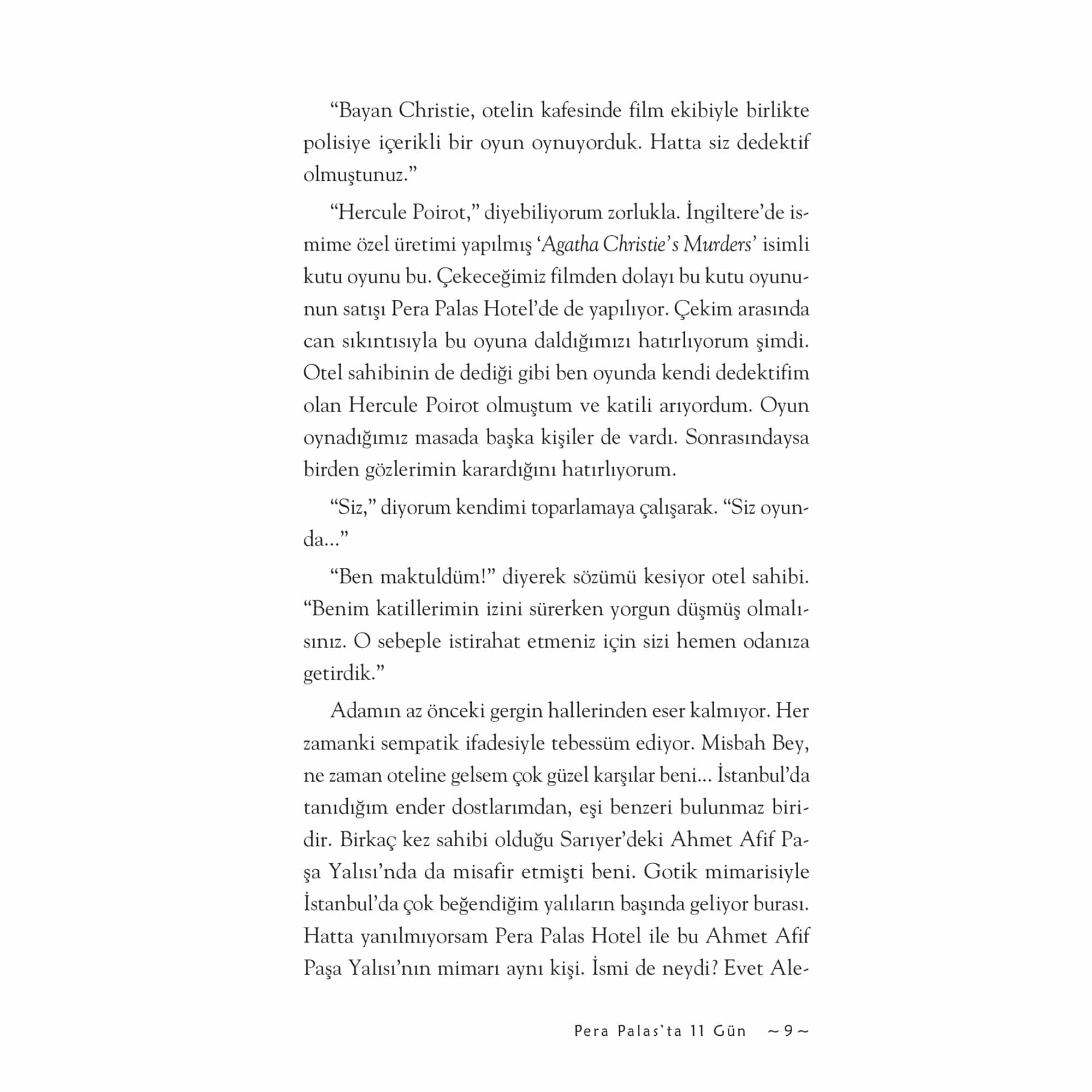 En büyük cinayet, bir insanın mutluluğunu, hayallerini öldürmektir!   Ünlü polisiye yazarı, nam-ı diğer Polisiye Kraliçesi, Agatha Christie geçmişte onbir gün ortadan kaybolur. Arabası bir göl kenarında ağaçlara çarpmış bir şekilde bulunduğunda herkes onun öldüğünden emindir. Ancak ünlü yazar İstanbul’un en ünlü oteli Pera Palas’a geri döner ve [...]