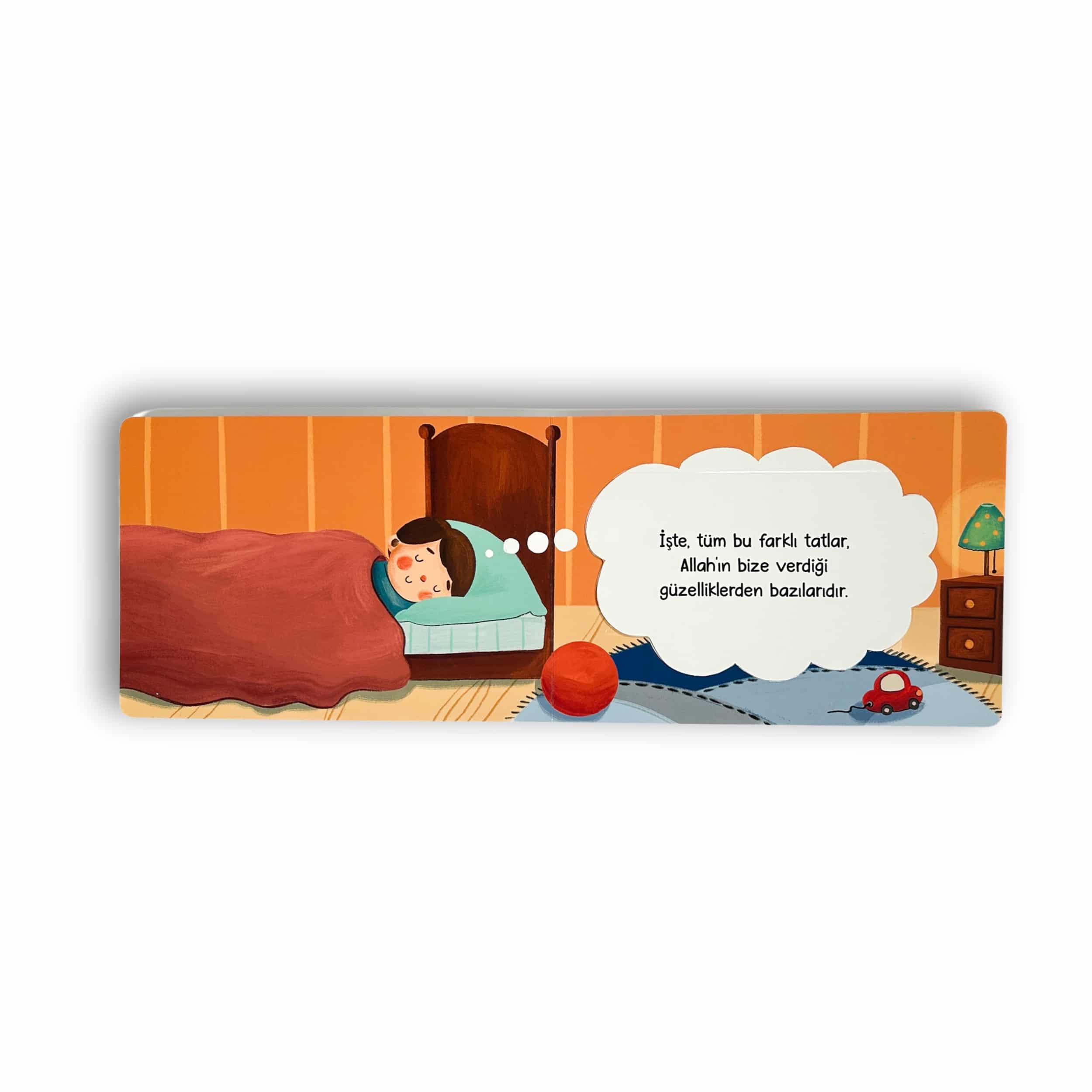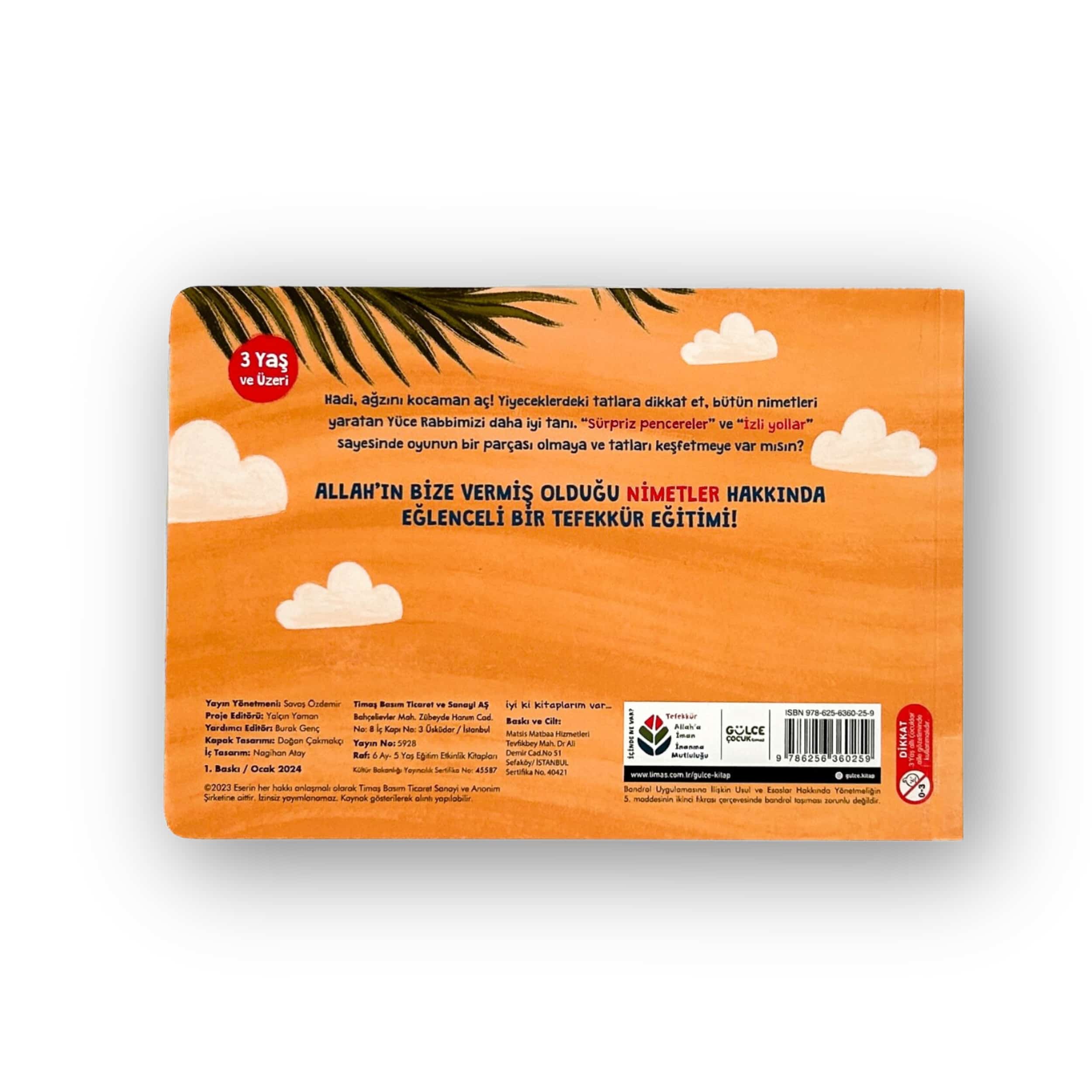Hadi, ağzını kocaman aç! Yiyeceklerdeki tatlara dikkat et, bütün nimetleri yaratan Yüce Rabbimizi daha iyi tanı. “Sürpriz pencereler” ve “İzli yollar” sayesinde oyunun bir parçacı olmaya ve tatları keşfetmeye var mısın? Allah’ın bize vermiş olduğu nimetler hakkında eğlenceli bir tefekkür eğitimi!