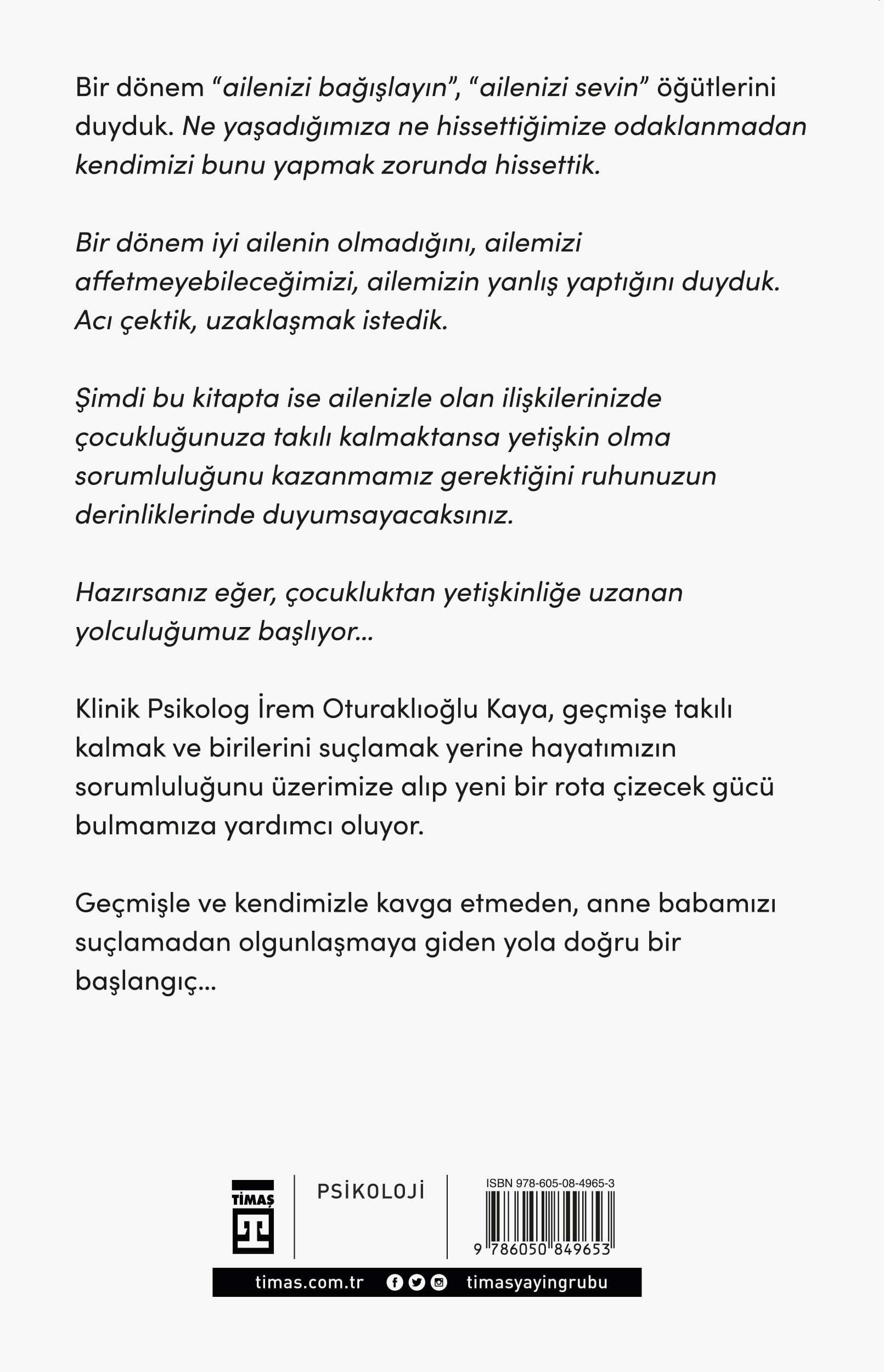 Bir dönem “ailenizi bağışlayın”, “ailenizi sevin” öğütlerini duyduk. Ne yaşadığımıza ne hissettiğimize odaklanmadan kendimizi bunu yapmak zorunda hissettik. Bir dönem iyi ailenin olmadığını, ailemizi affetmeyebileceğimizi, ailemizin yanlış yaptığını duyduk. Acı çektik, uzaklaşmak istedik. Şimdi bu kitapta ise ailenizle olan ilişkilerinizde çocukluğunuza takılı kalmaktansa yetişkin olma sorumluluğunu kazanmamız gerektiğini ruhunuzun derinliklerinde duyumsayacaksınız. Hazırsanız eğer, çocukluktan yetişkinliğe uzanan yolculuğumuz başlıyor… Klinik Psikolog İrem Oturaklıoğlu Kaya, geçmişe takılı kalmak ve birilerini suçlamak yerine hayatımızın sorumluluğunu üzerimize alıp yeni bir rota çizecek gücü bulmamıza yardımcı oluyor. Geçmişle ve kendimizle kavga etmeden, anne babamızı suçlamadan olgunlaşmaya giden yola doğru bir başlangıç…