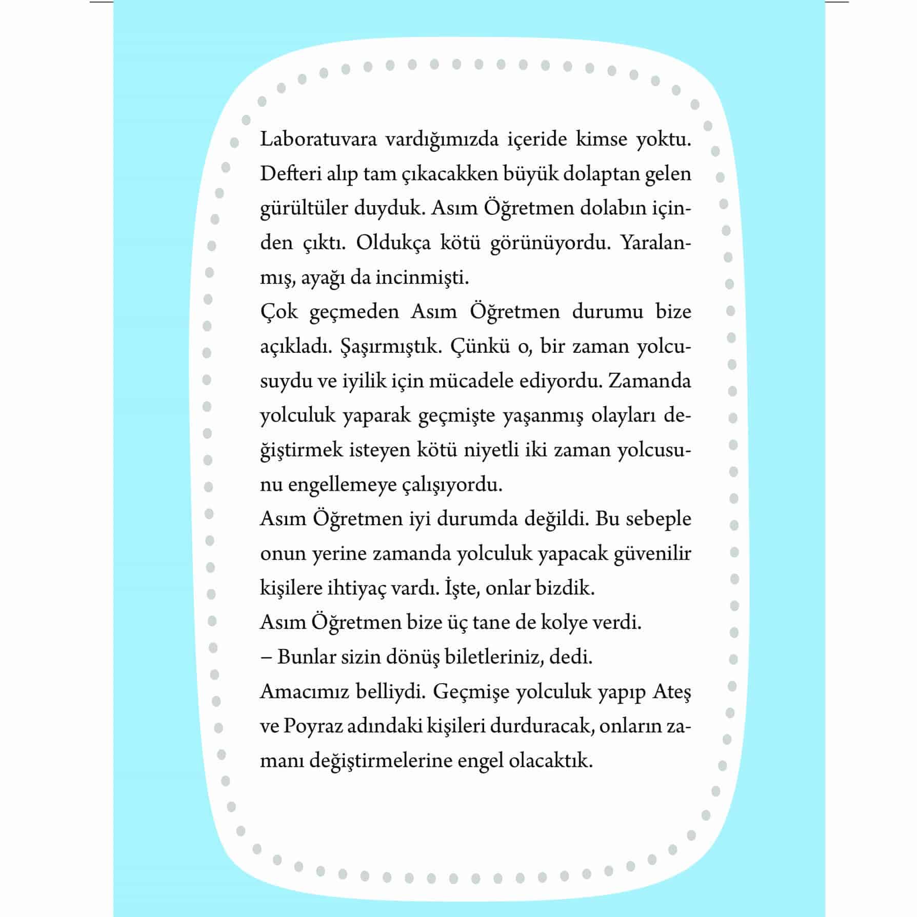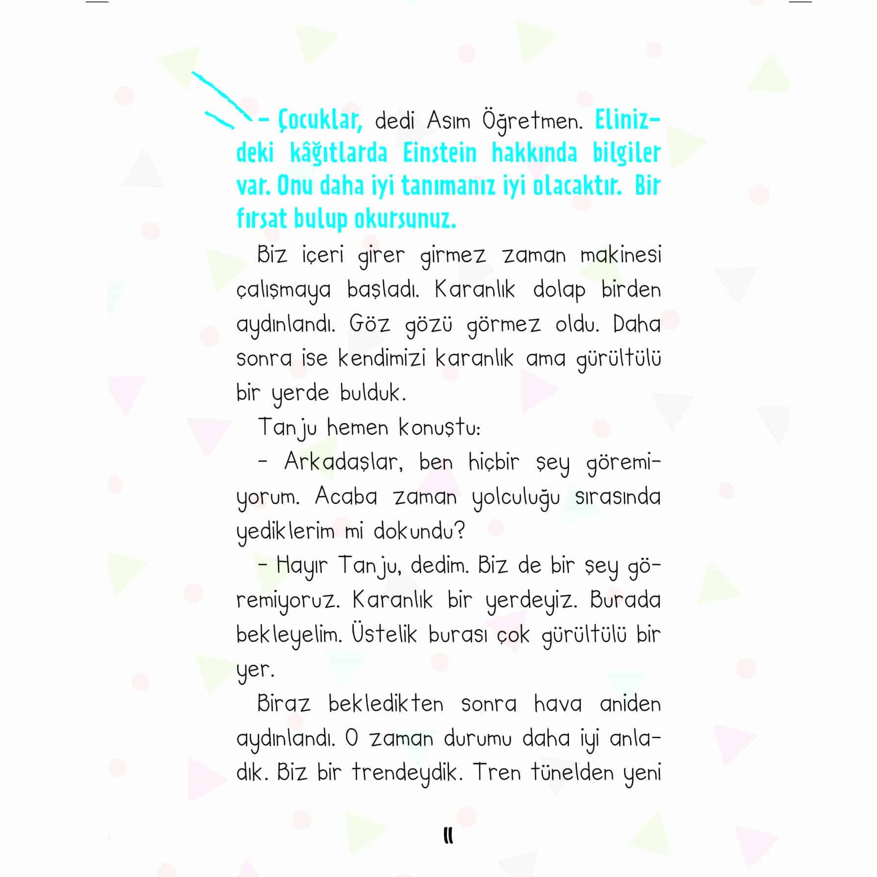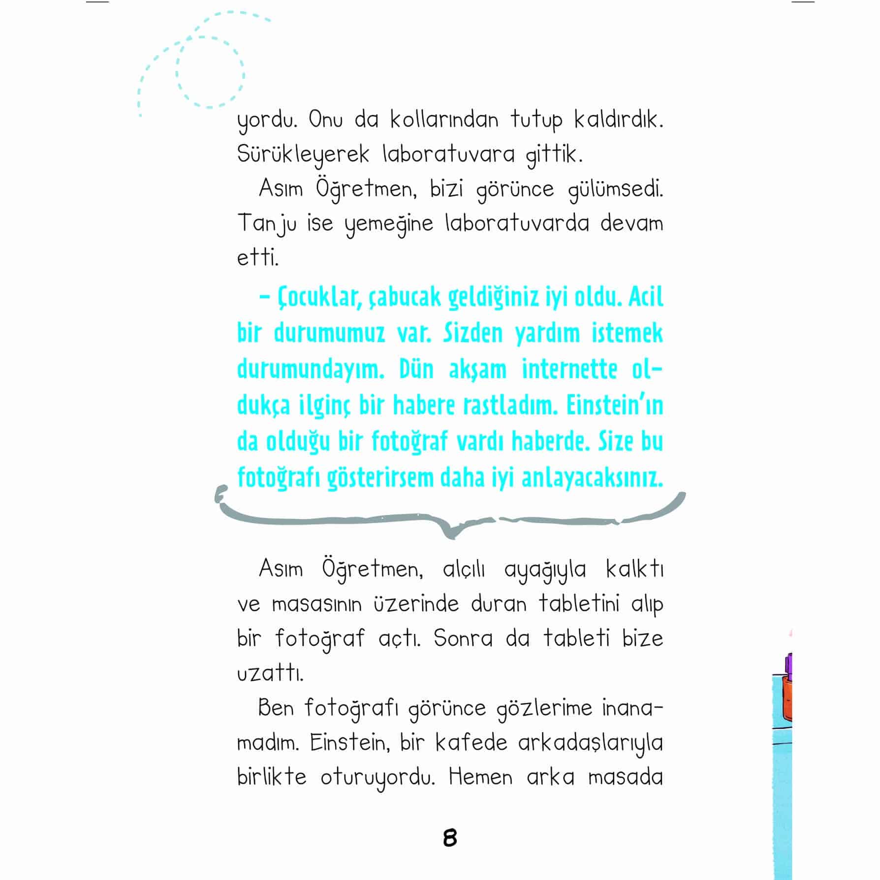 Çok sevilen Levent serisinin yazarı Mustafa Orakçı bu defa okurlarını Duru, Mete ve Tanju’yla tanışmaya davet ediyor. Yazdığı her kitapla okurlarının beğenisini toplayan, çocuklara okumayı sevdiren yazar olarak bilinen Mustafa Orakçı’nın “Bilim İnsanlarının İzinde” serisi beş kitaptan oluşuyor. Serinin bu kitabında kahramanlarımız, yaptıkları zaman yolculukları sayesinde Albert Eintein'la tanışıyor. Hem onu ve onun buluşlarını yakından tanıyor hem de kötü niyetli zaman yolcuları Ateş ve Poyraz’ın planlarını bozuyor.