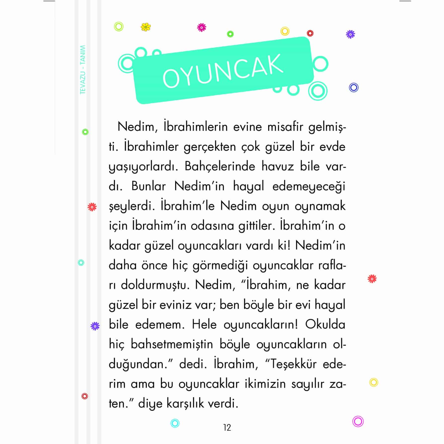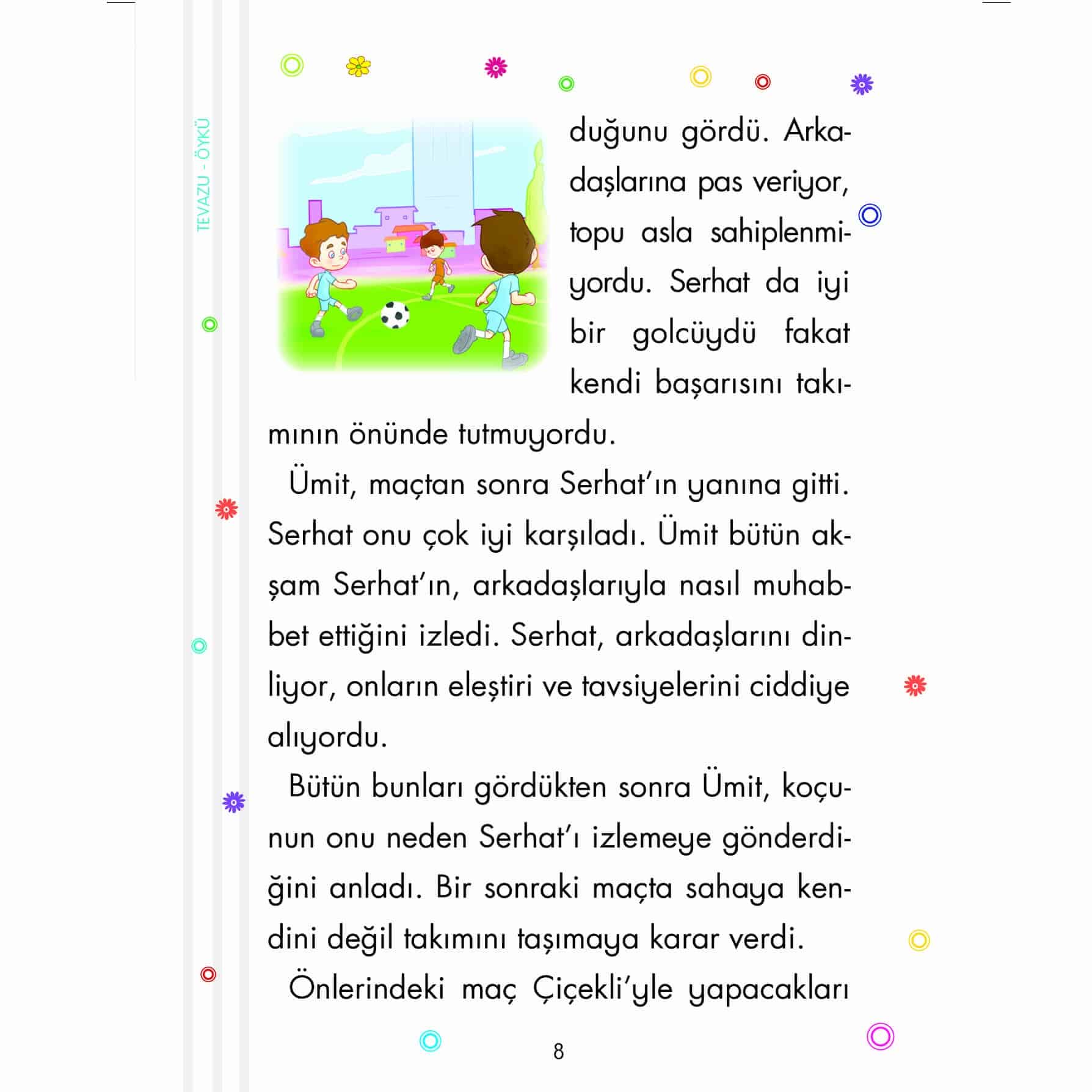 Beş yetkin yazar ve proje danışmanı tarafından hazırlanan kitap, ‘tevazu’ yani alçak gönüllülük davranışı üzerine günlük hayattan çeşitli hikâyelerle anlatılıyor. Çocukların anlayacağı sade ve nahif bir dille anlatılan hikâyelerin, özellikle küçük yaşta çocukların günlük yaşamlarında karşılaşma olasılığı yüksek olaylardan seçilmesi kitabın en büyük avantajı.