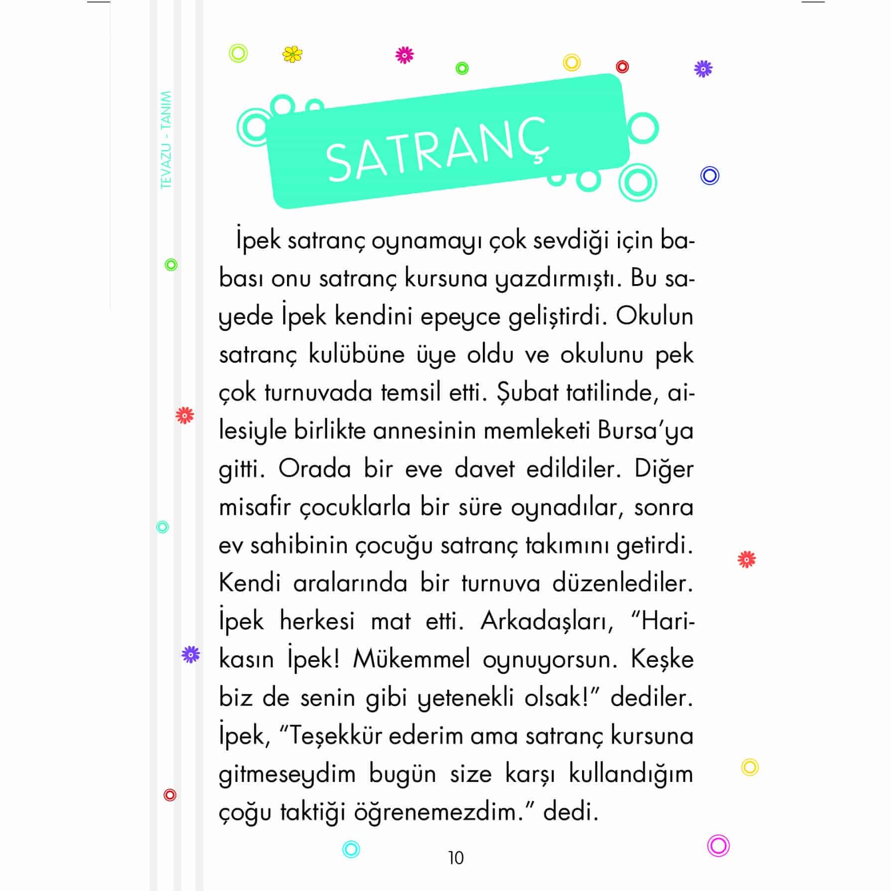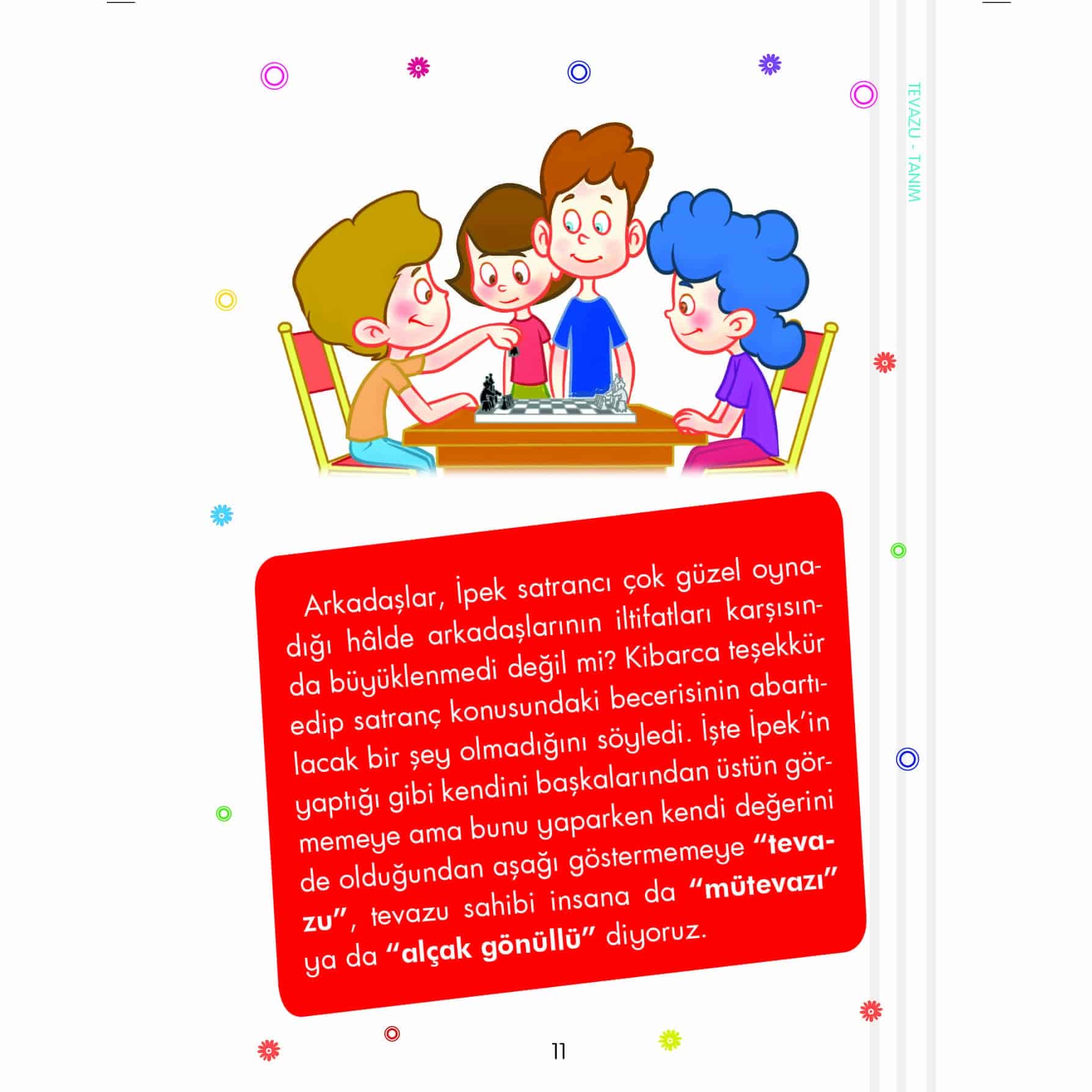 Beş yetkin yazar ve proje danışmanı tarafından hazırlanan kitap, ‘tevazu’ yani alçak gönüllülük davranışı üzerine günlük hayattan çeşitli hikâyelerle anlatılıyor. Çocukların anlayacağı sade ve nahif bir dille anlatılan hikâyelerin, özellikle küçük yaşta çocukların günlük yaşamlarında karşılaşma olasılığı yüksek olaylardan seçilmesi kitabın en [...]