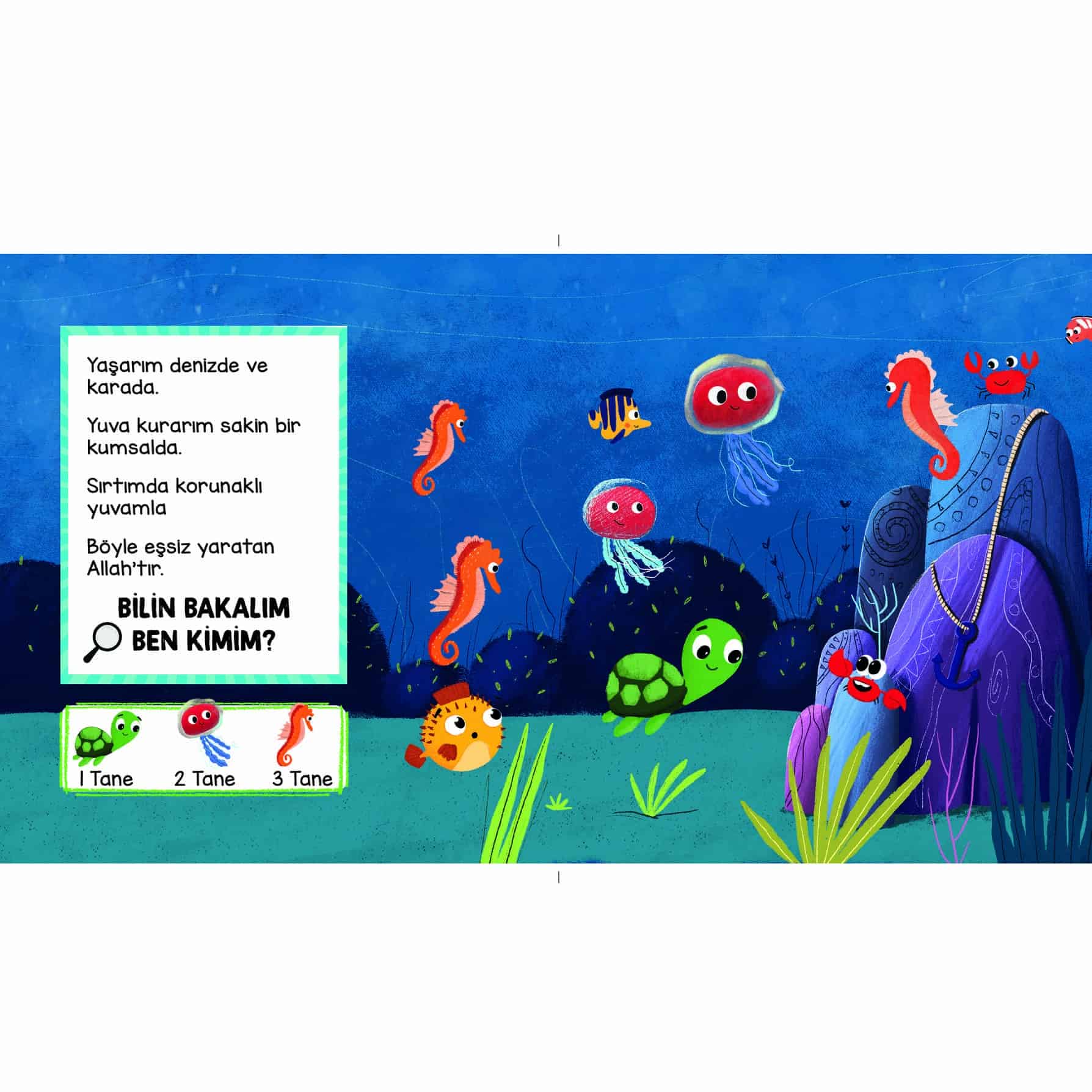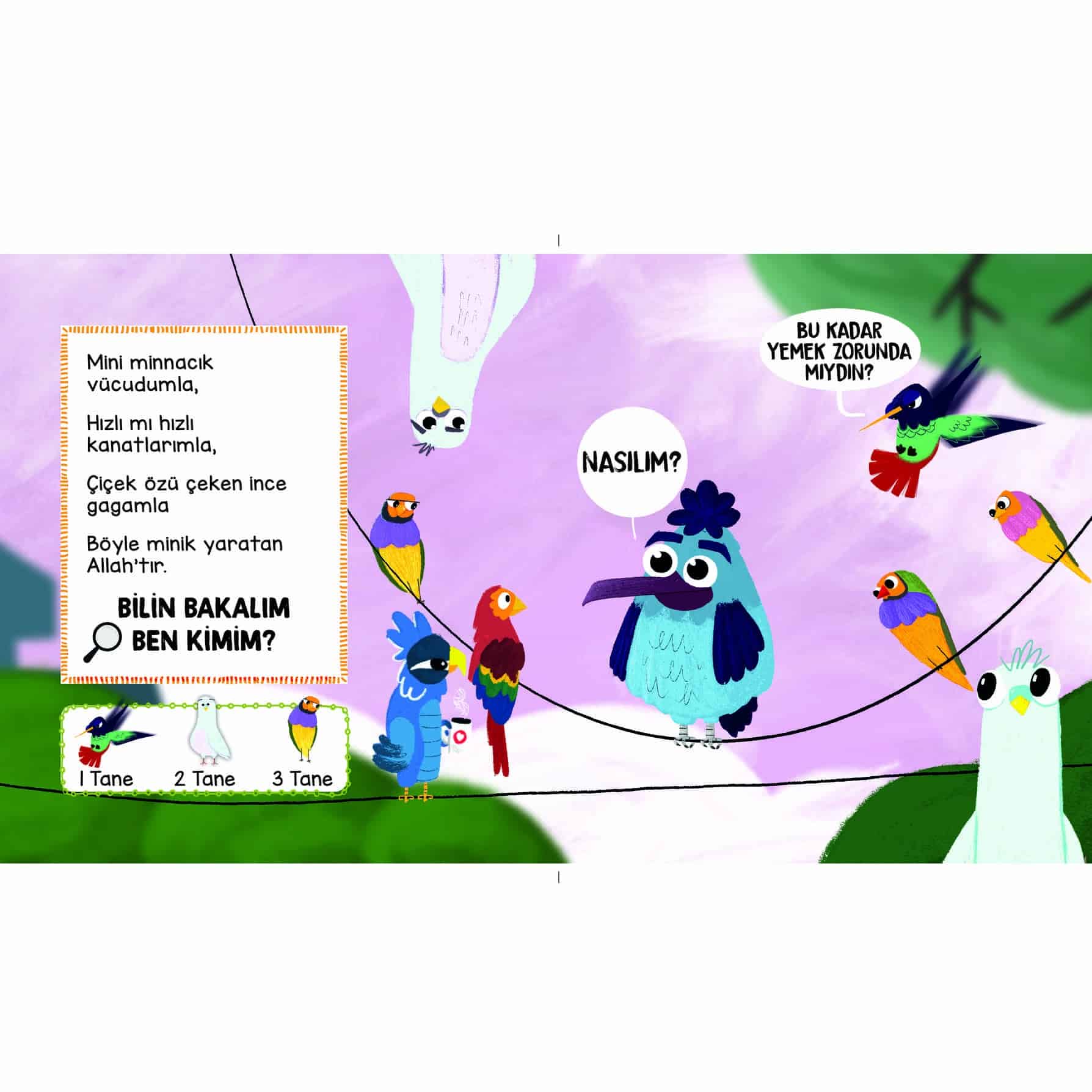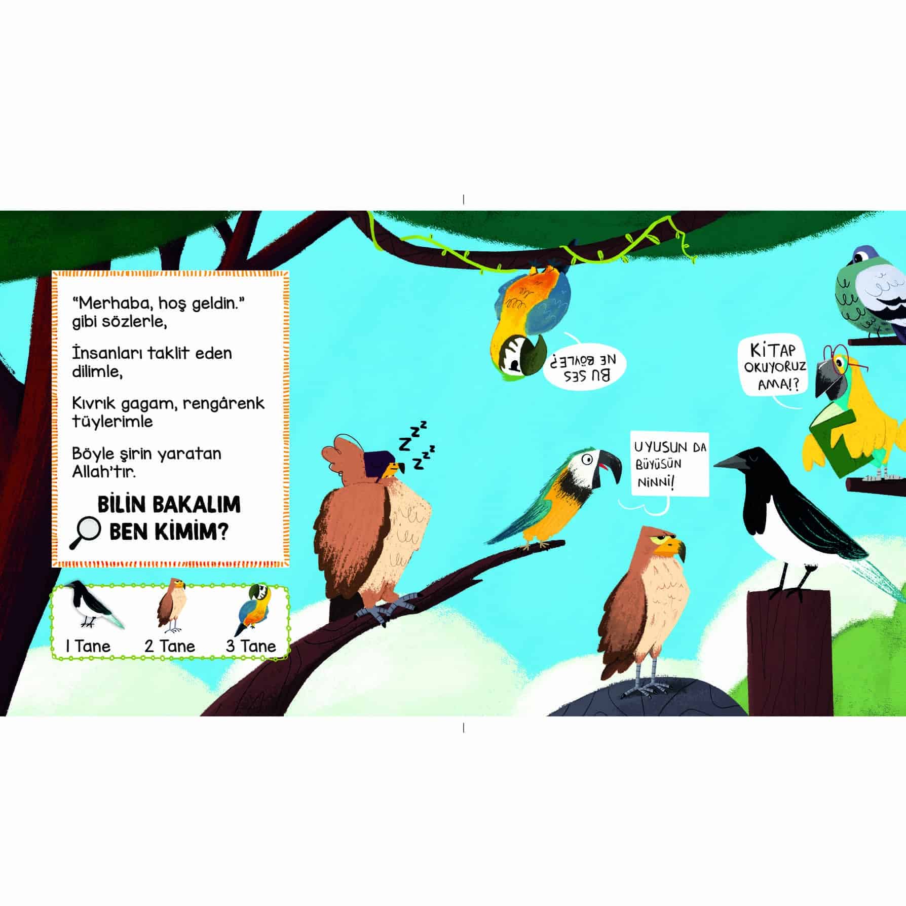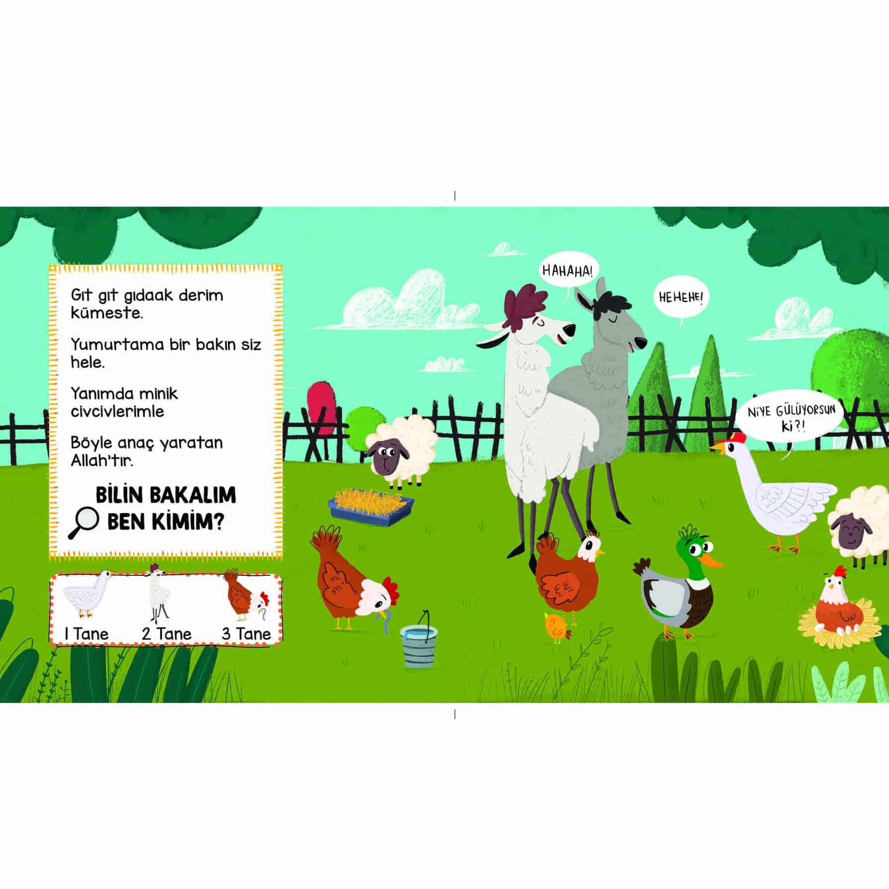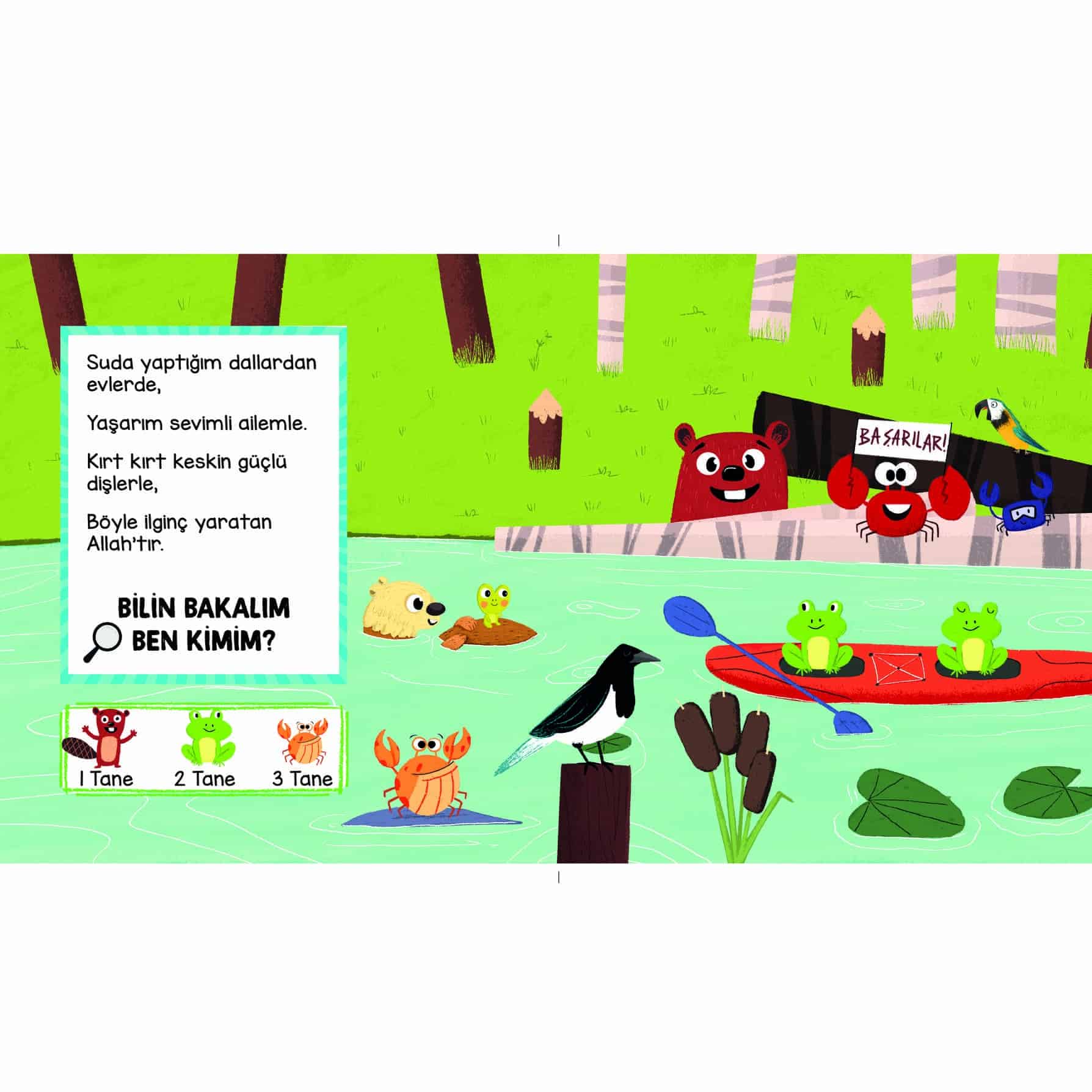 Merhaba dünyayı ve canlıları yeni yeni öğrenen minik okur.Hayranlıkla baktığın bu şirin hayvanlar ne kadar da güzel değil mi! Onları, tıpkı senin gibi, bu kadar güzel yaratan Allah. Haydi açalım kitabımızı ve senin için hazırladığımız sürprizleri beraber görelim.