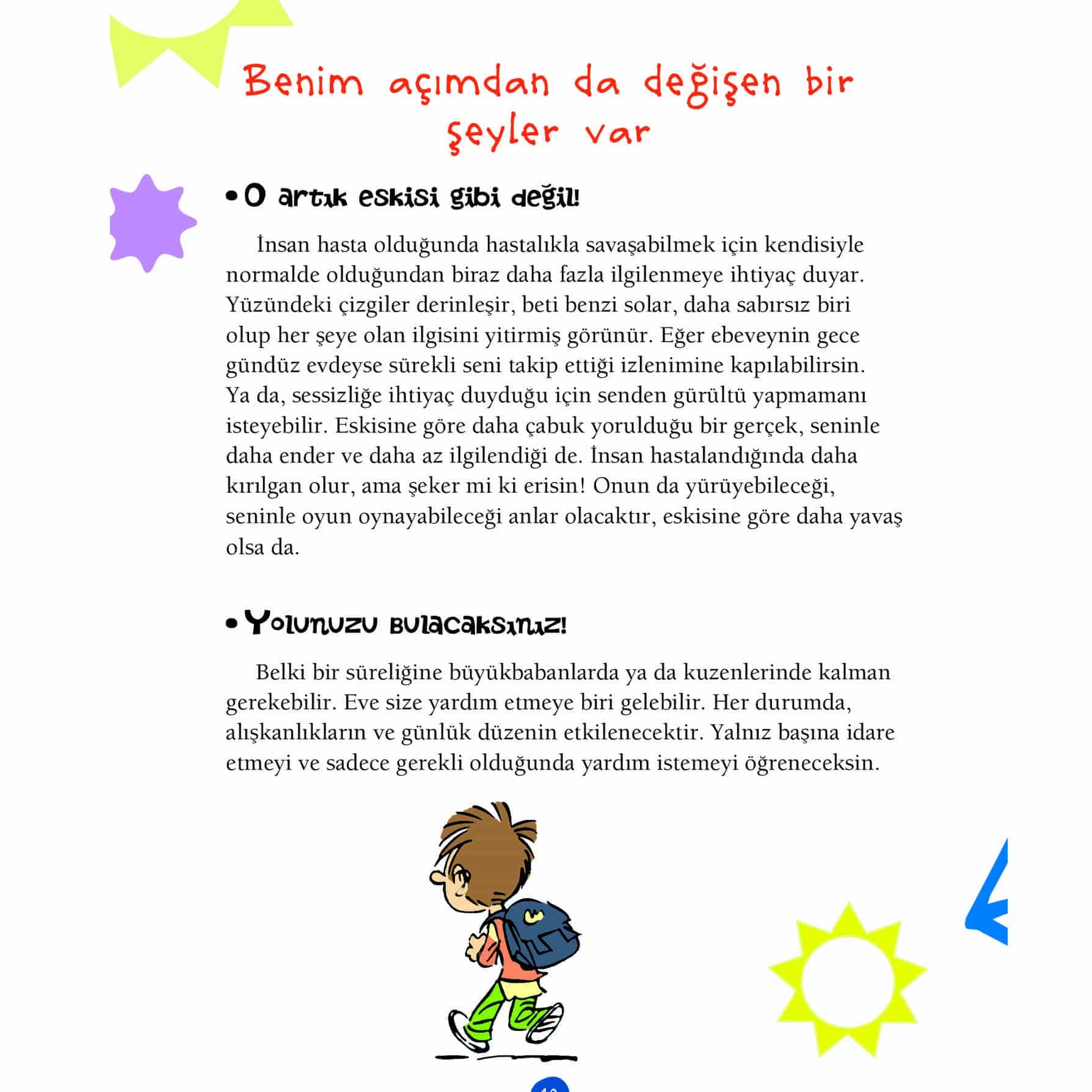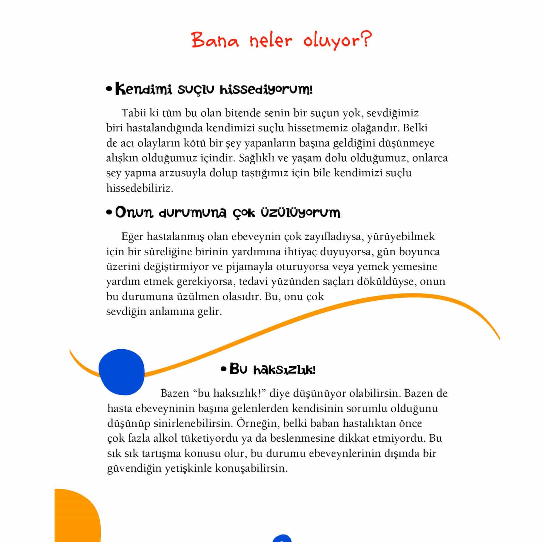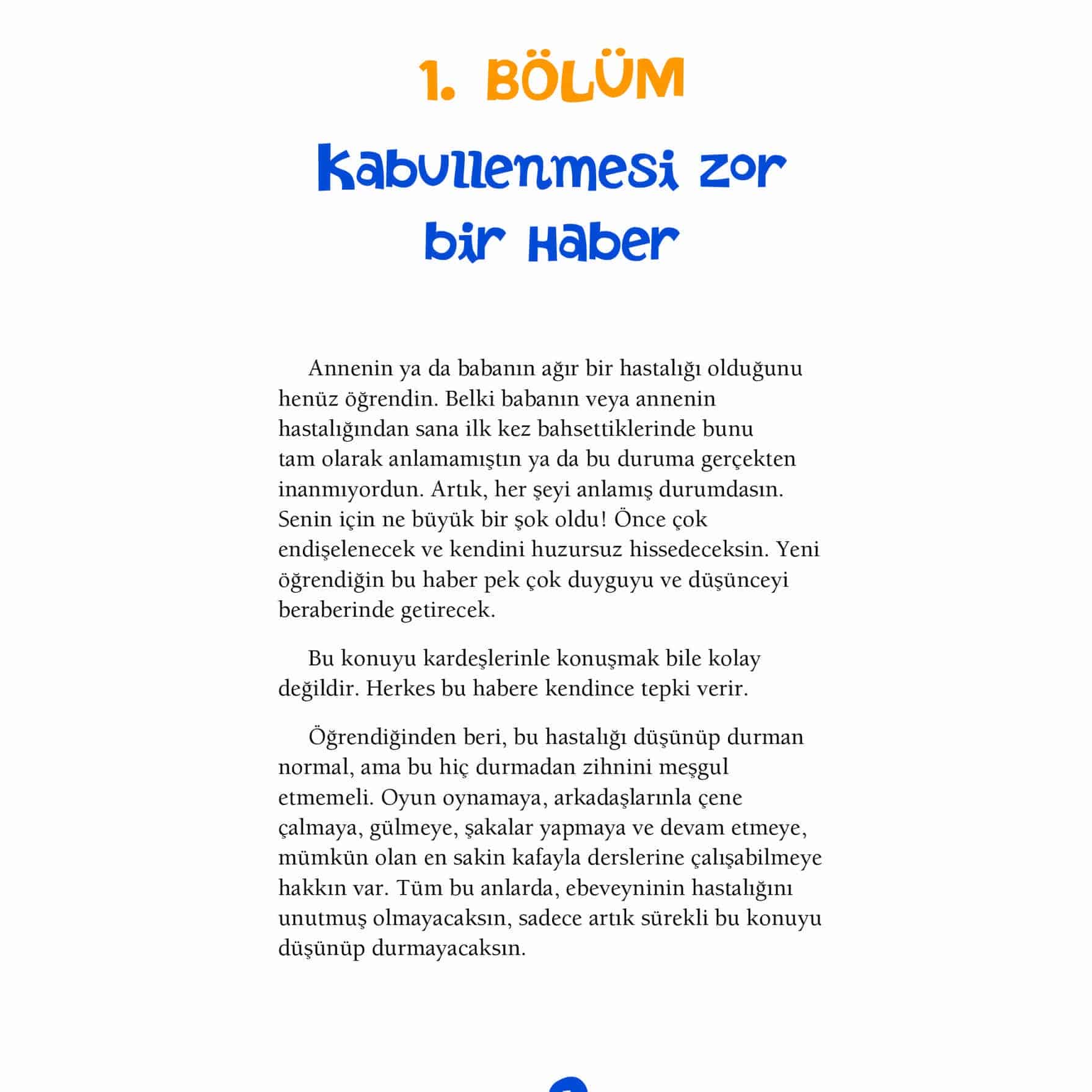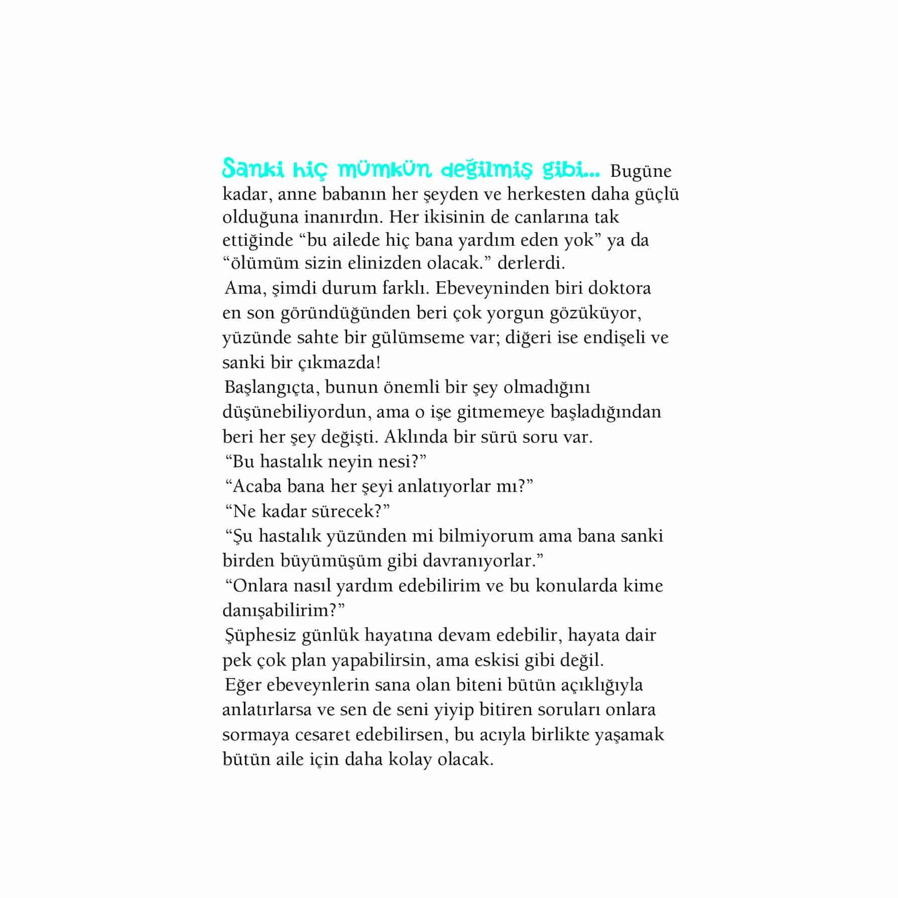 Anne babanın başına bir şey gelebileceğini aklından bile geçirmezsin. Oysa gün gelir adıyla herkese korku salan bir hastalığa yakalanıverirler. Ailen seninle tüm olup biteni rahatlıkla konuşamayabilir ve sen de tüm bu sorunların arasında yolunu kaybedebilir, kendine hiç durmadan sorular sorup endişelere kapılabilirsin. Elinde tuttuğun bu kitap sana tavsiyelerde bulunmak, içinde bulunduğun durumu kavramana ve ailenle birlikte bu sorunun üstesinden gelmene yardımcı olmak için hazırlandı.
