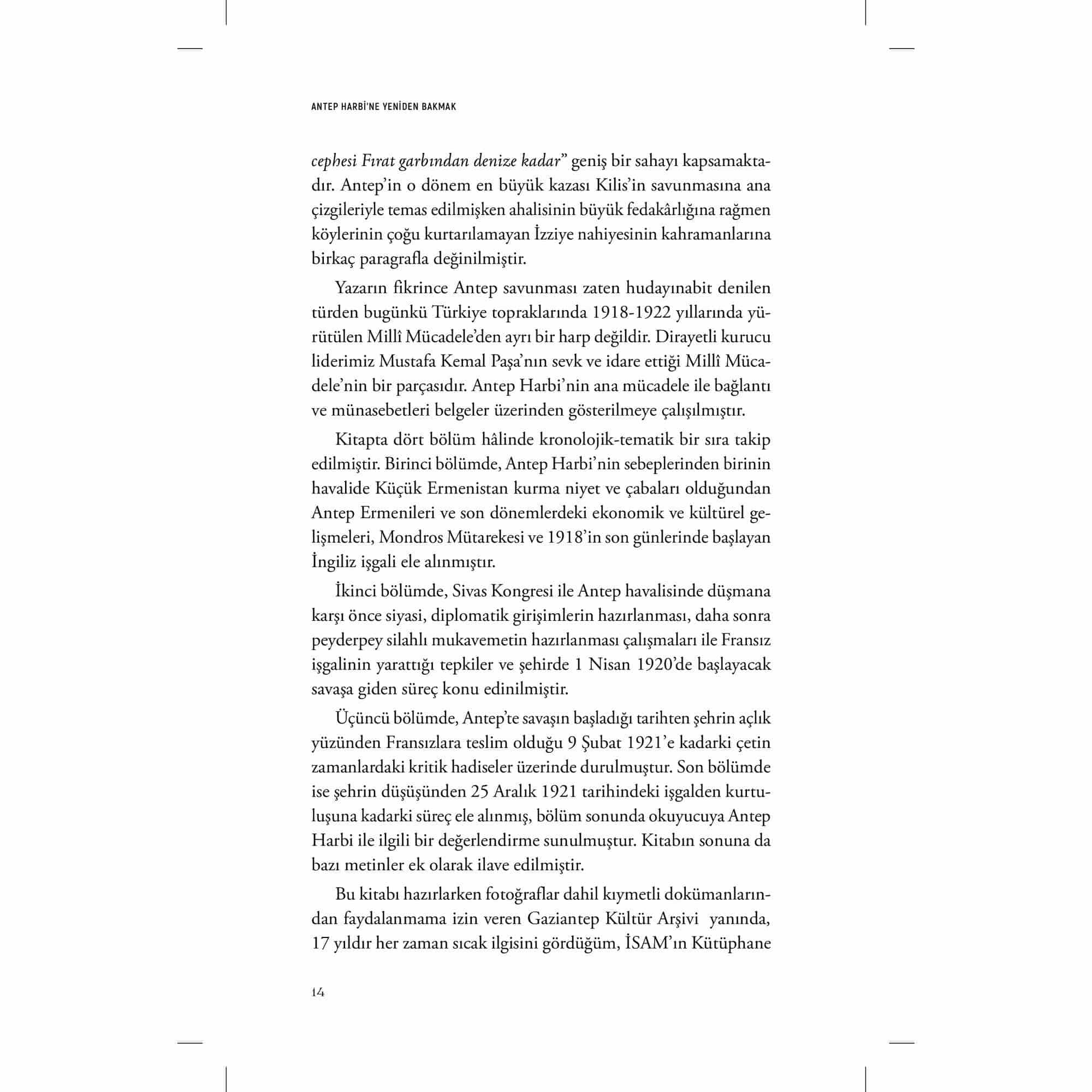 Antep savunması her kesimden halkın fedakârlığı ile Mustafa Kemal Paşa liderliğindeki Millî Mücadele’nin bir parçası olarak başarıyla sevk ve idare edilmiştir. Şehrin açlık ve ikmâlsizlik yüzünden tesliminden önce düşman kuşatmasını parçalayarak yapılan “huruç” dahi nizami birliklerin komuta kontrol ve desteğinde başarılmıştır. Huruç girişimlerinde şehir dışındaki nizami birliklerin bir gece içinde üç tabur komutanını şehit vermeleri de bunu göstermektedir. Antep mücadelesi ağırlıklı olarak şehir halkının “seferberlik”te ateşle imtihandan geçmiş ihtiyat zabitleri ile erbaş ve erlerinin kahramanlığının eseridir. Ancak mücavir sahadan Kilis, Maraş, Malatya gibi şehirlerden gelen muharip unsurlar ve sağlanan maddi destek de önemlidir. Dahası harbi yürüten “Heyet-i Merkeziye”nin çabaları ile Fransız ordusundaki Senegal, Cezayir ve Tunus gibi coğrafyalardan toplanan Müslüman askerlerin bir kısmı mücahit Türk kardeşlerine katılmıştır. Bunlardan bazıları da yaralanmıştır. Diğer taraftan Antep savunması sadece Fransızlara karşı değil bölgede azınlık bir nüfusla “Küçük Ermenistan” kurma hevesine kapılan Ermenilere karşı da yapılmıştır. Sonuçta işgal ordusu söz ve desteğine bel bağlayan Ermeniler kaybetmiş, yüzlerce yıldır yaşadıkları Antep toprağından silinmişlerdir. Prof. Dr. Hasip Saygılı, Antep Harbi’ne Yeniden Bakmak adını verdiği kitabını hazırlarken, bilinen Türk kaynakları kullanmakla yetinmeyip İngilizce ve Fransızca erişilebilen Batılı ve Ermeni kaynaklardan da istifade etmiştir.