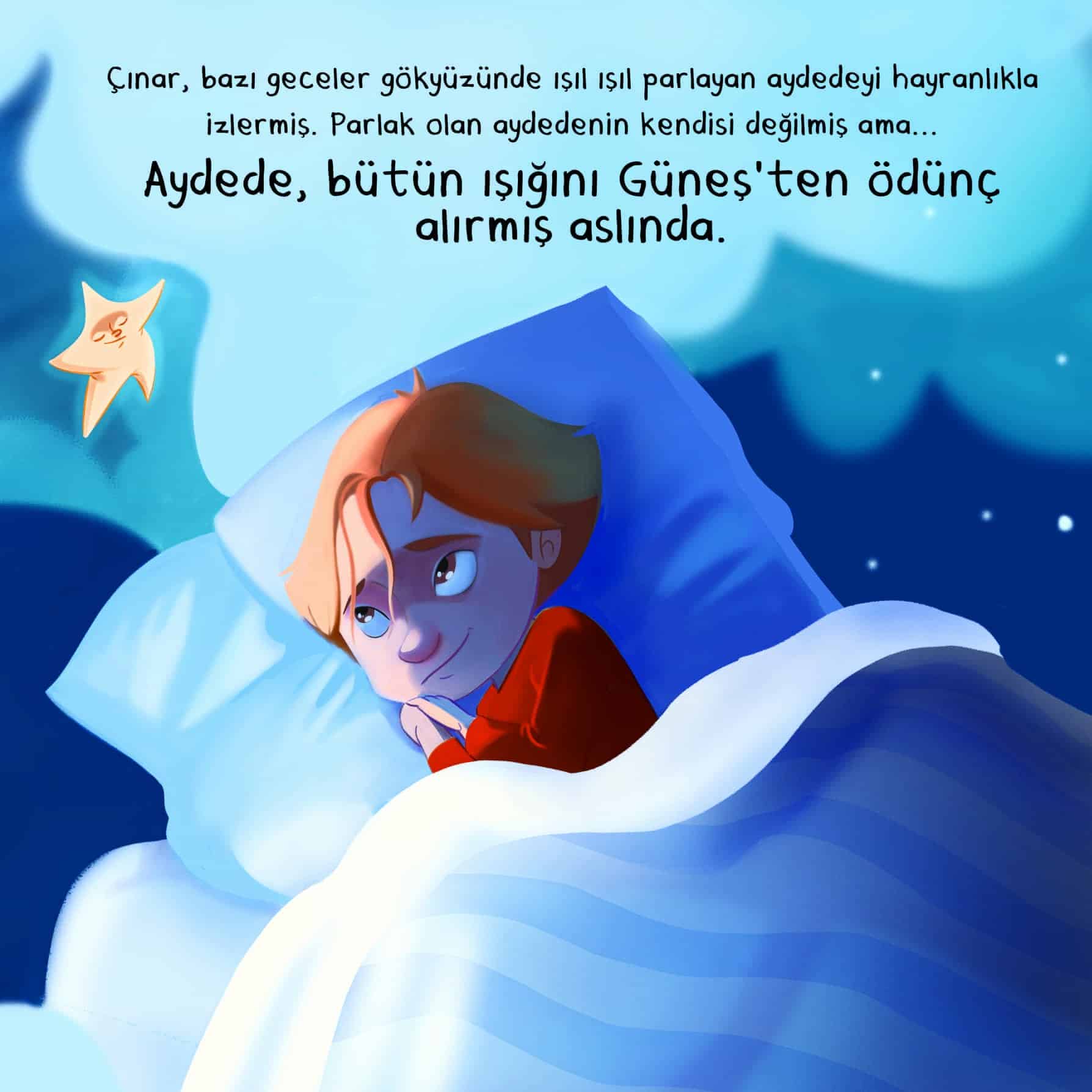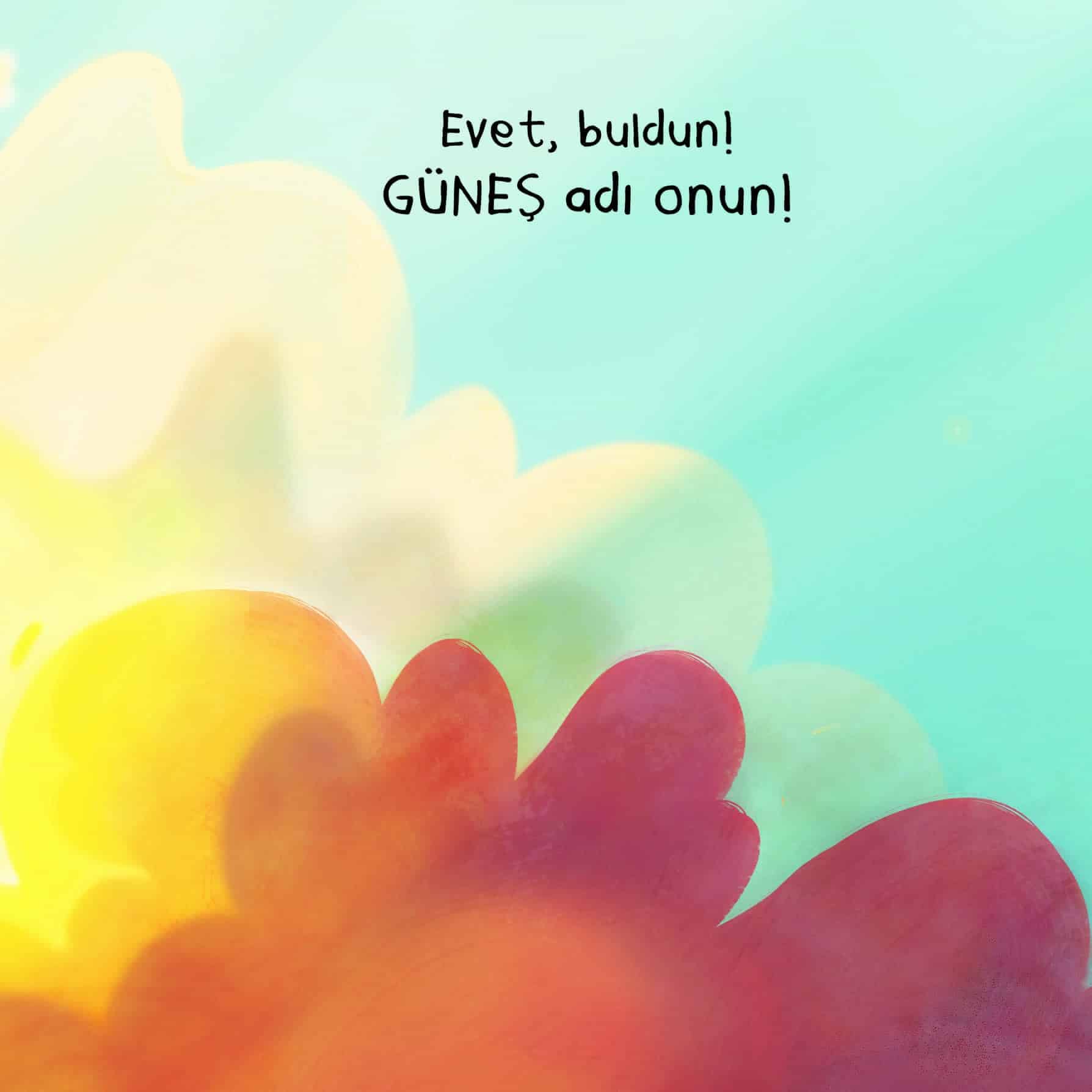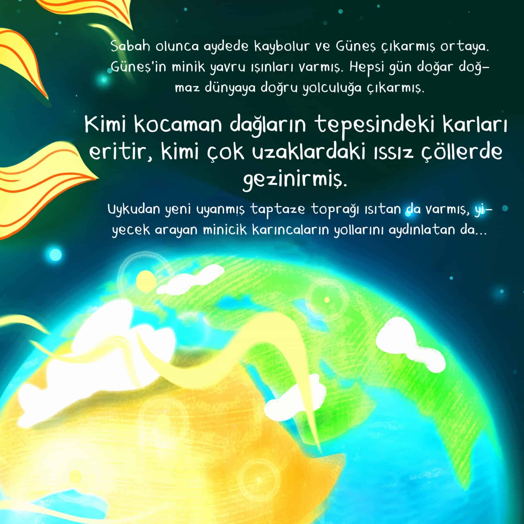 Çınar, her gece gökyüzünde gördüğü aydedeyi hayranlıkla izliyordu. Merak ediyordu aydedenin nasıl bu kadar parlak olduğunu, bahçede onu takip eden hatta aynı kendisi gibi olan siyah çocuğu, bir yağmur damlasında nasıl bu kadar renk bulunduğunu… Ve sonunda anladı. Güneş’ti tüm bunları yapan… Arkadaşım Güneş, doğa ve doğa olaylarına karşı çocuklarda farkındalık oluşturan, merak dolu, sımsıcak bir hikâye…