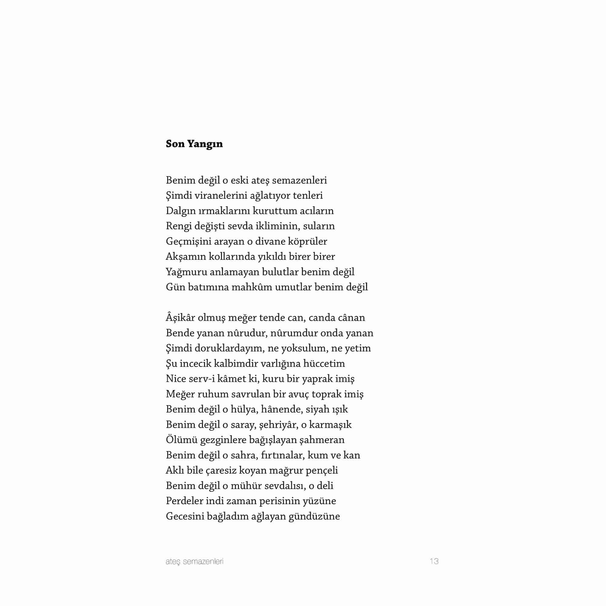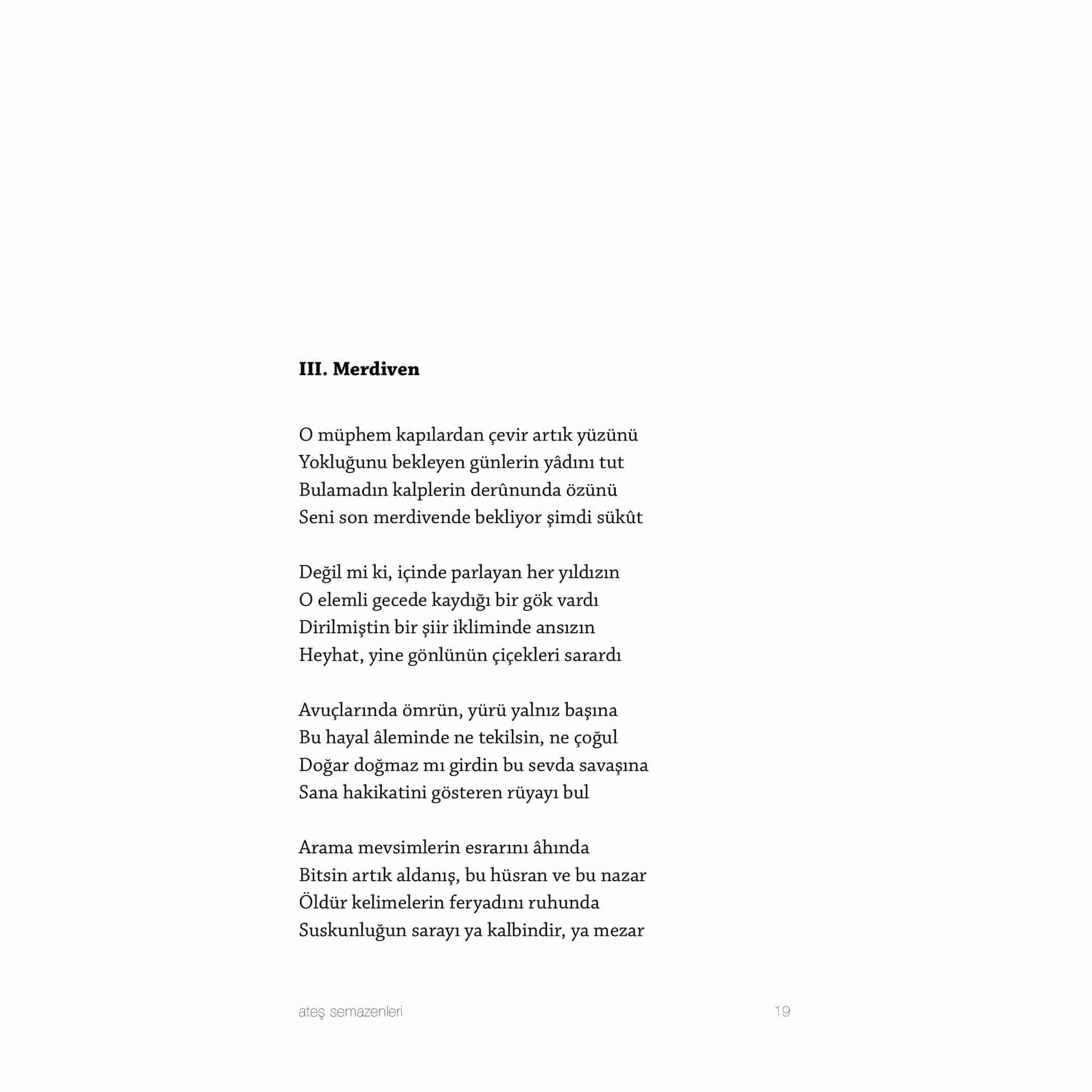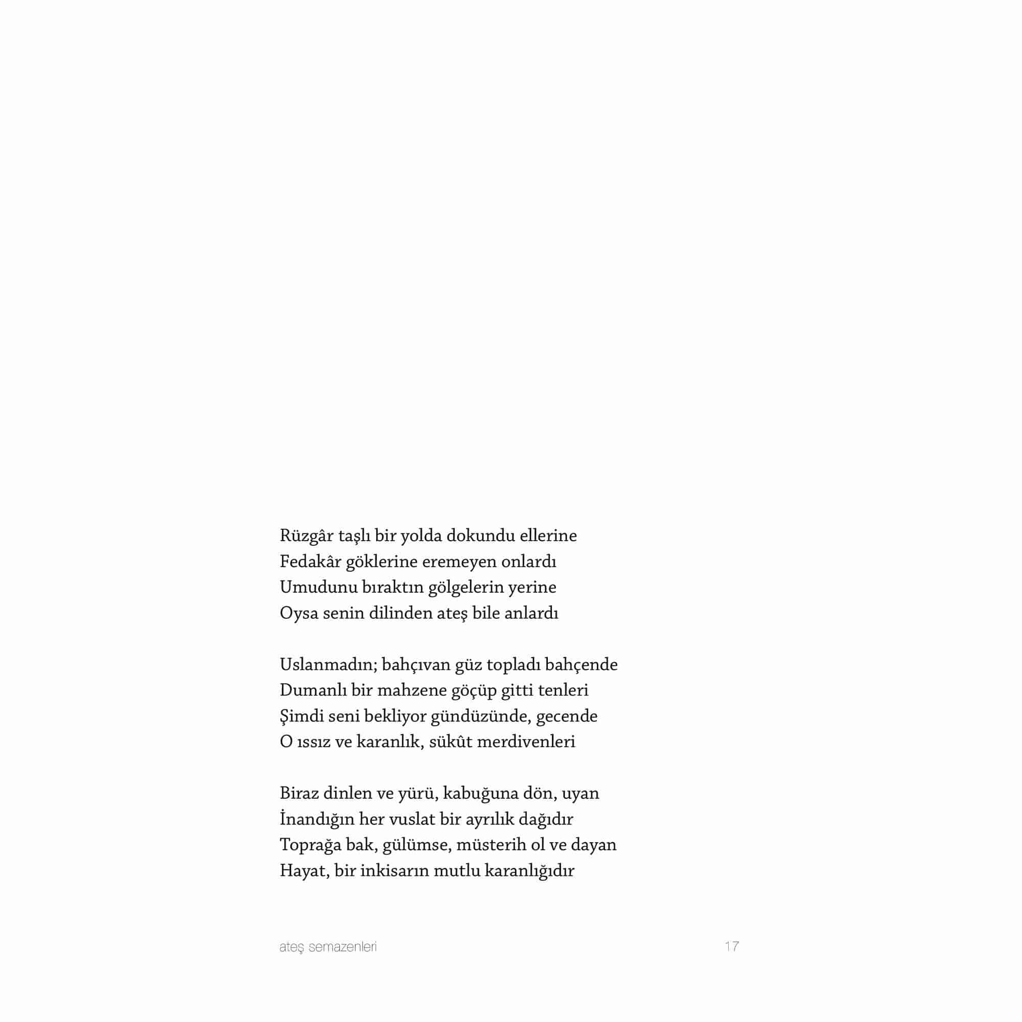 Söz, incinin mercanla buluştuğu derinliktir. Yürek bir tahtırevan, sessizlik ve serinlik… Kalem ise son limanıdır deniz fenerlerinin. Nilüferler büyümüştür içinde her birinin… Usta şair Nurullah Genç’in bu kitabında, söz sahilinde umut savrulacak kum gibi… Şiir ise binbir yerinden çatlamıştır, tohum gibi… Ateş Semazenleri, kâğıtla kalemin umut, hüzün ve aşk dolu son dansıdır… Her sabah o karanlık ufuklardan yürüyüp Her akşam yeryüzüne bir güneşle döndüler Kâh bir gece yarısı yıldızları bürüyüp Dumanlı aynalarda ansızın göründüler Bir kıvılcımla rüzgâr alıp götürdü bizden Şimdi dağlar ardında gülümsüyor tenleri Bir gün çıkıp gelirler belki de bir denizden O nehir sevdalılar, ateş semazenleri