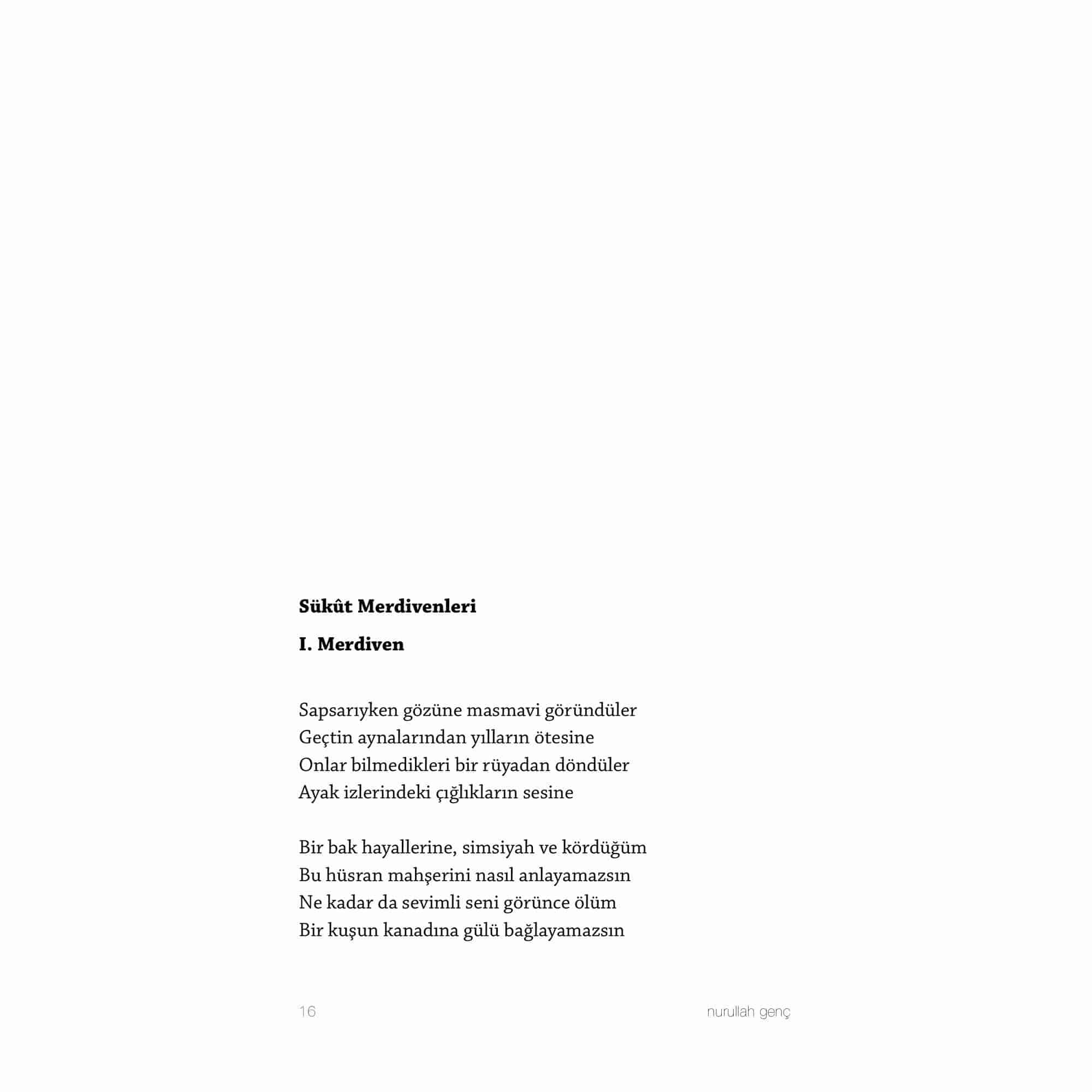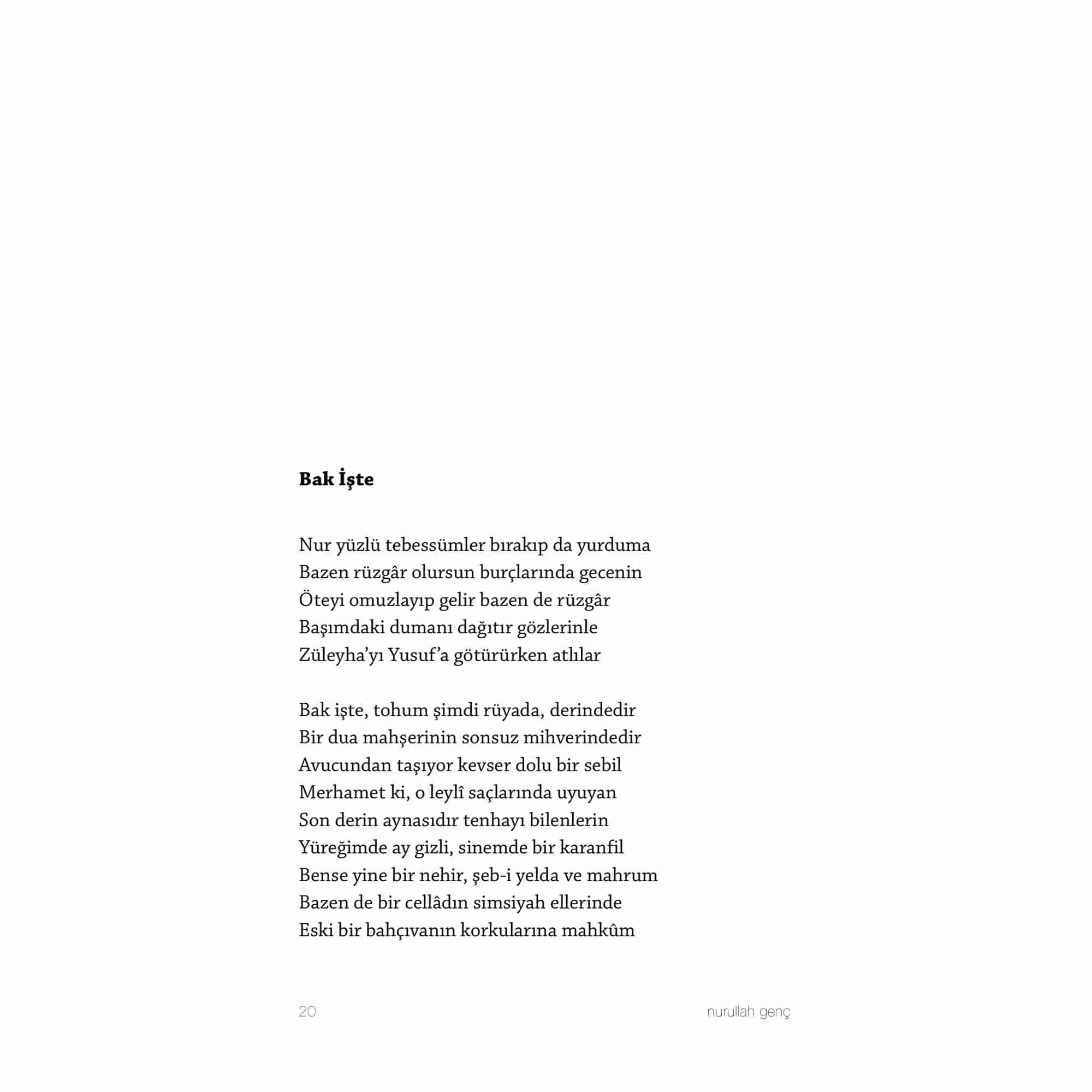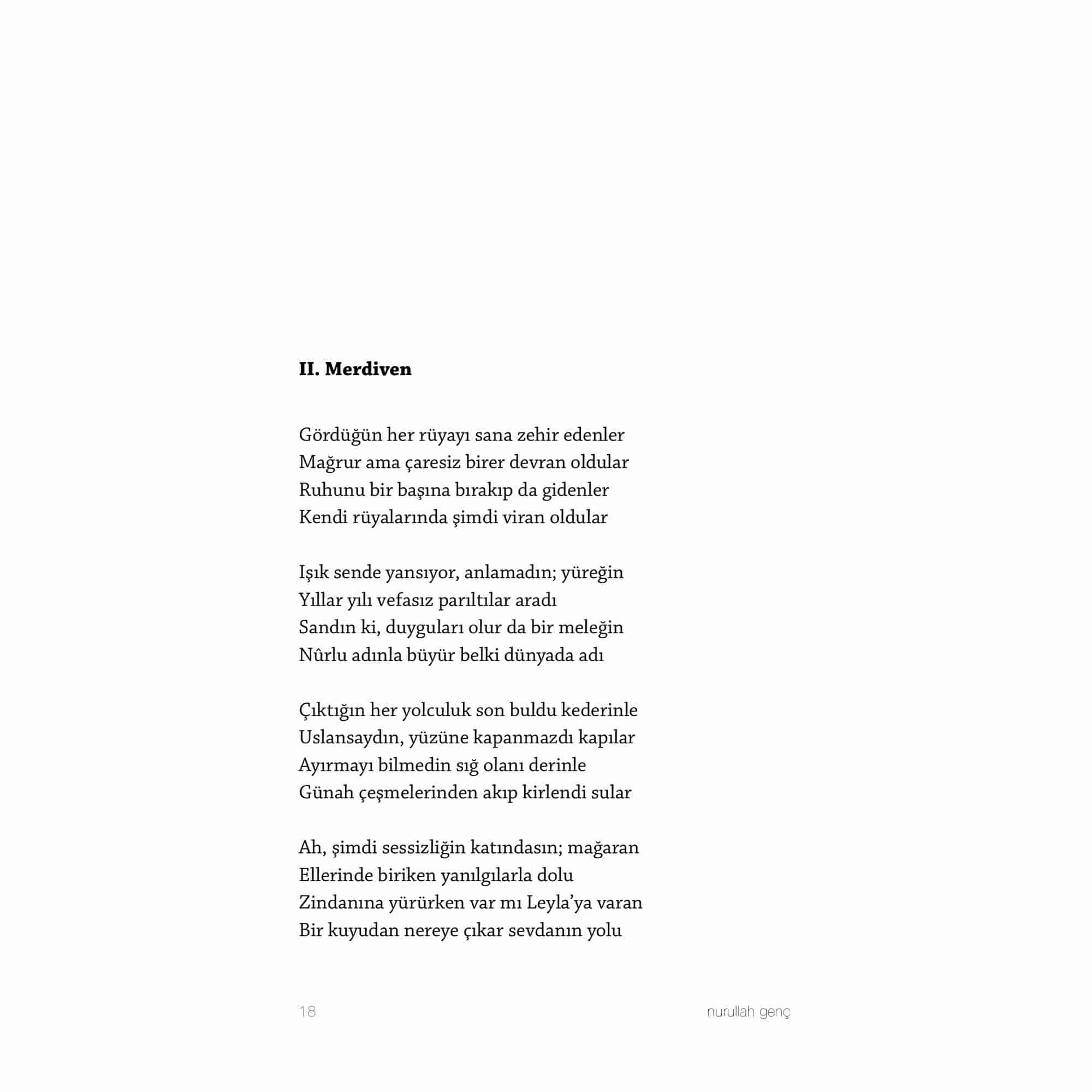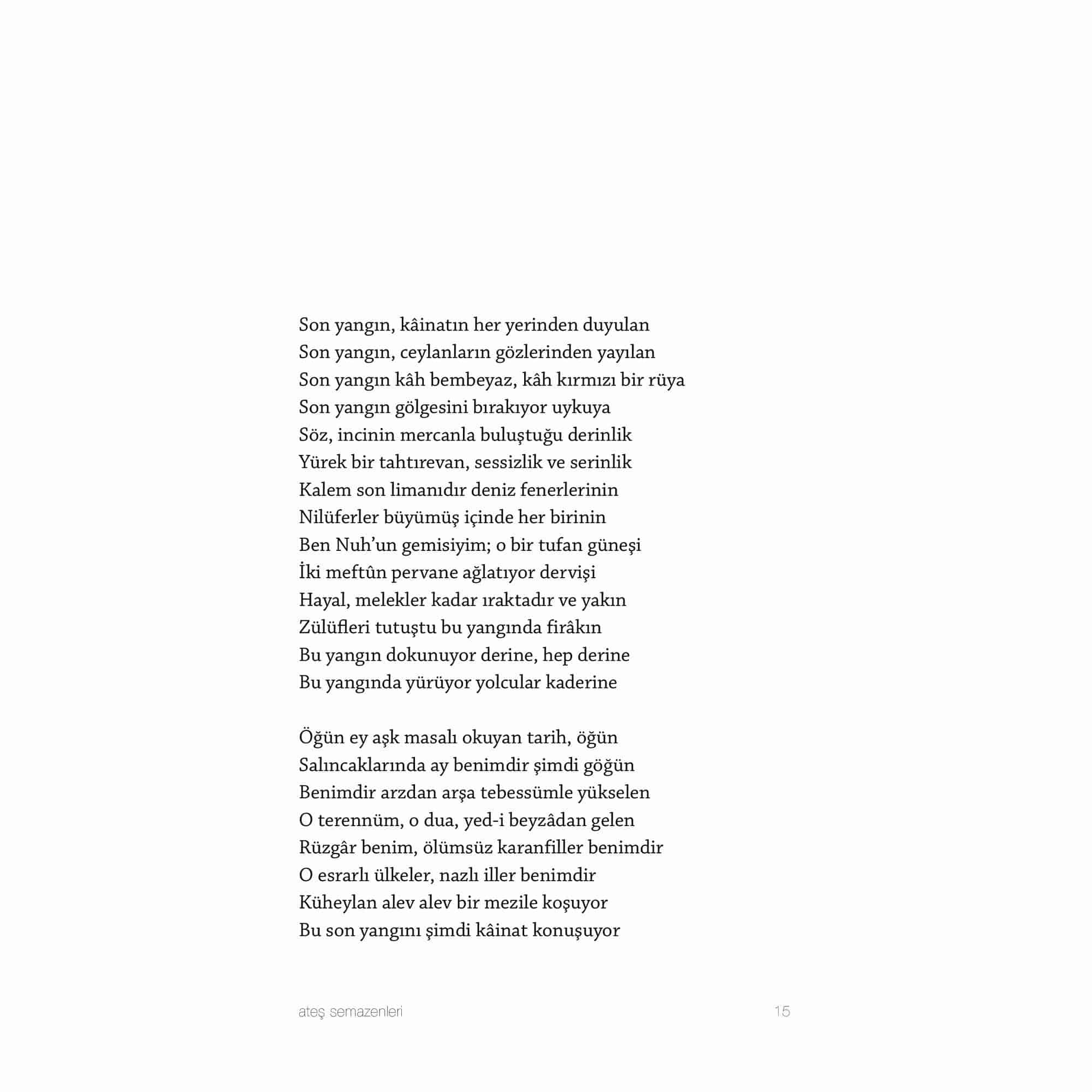 Söz, incinin mercanla buluştuğu derinliktir. Yürek bir tahtırevan, sessizlik ve serinlik… Kalem ise son limanıdır deniz fenerlerinin. Nilüferler büyümüştür içinde her birinin… Usta şair Nurullah Genç’in bu kitabında, söz sahilinde umut savrulacak kum gibi… Şiir ise binbir yerinden çatlamıştır, tohum gibi… Ateş Semazenleri, kâğıtla kalemin umut, hüzün ve aşk dolu son dansıdır… Her sabah o karanlık ufuklardan yürüyüp Her akşam yeryüzüne bir güneşle döndüler Kâh bir gece yarısı yıldızları bürüyüp Dumanlı aynalarda ansızın göründüler Bir kıvılcımla rüzgâr alıp götürdü bizden Şimdi dağlar ardında gülümsüyor tenleri Bir gün çıkıp gelirler belki de bir denizden O nehir sevdalılar, ateş semazenleri