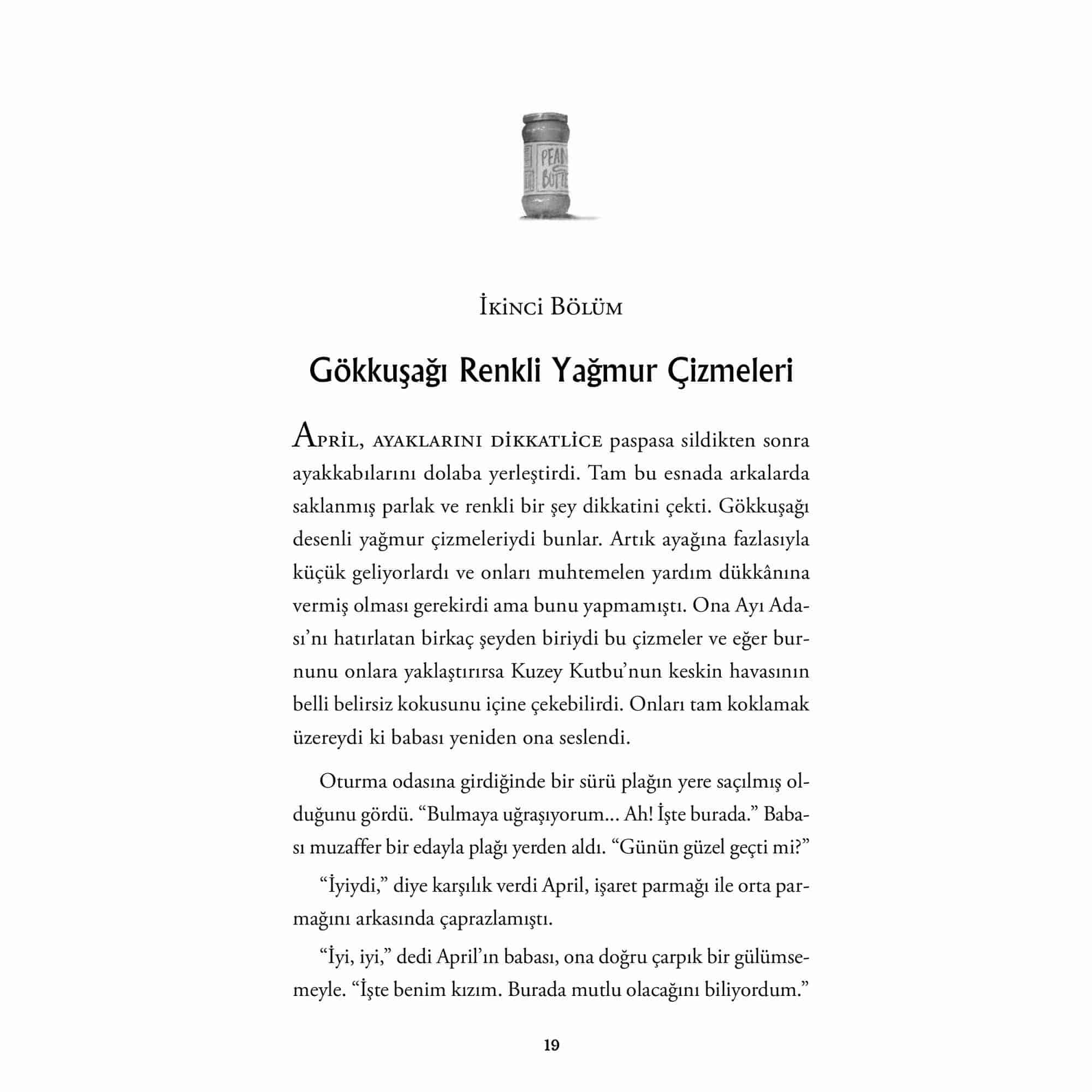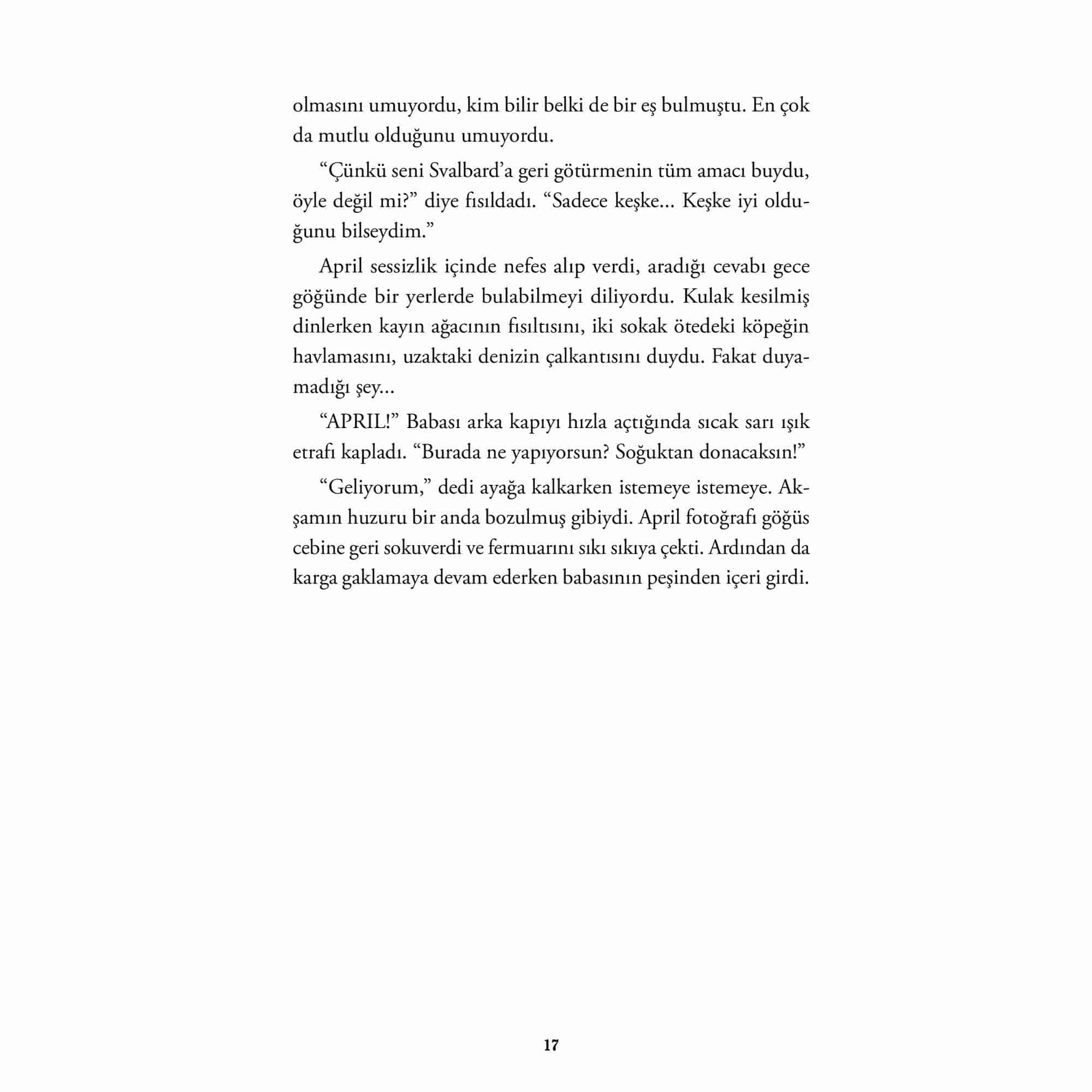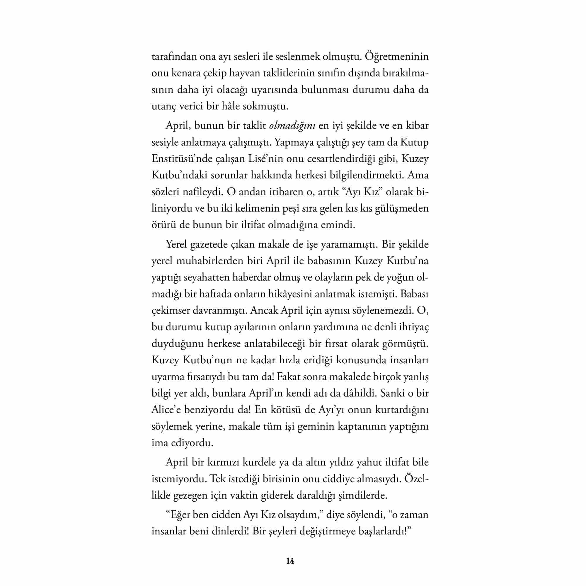 Ayı, yavaşça yana çekildi. Ve orada, mağaranın görünmeyen derinliklerinden dört dengesiz pençe üzerinde sallanan küçük bir kutup ayısı yavrusu çıktı. April, Ayı Adası’ndan döneli bir yıldan fazla olsa da, Ayı hakkında düşünmeyi hâlâ sürdürüyordu. Svalbard’da bir ayının vurulup yaralandığını duyduğu zaman, o ayının kendi ayısı olduğundan emindi. Yapması gerekenin ne olduğunu biliyordu: Babasını ikna etmeli ve kutuplarda Ayı’yı aramaya çıkmalıydı. Bütün engellere rağmen bunu başarınca, April kendisini yine buz gibi bir maceranın içinde buldu.