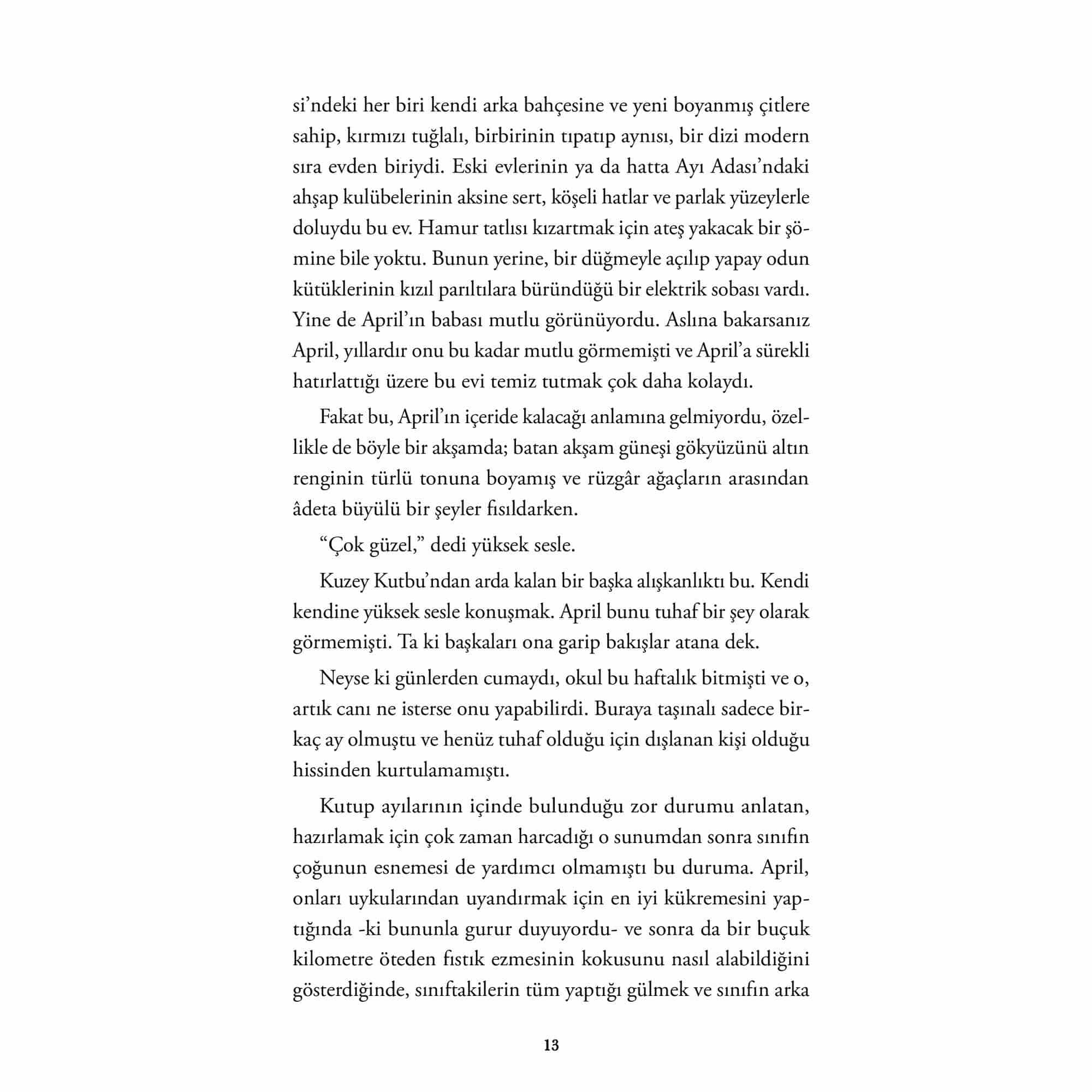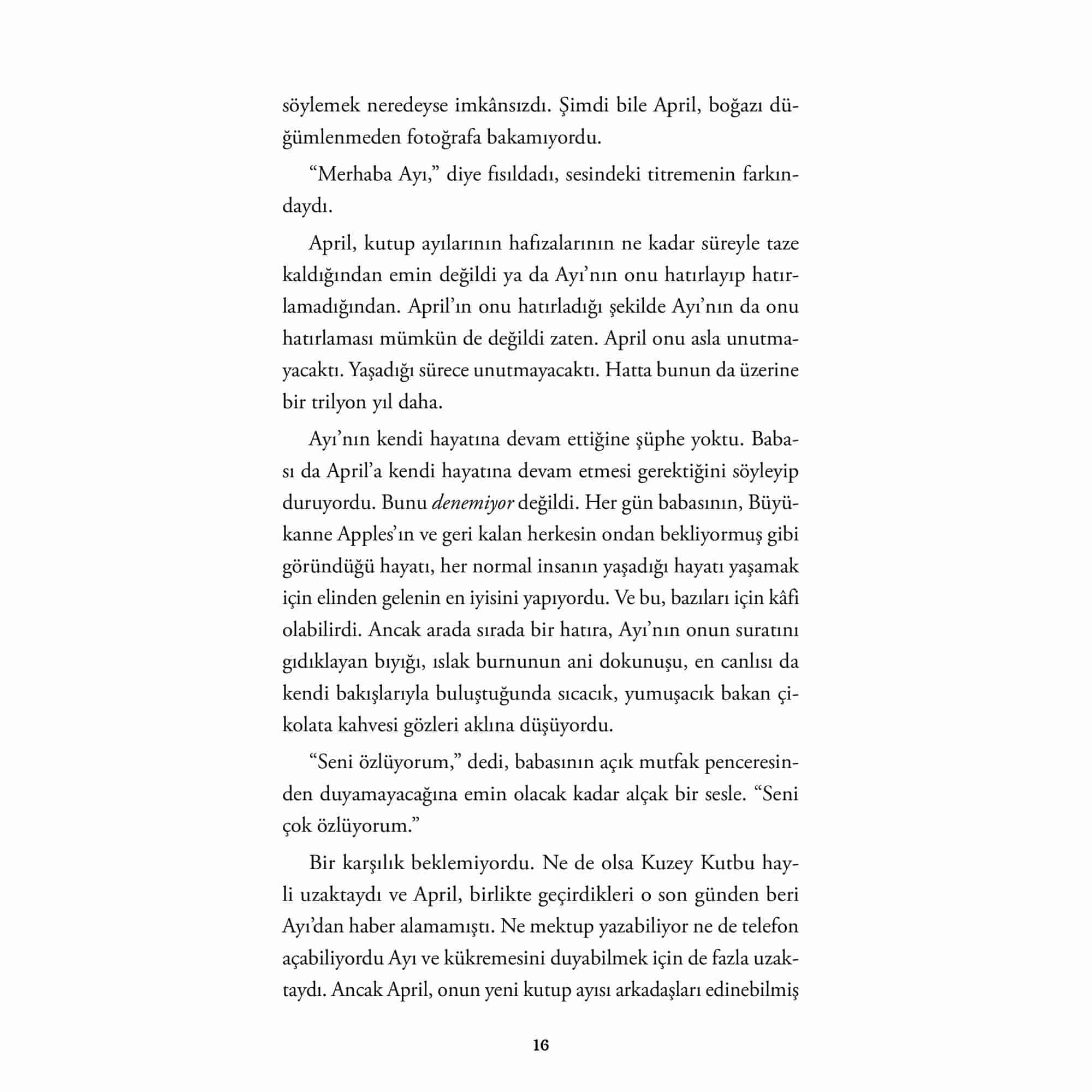 Ayı, yavaşça yana çekildi. Ve orada, mağaranın görünmeyen derinliklerinden dört dengesiz pençe üzerinde sallanan küçük bir kutup ayısı yavrusu çıktı. April, Ayı Adası’ndan döneli bir yıldan fazla olsa da, Ayı hakkında düşünmeyi hâlâ sürdürüyordu. Svalbard’da bir ayının vurulup yaralandığını duyduğu zaman, o ayının kendi ayısı olduğundan emindi. Yapması gerekenin ne olduğunu biliyordu: Babasını ikna etmeli ve kutuplarda Ayı’yı aramaya çıkmalıydı. Bütün engellere rağmen bunu başarınca, April kendisini yine buz gibi bir maceranın içinde buldu.