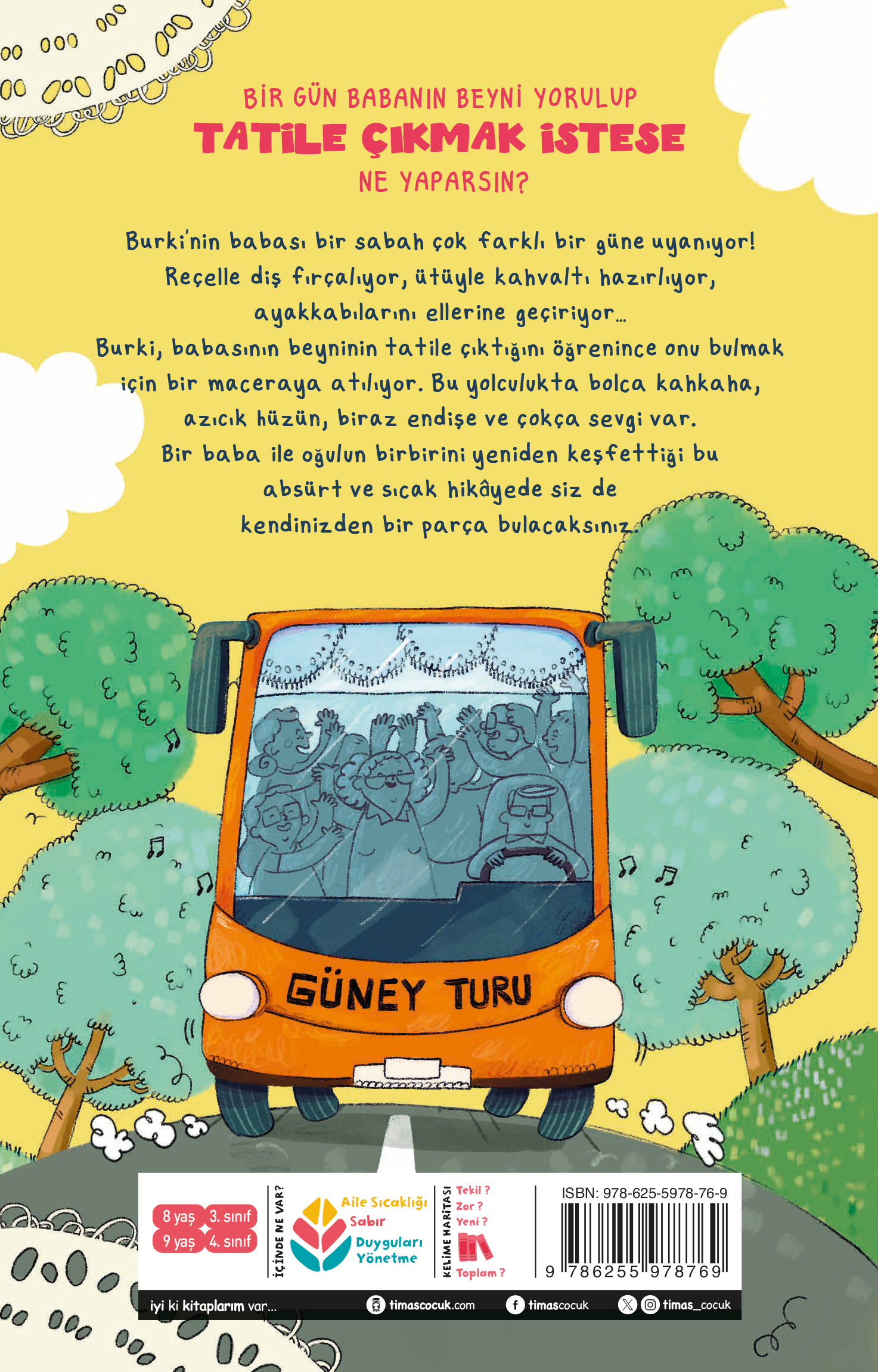 Bir gün babanın beyni yorulup tatile çıkmak istese ne yaparsın? Burki'nin babası bir sabah çok farklı bir güne uyanıyor! Reçelle diş fırçalıyor, ütüyle kahvaltı hazırlıyor, ayakkabılarını ellerine geçiriyor... Burki, babasının beyninin tatile çıktığını öğrenince onu bulmak için bir maceraya atılıyor. Bu yolculukta bolca kahkaha, azıcık hüzün, [...]
