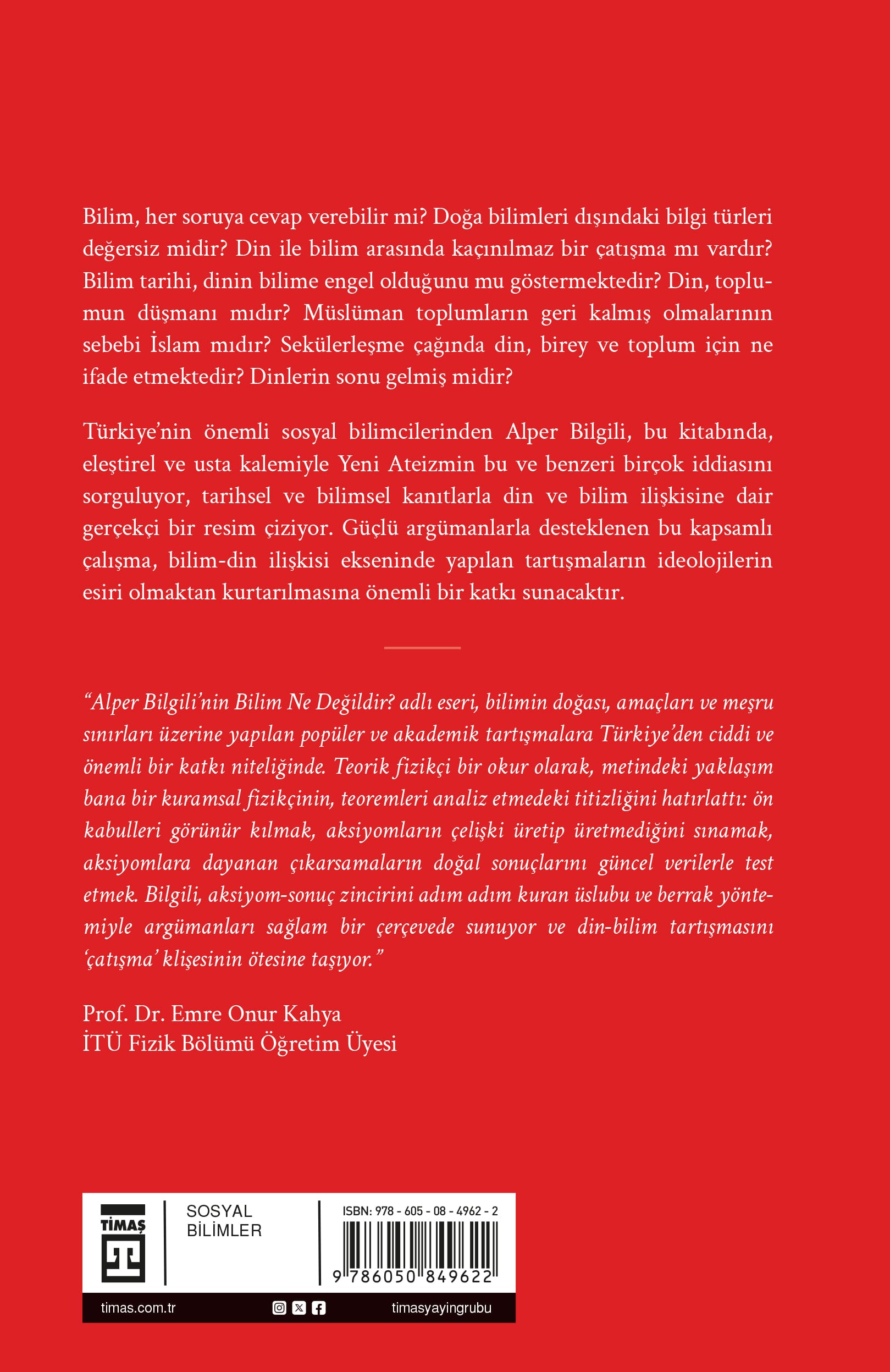 Bilim, her soruya cevap verebilir mi? Doğa bilimleri dışındaki bilgi türleri değersiz midir? Din ile bilim arasında kaçınılmaz bir çatışma mı vardır? Bilim tarihi, dinin bilime engel olduğunu mu göstermektedir? Din, toplumun düşmanı mıdır? Müslüman toplumların geri kalmış olmalarının sebebi İslam mıdır? Sekülerleşme çağında din, birey ve toplum için ne ifade etmektedir? Dinlerin sonu gelmiş midir? Türkiye’nin önemli sosyal bilimcilerinden Alper Bilgili, bu kitabında, eleştirel ve usta kalemiyle Yeni Ateizmin bu ve benzeri birçok iddiasını sorguluyor, tarihsel ve bilimsel kanıtlarla din ve bilim ilişkisine dair gerçekçi bir resim çiziyor. Güçlü argümanlarla desteklenen bu kapsamlı çalışma, bilim-din ilişkisi ekseninde yapılan tartışmaların ideolojilerin esiri olmaktan kurtarılmasına önemli bir katkı sunacaktır. “Alper Bilgili’nin Bilim Ne Değildir? adlı eseri, bilimin doğası, amaçları ve meşru sınırları üzerine yapılan popüler ve akademik tartışmalara Türkiye’den ciddi ve önemli bir katkı niteliğinde. Teorik fizikçi bir okur olarak, metindeki yaklaşım bana bir kuramsal fizikçinin, teoremleri analiz etmedeki titizliğini hatırlattı: ön kabulleri görünür kılmak, bu aksiyomların çelişki üretip üretmediğini sınamak, aksiyomlara dayanan çıkarsamaların doğal sonuçlarını güncel verilerle test etmek. Bilgili, aksiyom-sonuç zincirini adım adım kuran üslubu ve berrak yöntemiyle argümanları sağlam bir çerçevede sunuyor ve din-bilim tartışmasını ‘çatışma’ klişesinin ötesine taşıyor.” Prof. Dr. Emre Onur Kahya İTÜ Fizik Bölümü Öğretim Üyesi