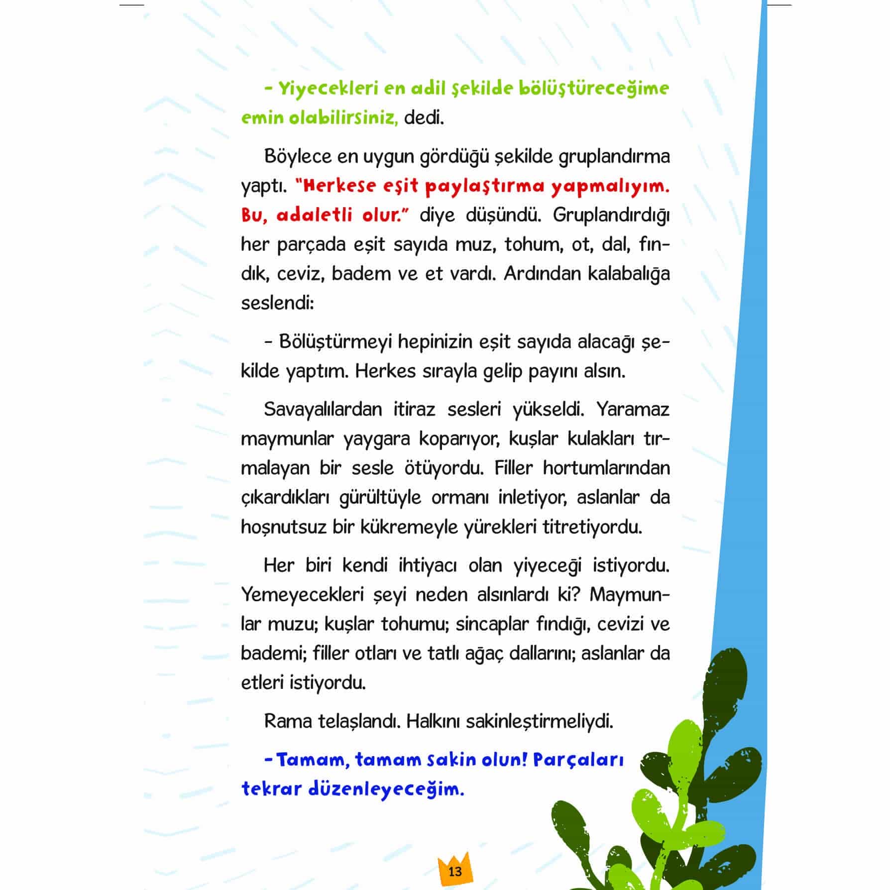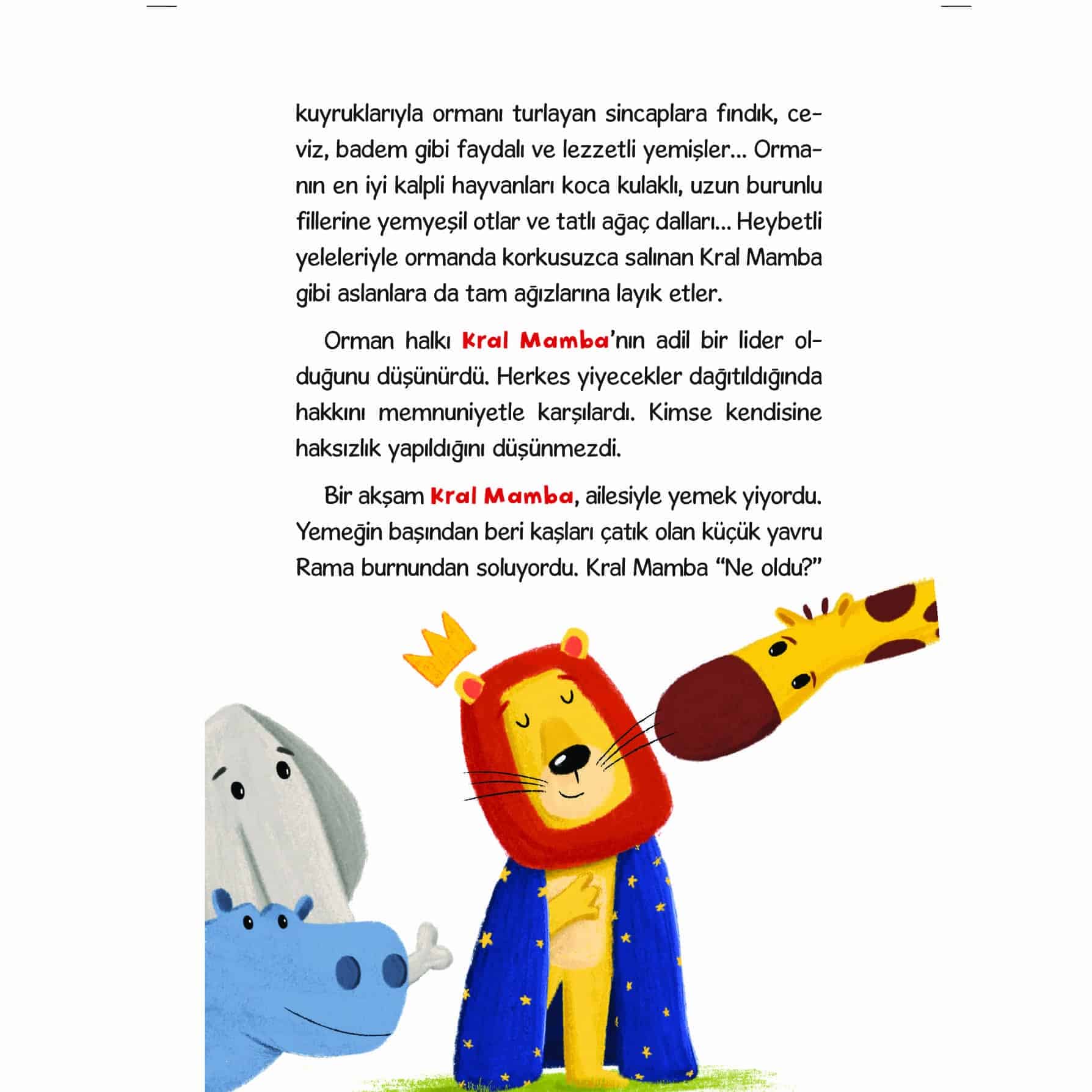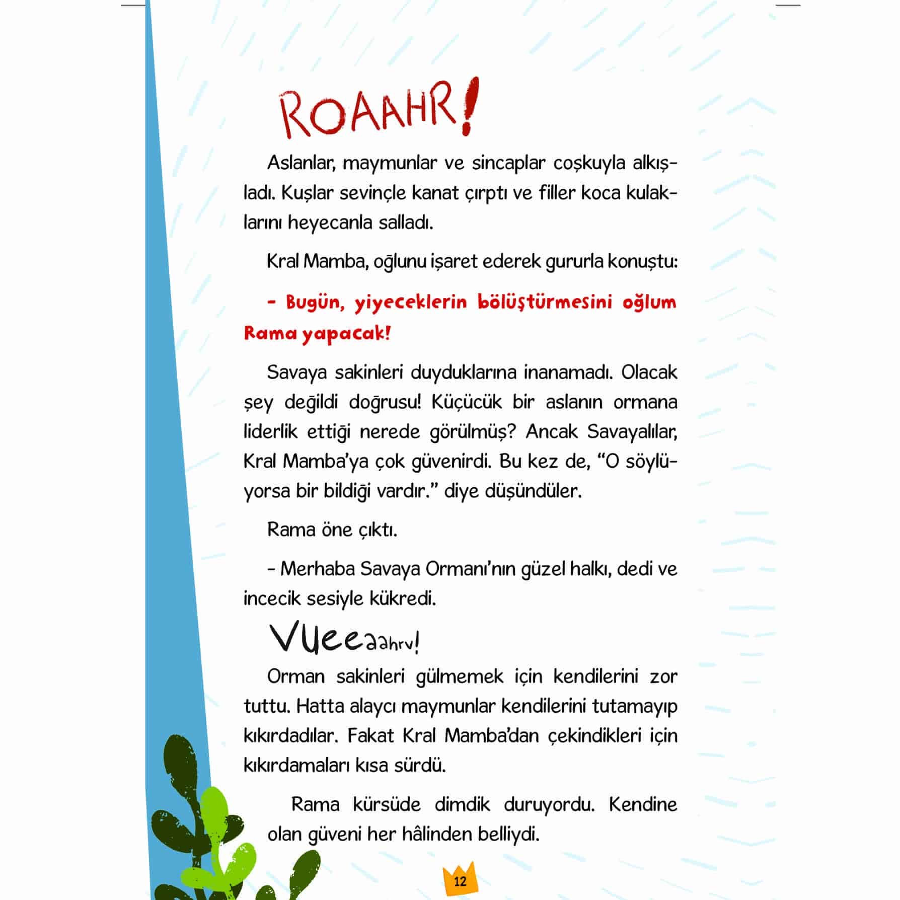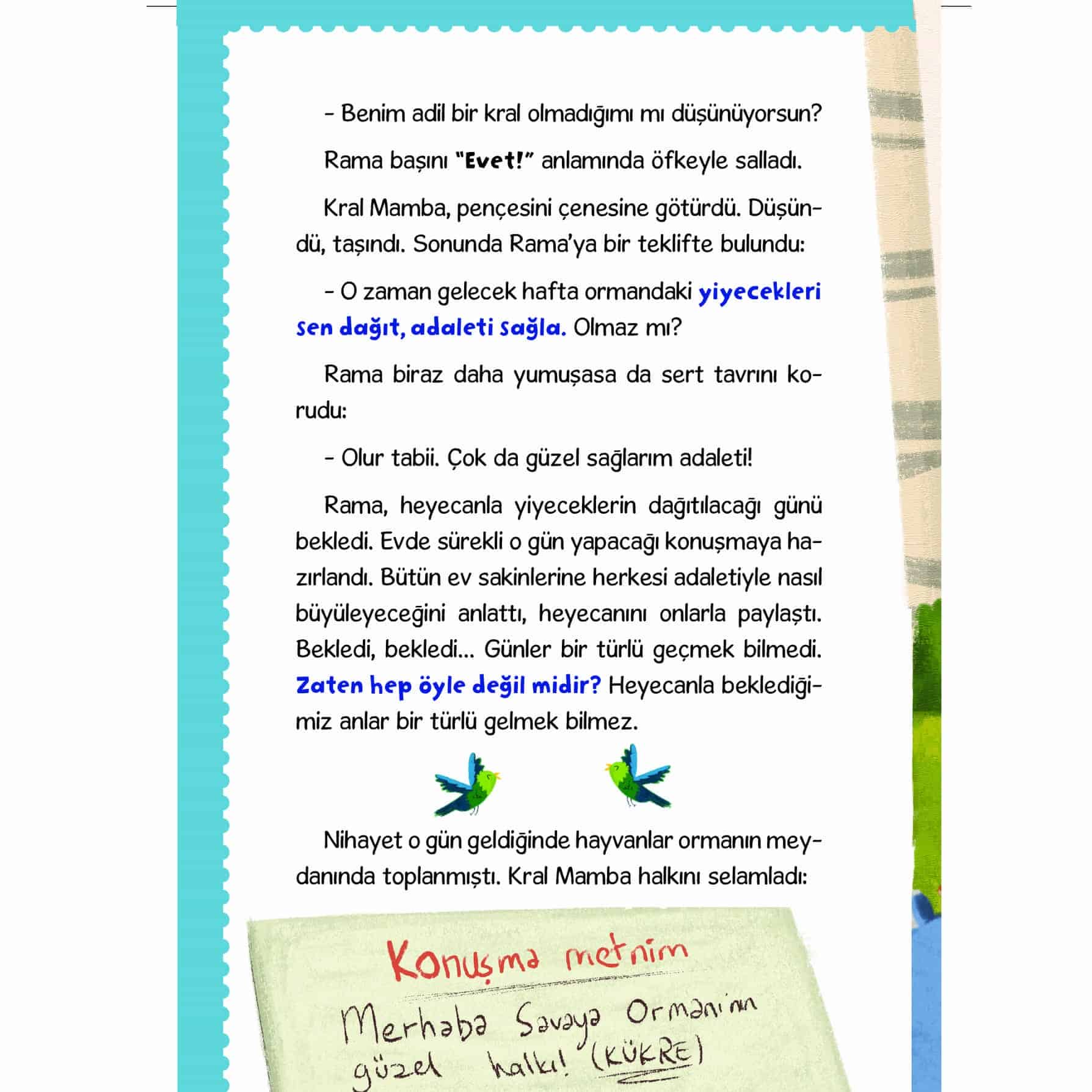 Kitapta adalet ve eşitlik gibi hassas kavramlar, empati gibi önemli duygularla birleştirilerek veriliyor. Böylece kavramlar sadece bilgi olarak değil, hayatta pratik karşılığı olan duygusal yönleriyle de sunuluyor. Ayrıca bu kitaptaki başkarakterin sorumluluk bilinci olan bir yavru aslan olması ve kritik noktalarda önemli görevler alması, okuyucuyu sorumluluk alma noktasında yüreklendirici etki uyandırıyor. Problem çözme, dayanışma, liderlik, hatalardan ders alma kitabın önemli kazanımlarından.