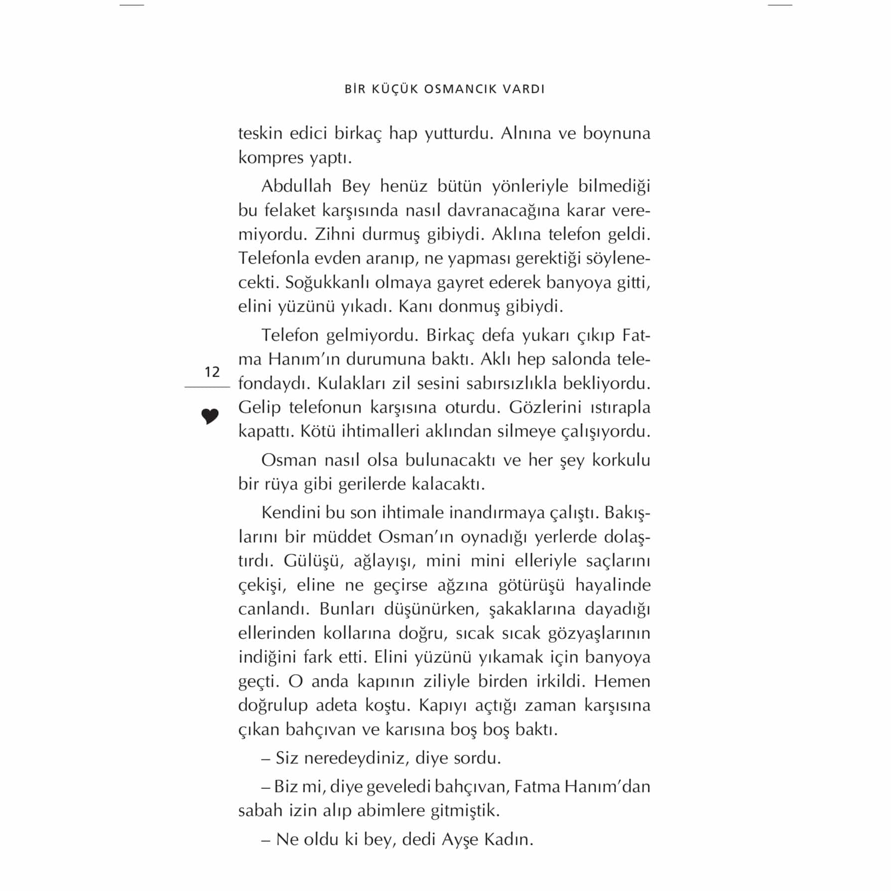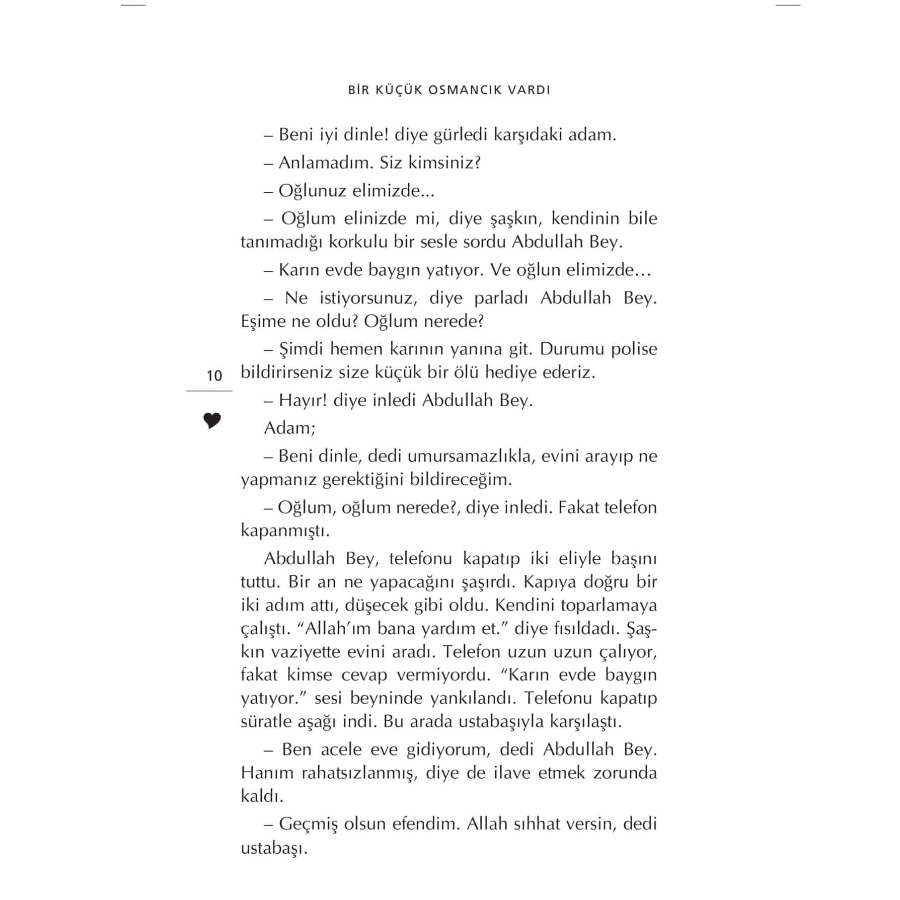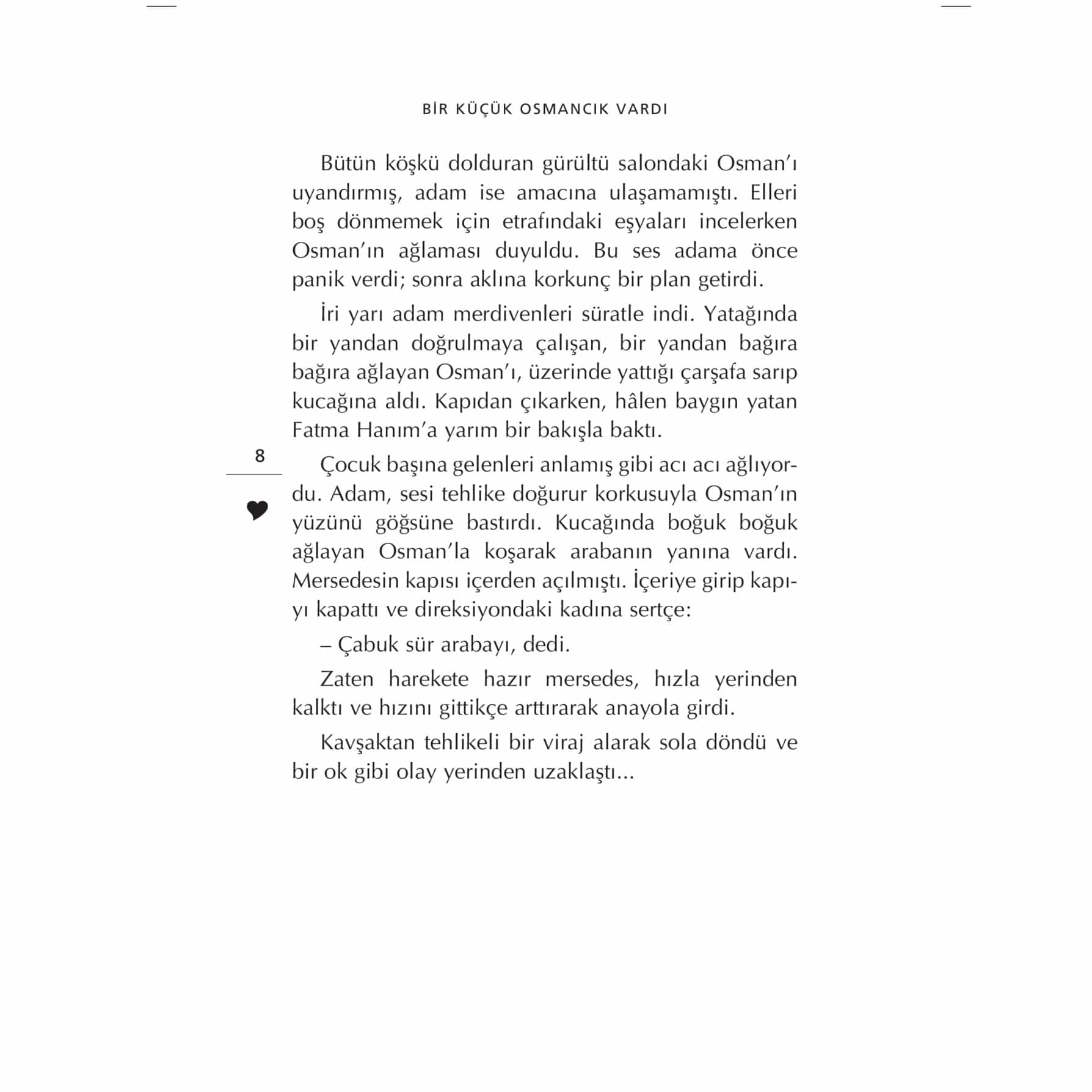 Osmancık, ailenin biricik çocuğudur. Kötü emellerine yenik düşmüş, gözlerini para hırsı bürümüş bir çete tarafından kaçırılır. Ailesi Osmancığın hayatından çok endişe etmektedir. Bir an evvel biricik yavrularına kavuşmak isterler ve bunun için ne gerekiyorsa yapmaya hazırdırlar. Fakat bunu yapmak o kadar kolay olacak mı?Masum ve korumasız bir çocuk olan Osmancık, onu çok seven ailesine kavuşabilecek mi?“Bir Küçük Osmancık Vardı” bir solukta okunacak heyecan dolu, duygu yüklü bir ilk gençlik romanı...