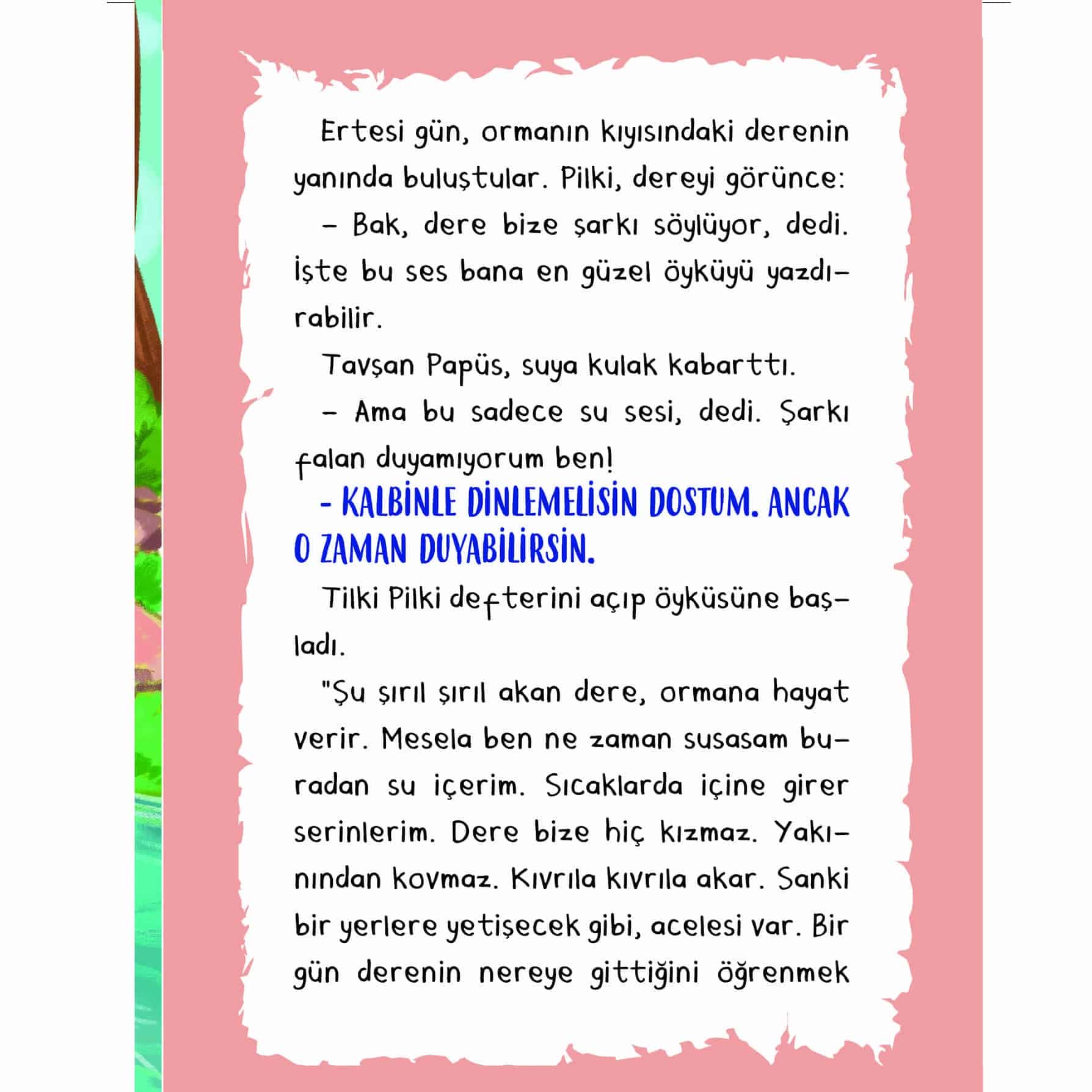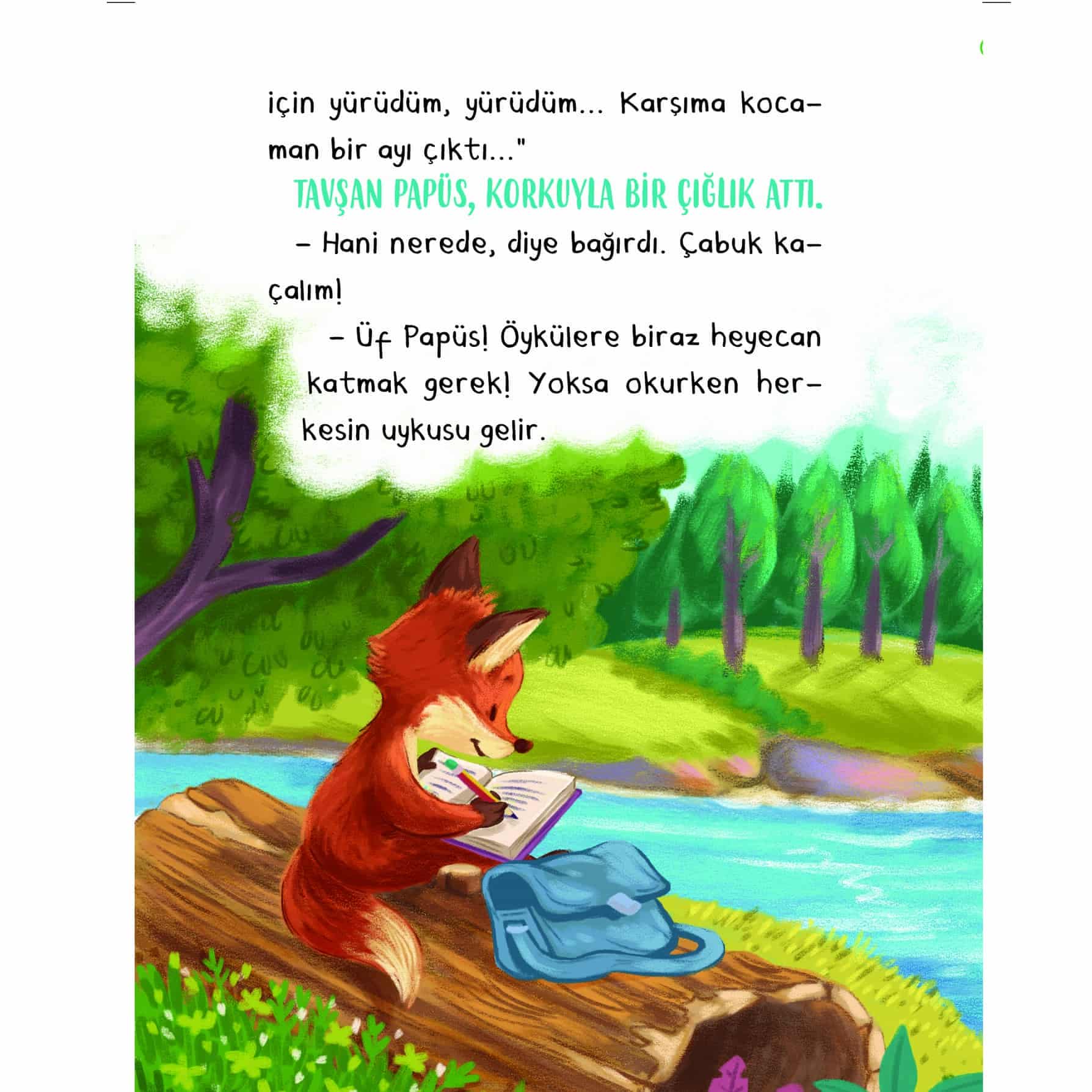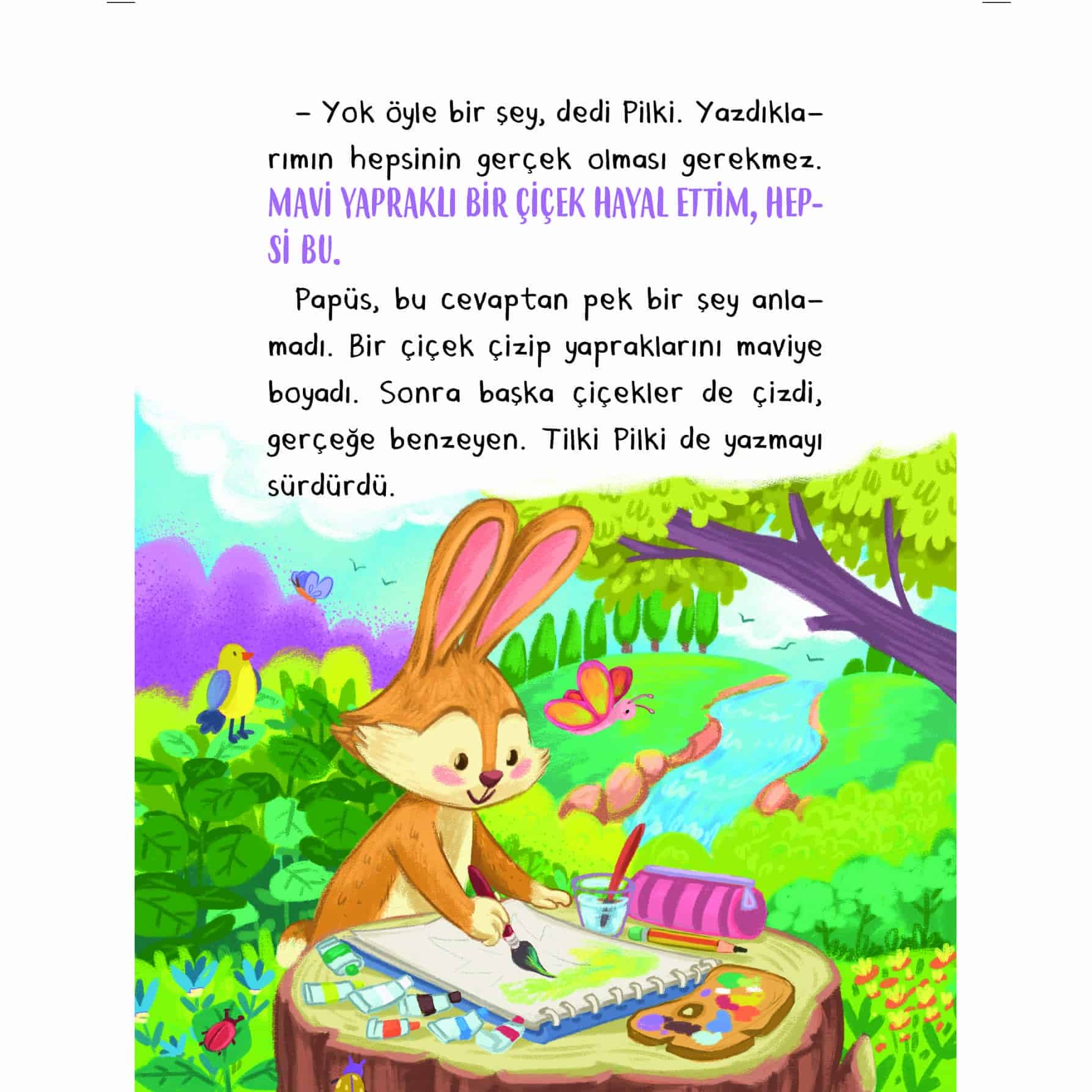 Tilki Pilki ve Tavşan Papüs ormanda yaşayan iki iyi arkadaştır. Tilki Pilki bir gün bir kitap yazmak ister. Fikrini Tavşan Papüs’e açar. Tavşan da bu kitabı resimleyebileceğini söyler. Böylece ormanı dolaşmaya başlarlar. Tilki Pilki ormanı, ağaçları, çiçekleri, dağı, güneşi, ayı, yıldızları anlatır öyküsünde. Tavşan Papüs de hepsini özenle [...]