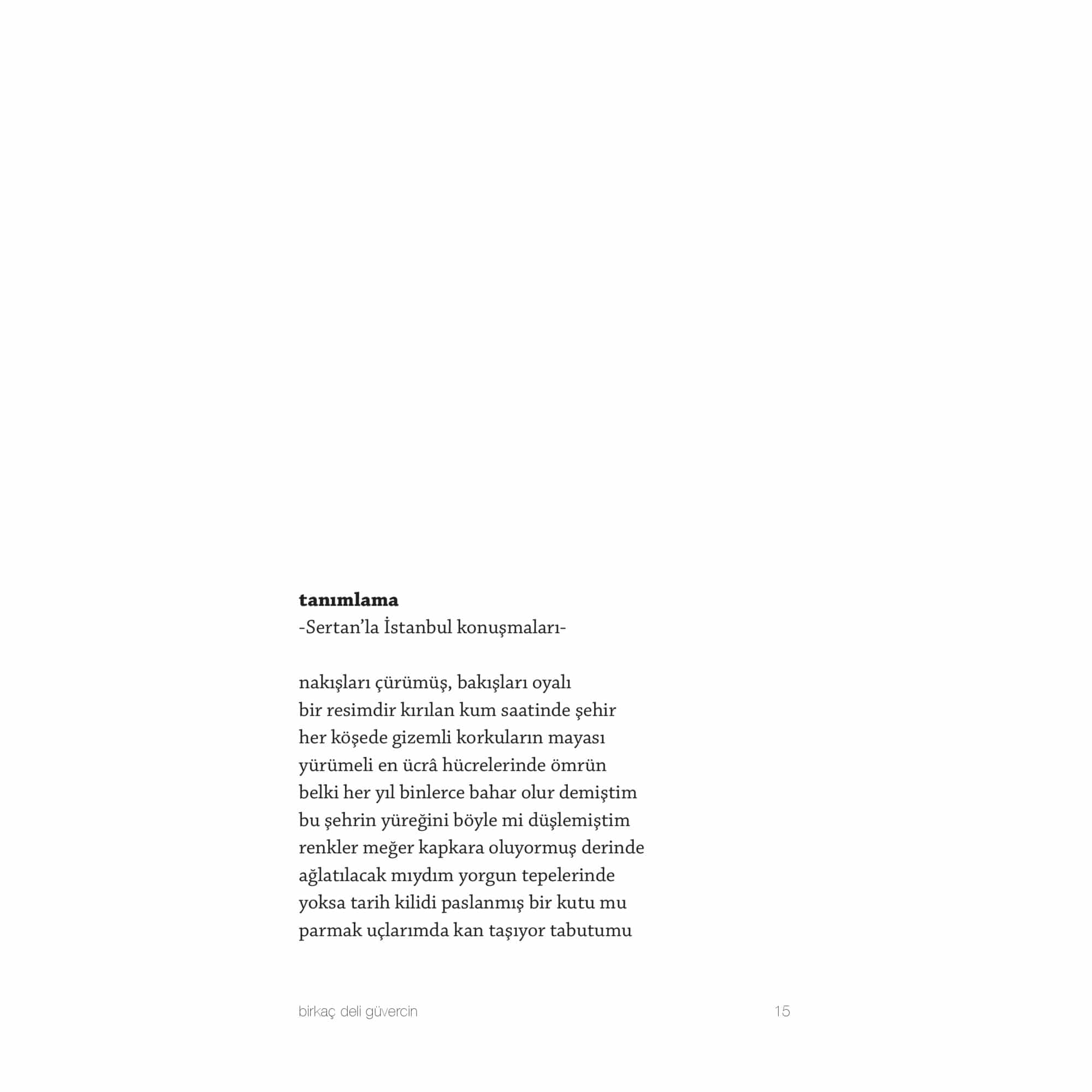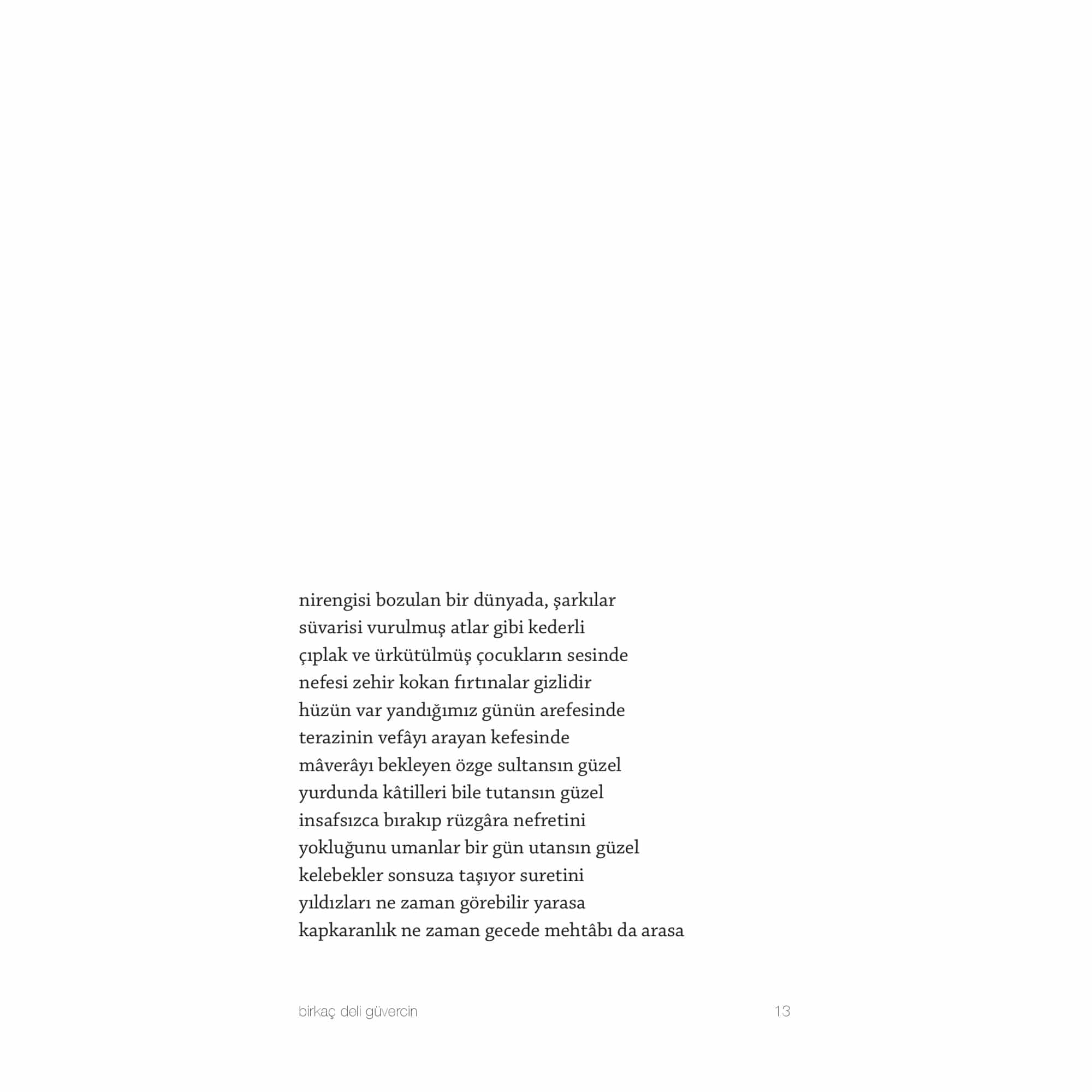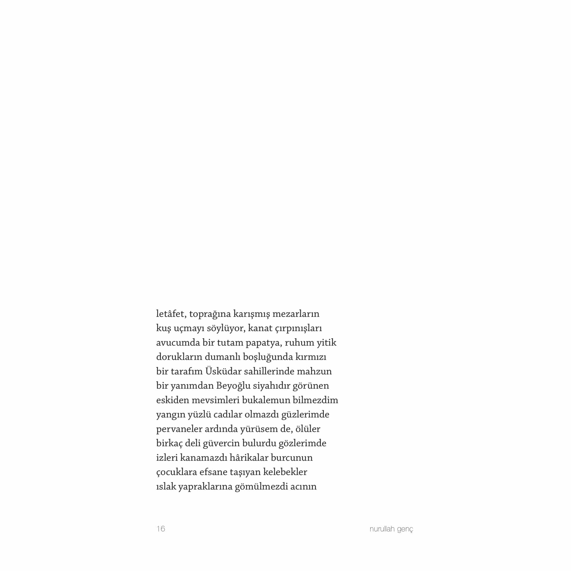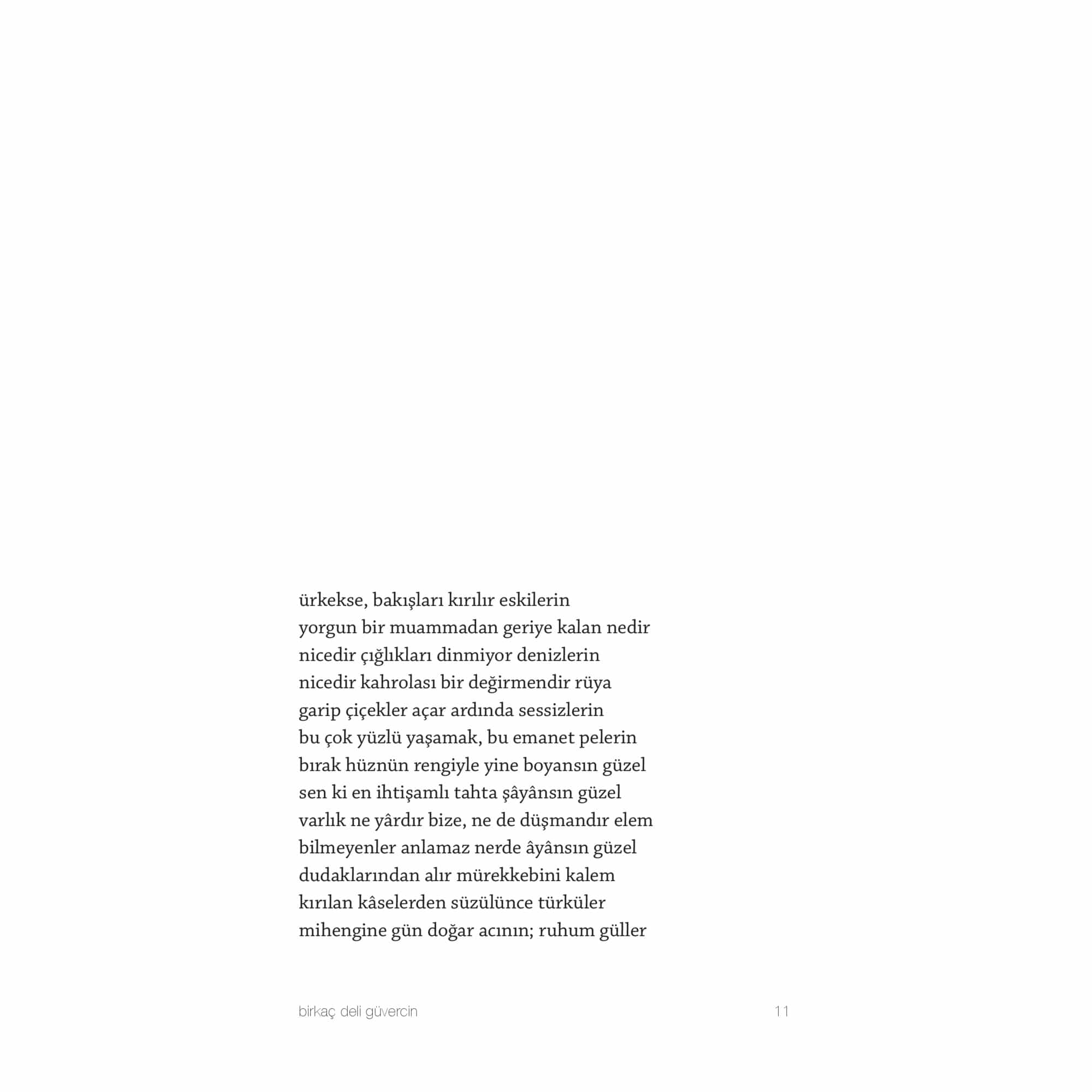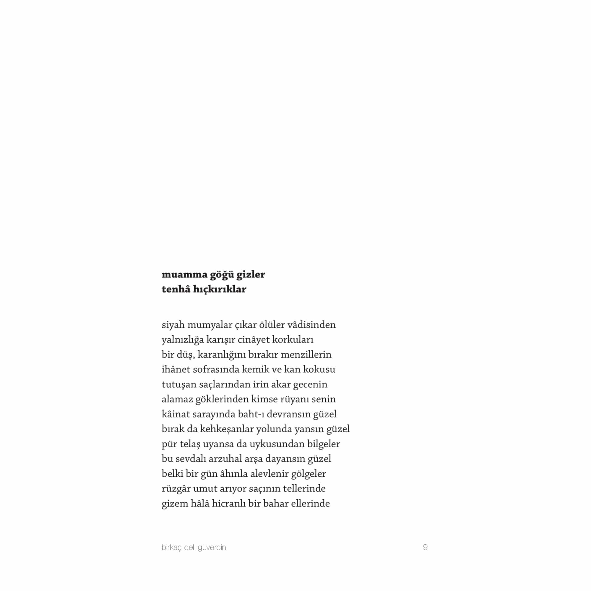 Birkaç Deli Güvercin, lirizm ile tarihi iç içe sunuyor. İstanbul temasının ağır bastığı kitap bir na’atı şerifle açılıyor. Hüzün tonu yüksek şiirlerle devam ediyor. Nurullah Genç bu kitabında Yağmur şiiriyle klasikleşen üslubuyla devam ediyor. bilmem neyi aradım bir ömür kışlarında binbir gece yürüdüm hangi muamma için zümrüd-ü ankâ uçar senin [...]