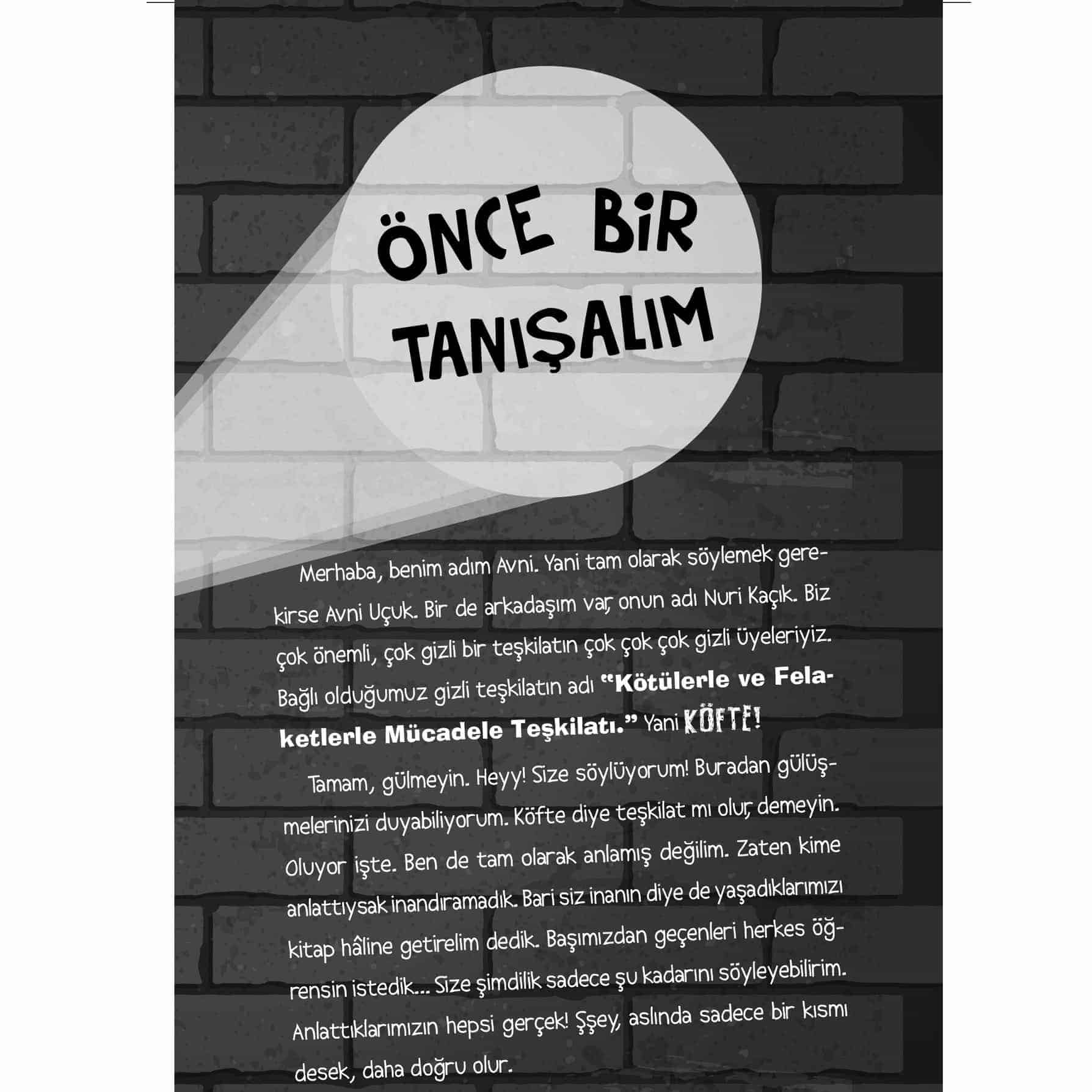 "Merhaba, benim adım Avni. Yani tam olarak söylemek gerekirse Avni Uçuk... Bir de arkadaşım var onun adı Nuri Kaçık... Biz çok önemli, çok gizli bir teşkilatın çok çok çok gizli üyeleriyiz. Bağlı olduğumuz gizli teşkilatın adı "Kötülerle ve Felaketlerle Mücadele Teşkilatı." Kısaltması: KÖFTE Tamam, gülmeyin. Heyy! Size söylüyorum! Buradan gülüşmelerinizi duyabiliyorum. Köfte diye teşkilat mı olur, demeyin. Oluyor işte. Ben de tam olarak anlamış değilim. Zaten kime anlattıysak inandıramadık. Bari siz inanın diye de yaşadıklarımızı kitap haline getirelim, dedik. Başımızdan geçenleri herkes öğrensin istedik… Size şimdilik sadece şu kadarını söyleyebilirim. Anlattıklarımızın hepsi gerçek! Şşeyy, aslında sadece bir kısmı desek, daha doğru olur... "Avni'yi duydunuz... Uçuk kaçık iki arkadaşın kötülerle ve felaketlerle mücadelesinde sürüklenmek istiyor musunuz? O hâlde hazır olun!Aksiyon, gerilim, biraz korku ve tabii ki çok çok çok komedi ve eğlence sizi bekliyor!