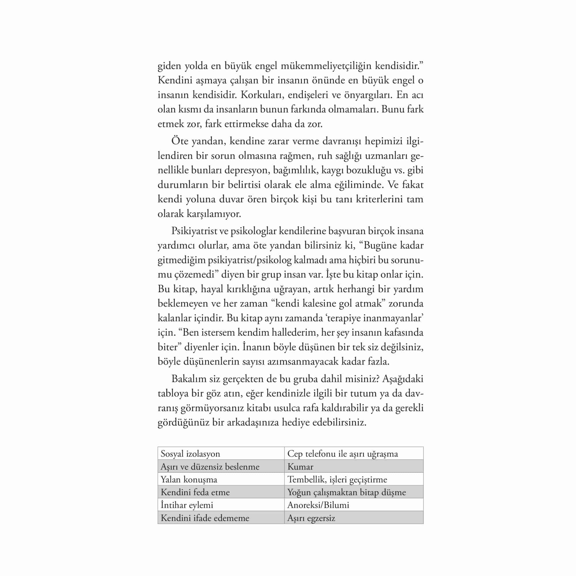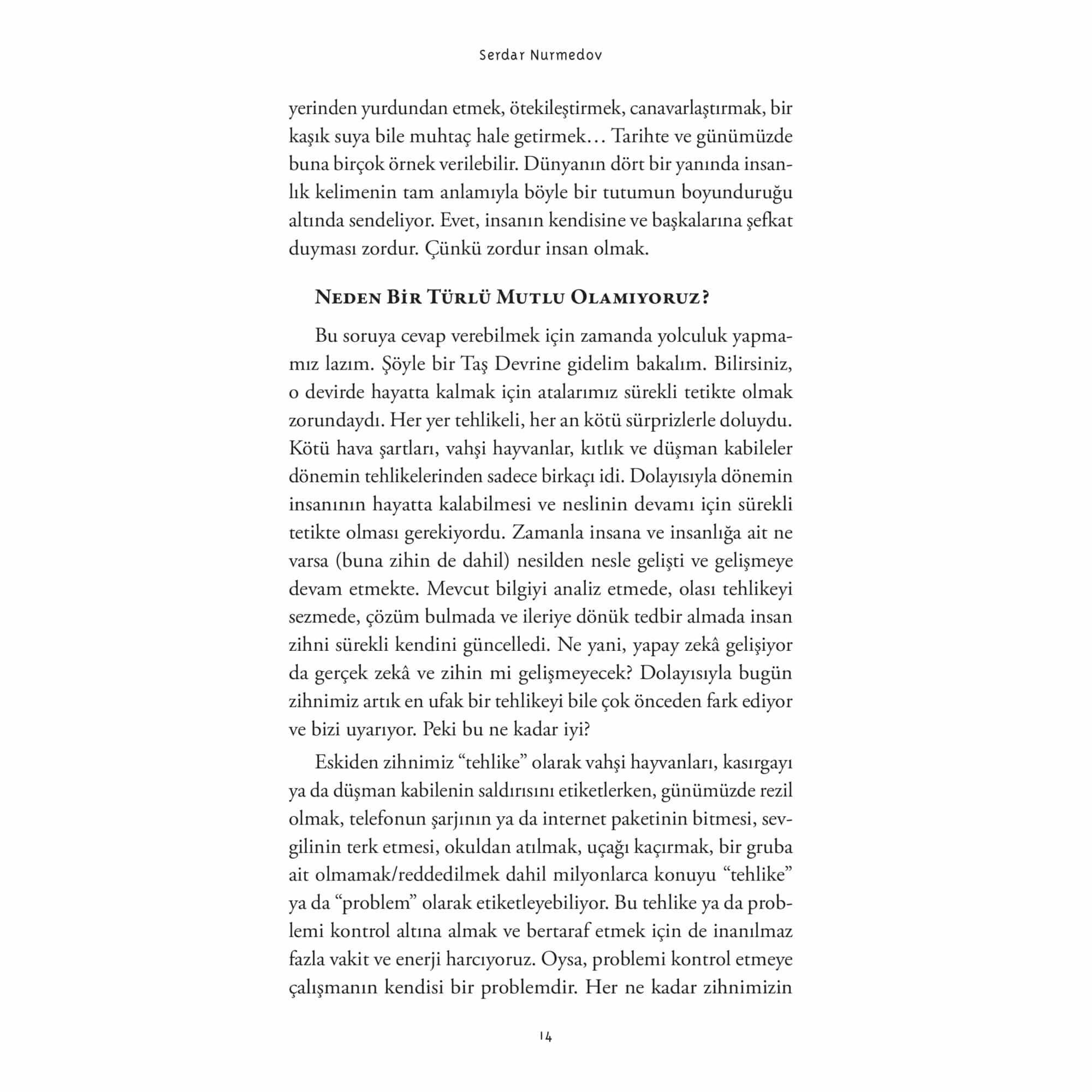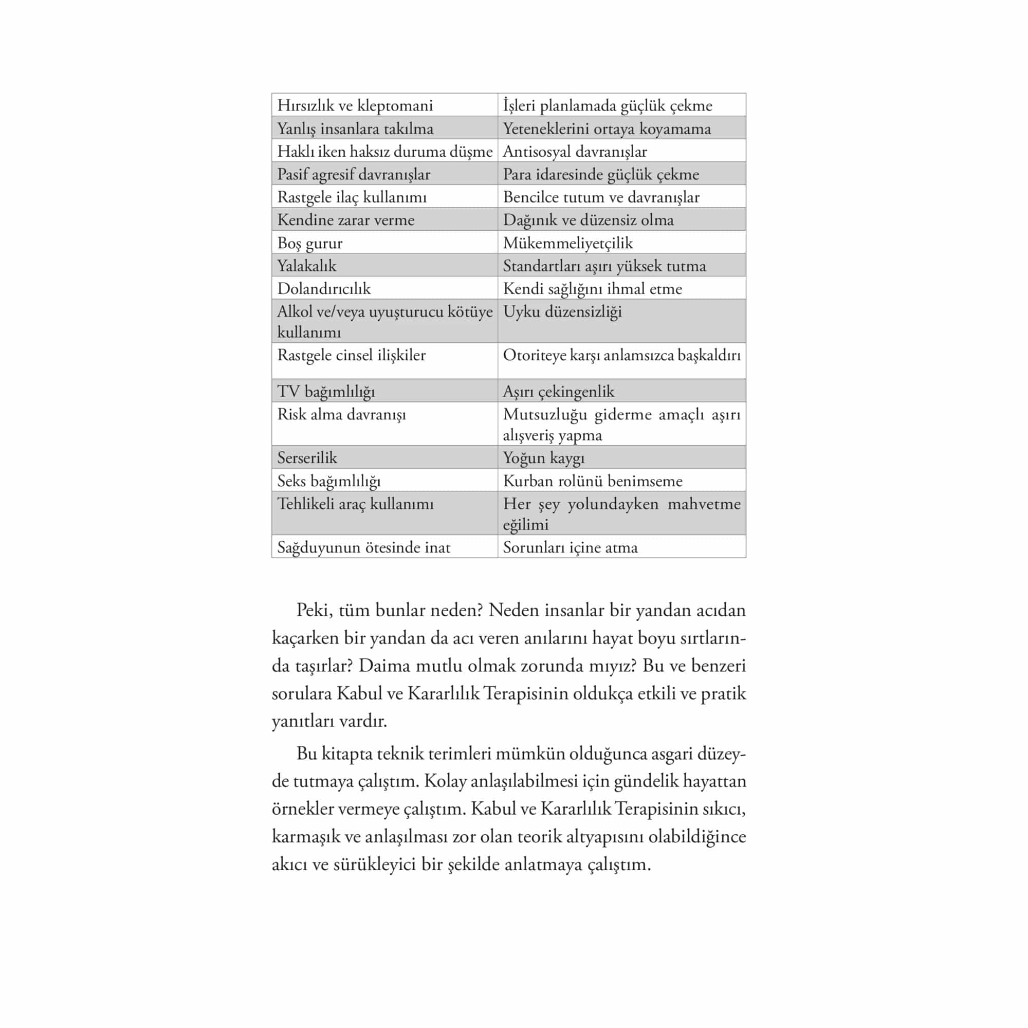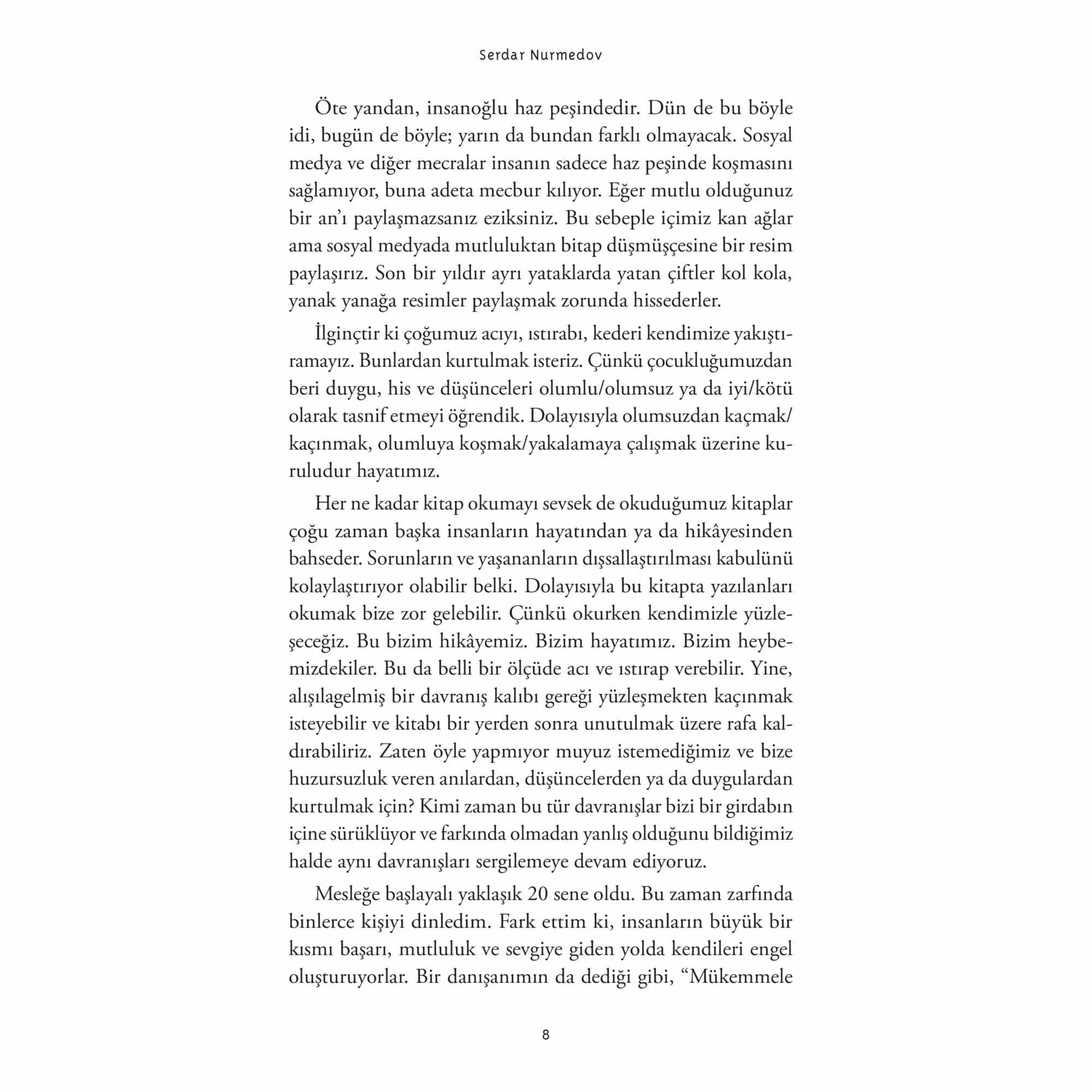 İlginçtir ki çoğumuz acıyı, ıstırabı, kederi kendimize yakıştıramayız. Bunlardan kurtulmak isteriz. Çünkü çocukluğumuzdan beri olumsuzdan kaçmak, olumluya koşmak üzerine kuruludur hayatımız. Acıdan kaçmak, dertlerimize çare bulmak için yaptıklarımızdan biri de kitap okumaktır ama okuduğumuz kitaplar çoğu zaman başka insanların hayatından ya da hikâyesinden bahseder. Sorunların ve yaşananların dışsallaştırılması kabulünü kolaylaştırıyor olabilir belki ama bu kitap doğrudan SİZ’e odaklanıyor. Bu kitapta farkındalık ve şefkatle çoğu zaman kendimize sormaktan kaçındığımız soruları soracağız. Ama inatla ve ısrarla doğru cevapları bulmak için çabalamayacağız. Sorun neyse onu kontrol etmeye çalışmadan, kendimize duygusal esneklik kazandırma alıştırmaları yapacağız. Adım adım ilerleyen bir tempoyla hayat hikâyemizi yazacak, kaçınma davranışlarımızı bulacak, değerlerimizi ve hedeflerimizi belirleyecek, kabul’e ve an’da olmaya doğru bir yolculuğa çıkacağız. Bu kitap “Bugüne kadar gitmediğim psikiyatrist/psikolog kalmadı ama hiçbiri bu sorunumu çözemedi,” diyenler için. Hep hayal kırıklığına uğrayan, artık herhangi bir yardım beklemeyen ve her zaman “kendi kalesine gol atmak” zorunda kalanlar için. Bu kitap aynı zamanda ‘terapiye inanmayanlar’ için. "Değerli meslektaşım Serdar Nurmedov Kabul ve Kararlılık Terapisini çok yalın ve sade bir dille anlatmış. Bu kitap ile 9 adımda daha fazla anda kalmayı sağlayan yaşama stratejilerini öğrenecek, sizin için önemli olan değerlere odaklanıp acı veren duygu ve deneyimlere daha az kapılmayı deneyimleyeceksiniz. Yaşamınızdaki değişim sürecinde size ışık tutacak bu kitabı okumak tam bir kazan-kazan deneyimidir; herkese öneriyorum." Prof. Dr. Nesrin Dilbaz