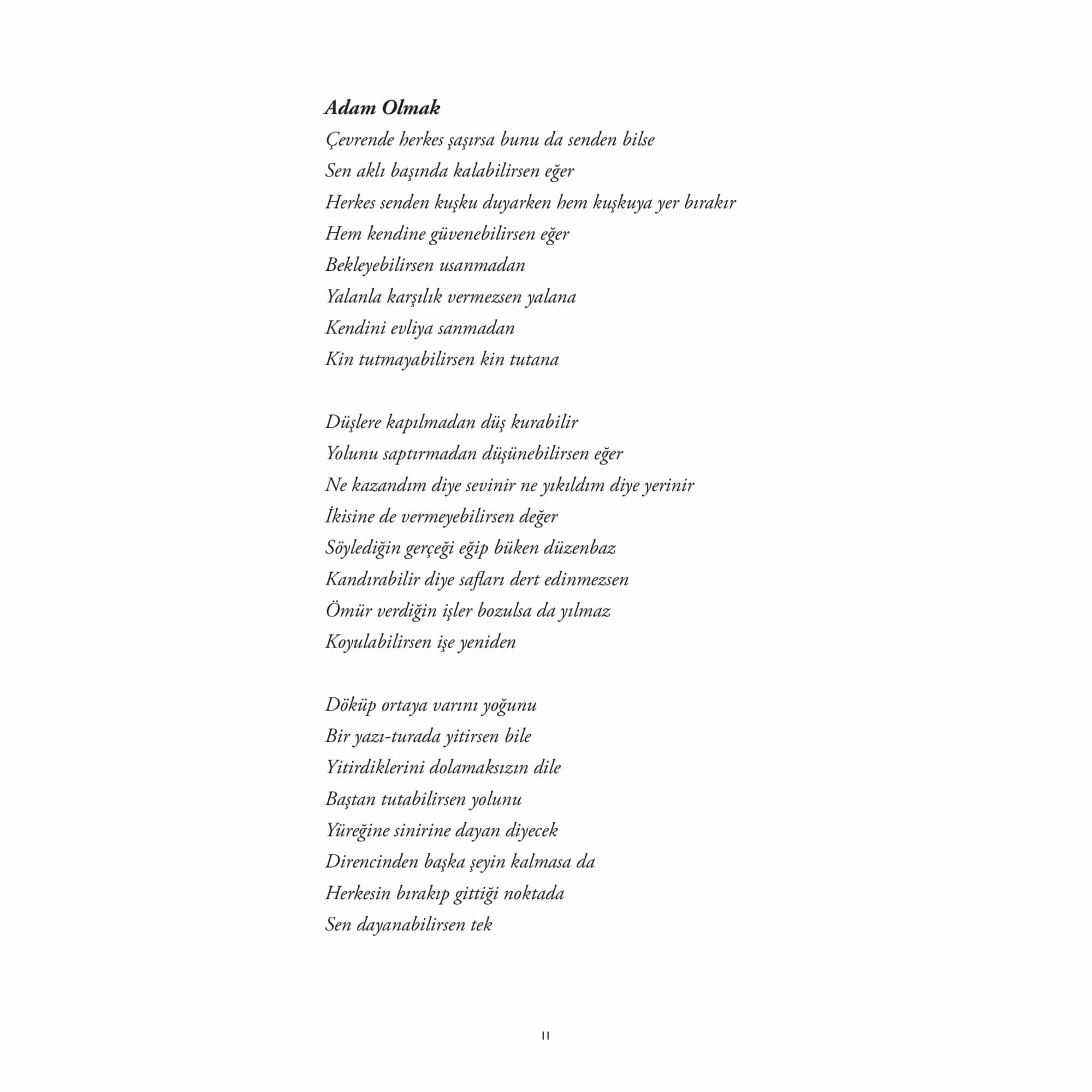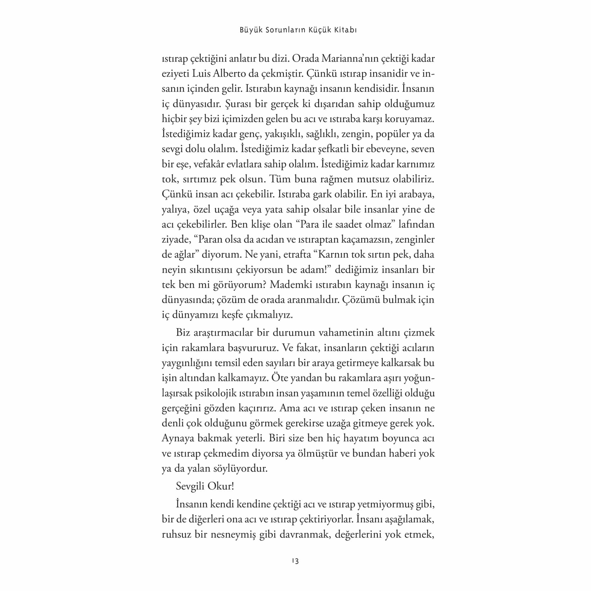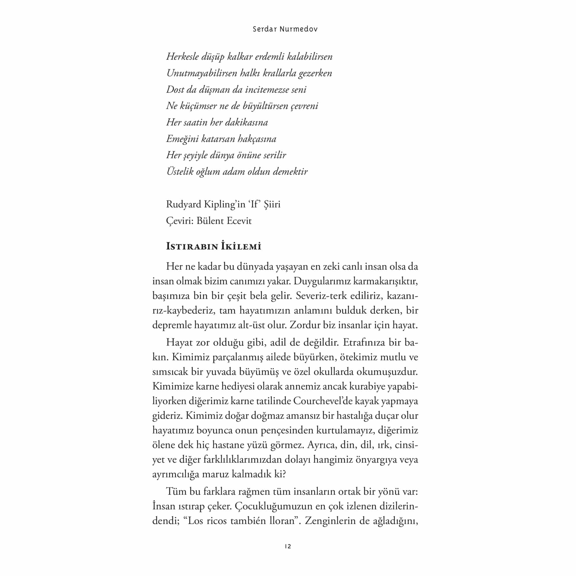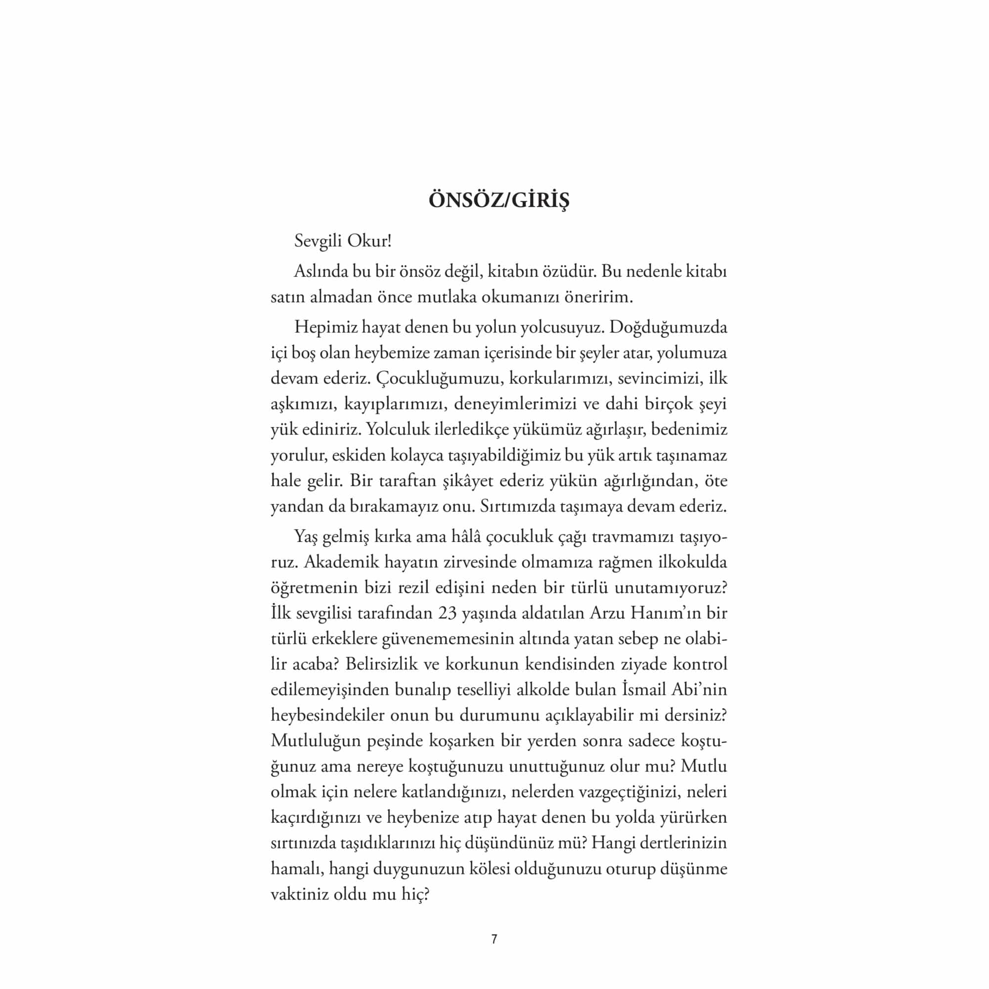 İlginçtir ki çoğumuz acıyı, ıstırabı, kederi kendimize yakıştıramayız. Bunlardan kurtulmak isteriz. Çünkü çocukluğumuzdan beri olumsuzdan kaçmak, olumluya koşmak üzerine kuruludur hayatımız. Acıdan kaçmak, dertlerimize çare bulmak için yaptıklarımızdan biri de kitap okumaktır ama okuduğumuz kitaplar çoğu zaman başka insanların hayatından ya da hikâyesinden bahseder. Sorunların ve yaşananların dışsallaştırılması kabulünü kolaylaştırıyor olabilir belki ama bu kitap doğrudan SİZ’e odaklanıyor. Bu kitapta farkındalık ve şefkatle çoğu zaman kendimize sormaktan kaçındığımız soruları soracağız. Ama inatla ve ısrarla doğru cevapları bulmak için çabalamayacağız. Sorun neyse onu kontrol etmeye çalışmadan, kendimize duygusal esneklik kazandırma alıştırmaları yapacağız. Adım adım ilerleyen bir tempoyla hayat hikâyemizi yazacak, kaçınma davranışlarımızı bulacak, değerlerimizi ve hedeflerimizi belirleyecek, kabul’e ve an’da olmaya doğru bir yolculuğa çıkacağız. Bu kitap “Bugüne kadar gitmediğim psikiyatrist/psikolog kalmadı ama hiçbiri bu sorunumu çözemedi,” diyenler için. Hep hayal kırıklığına uğrayan, artık herhangi bir yardım beklemeyen ve her zaman “kendi kalesine gol atmak” zorunda kalanlar için. Bu kitap aynı zamanda ‘terapiye inanmayanlar’ için. "Değerli meslektaşım Serdar Nurmedov Kabul ve Kararlılık Terapisini çok yalın ve sade bir dille anlatmış. Bu kitap ile 9 adımda daha fazla anda kalmayı sağlayan yaşama stratejilerini öğrenecek, sizin için önemli olan değerlere odaklanıp acı veren duygu ve deneyimlere daha az kapılmayı deneyimleyeceksiniz. Yaşamınızdaki değişim sürecinde size ışık tutacak bu kitabı okumak tam bir kazan-kazan deneyimidir; herkese öneriyorum." Prof. Dr. Nesrin Dilbaz