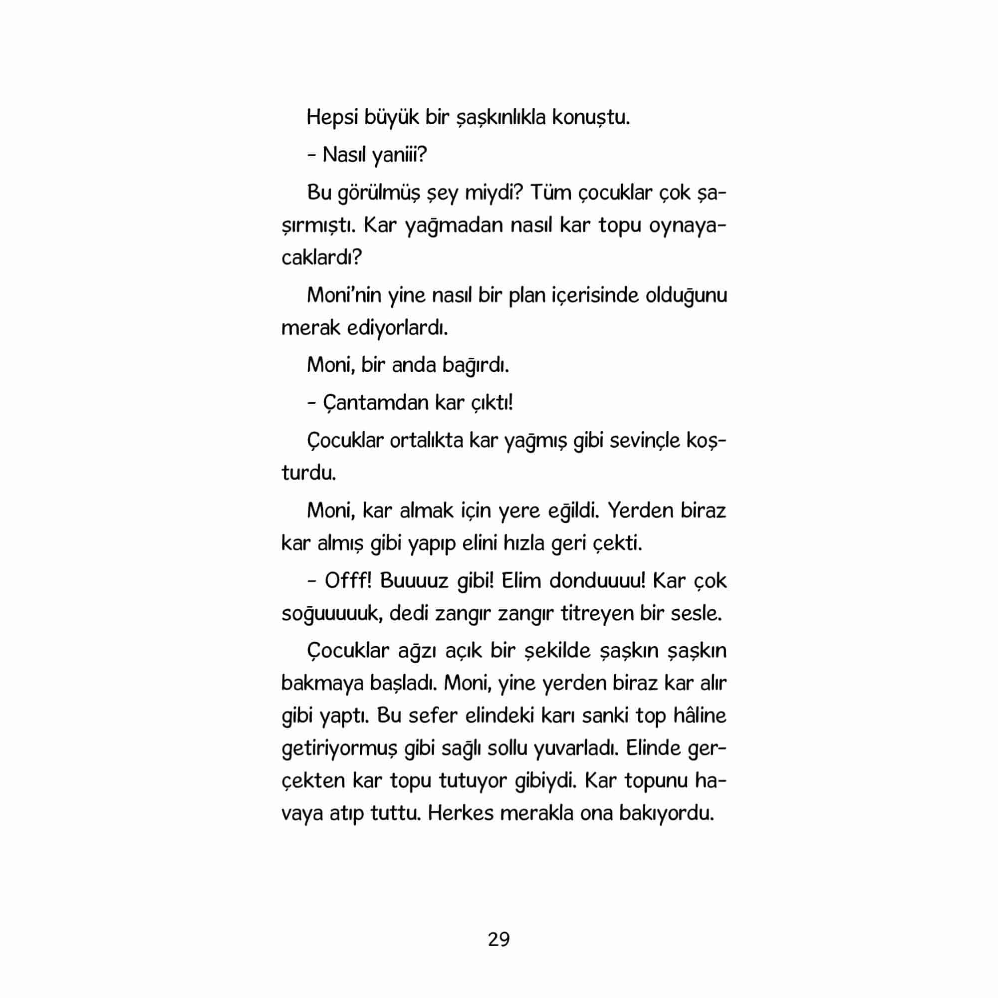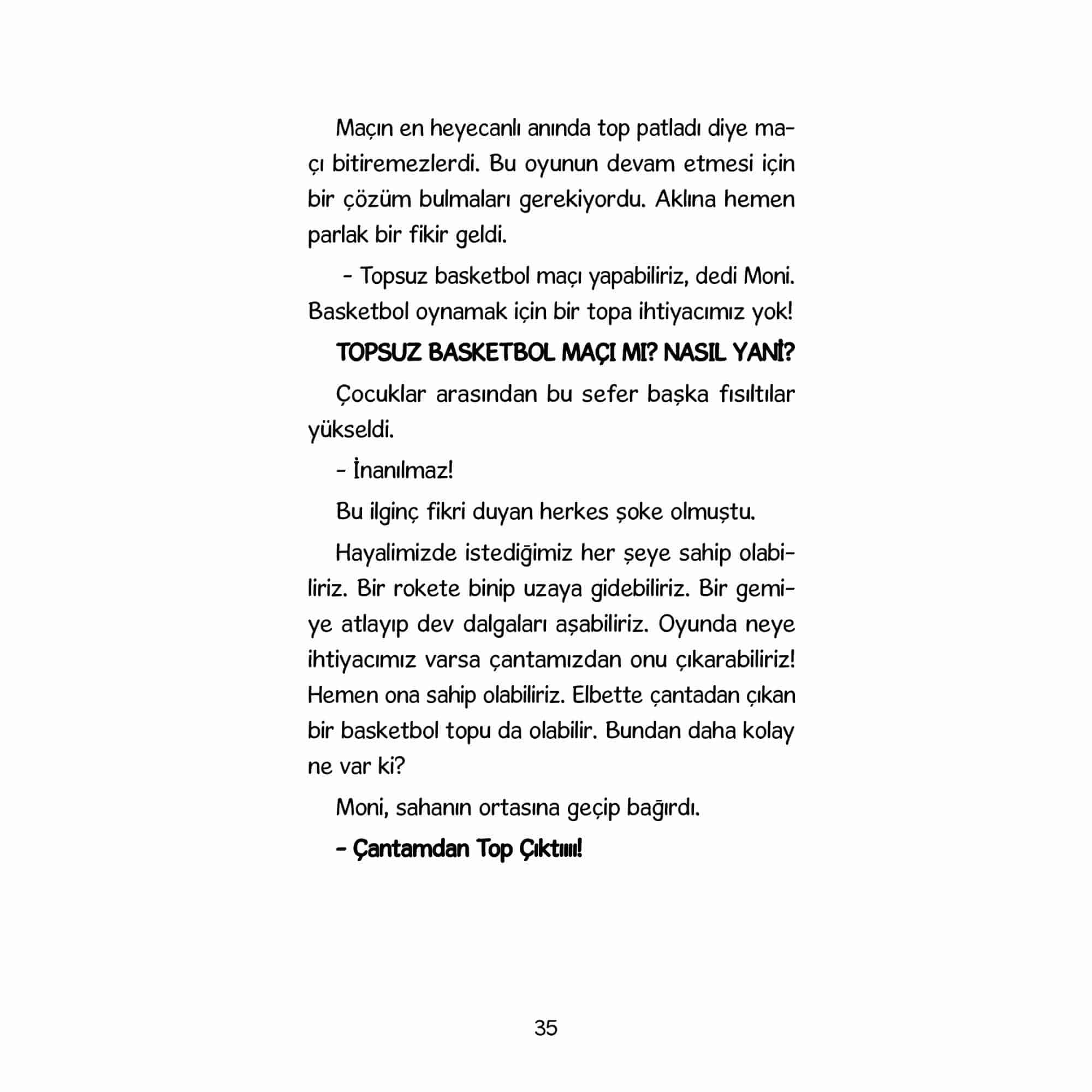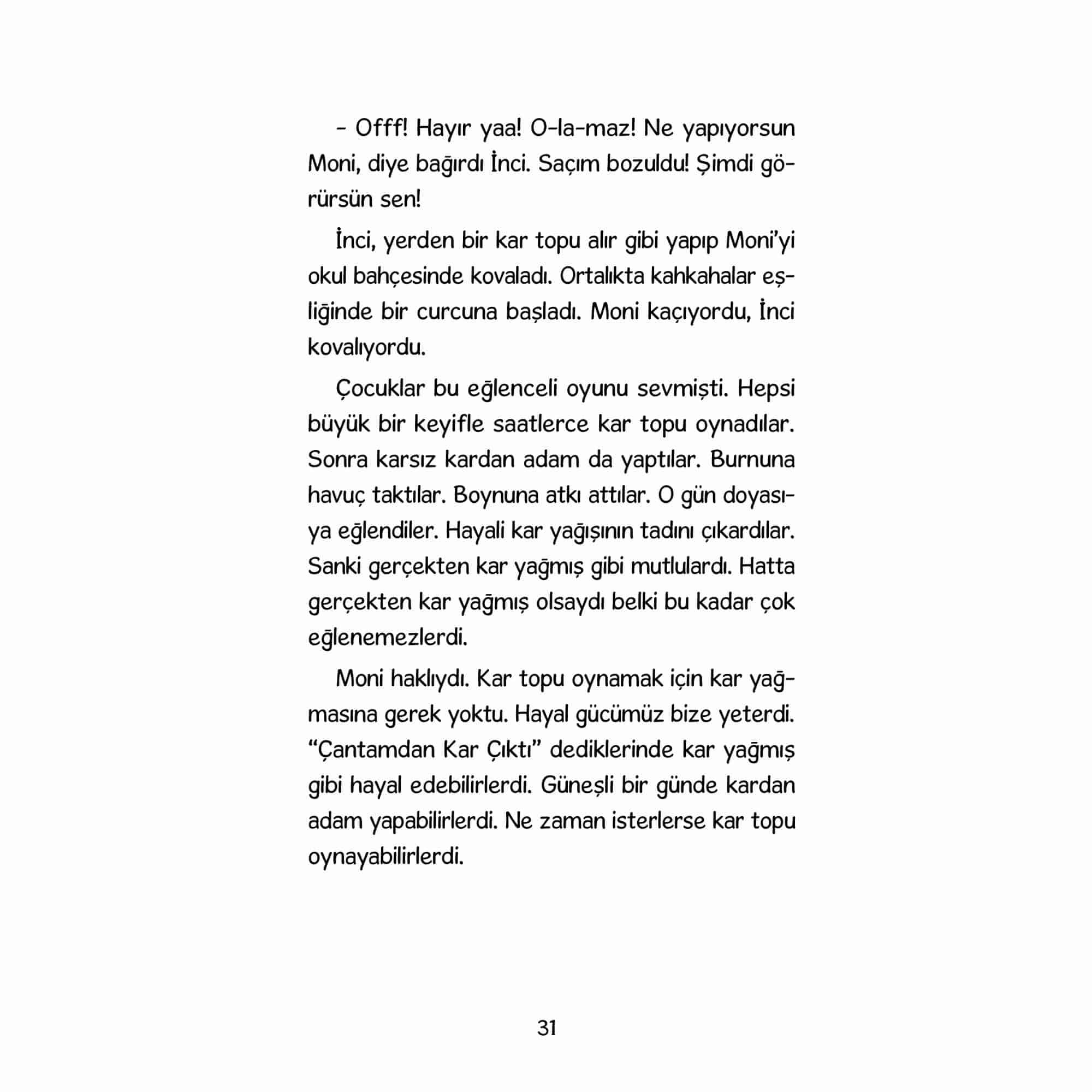 SATIŞ REKORLARI KIRAN BENİM ZÜRAFAM UÇABİLİR VE UZAYA GİDEN TREN KİTAPLARININ YAZARINDAN YİNE ŞAHANE BİR MACERA! Öğretmen, bu sefer sınıfa oyun dolu bir çantayla geldi. Heyecan verici bir sorusu vardı. Bu çantanın içinden oyun oynamak için neler çıkabilir? Bir kitap mı, bir elma mı yoksa bir basketbol topu mu? Çocukların yıl sonu ödevi, hayal gücüyle muhteşem bir oyun tasarlamaktı. Yine bir ekip çalışması yapacaklardı. Moni ve arkadaşları harika bir oyun bulmak için kolları sıvadı. Bu ödevde hayal gücünün sınırları yoktu. Çantanın içinden her şey çıkabilirdi! Çantamdan Fil Çıktı, oyun oynamak ve hayal gücüyle kendini keşfetmek isteyen herkesi büyüleyici dünyasına davet ediyor. Peki, oyun oynamak için senin çantandan ne çıktı? Hadi! Hayal Olimpiyatları’na katılmaya hazır mısın?