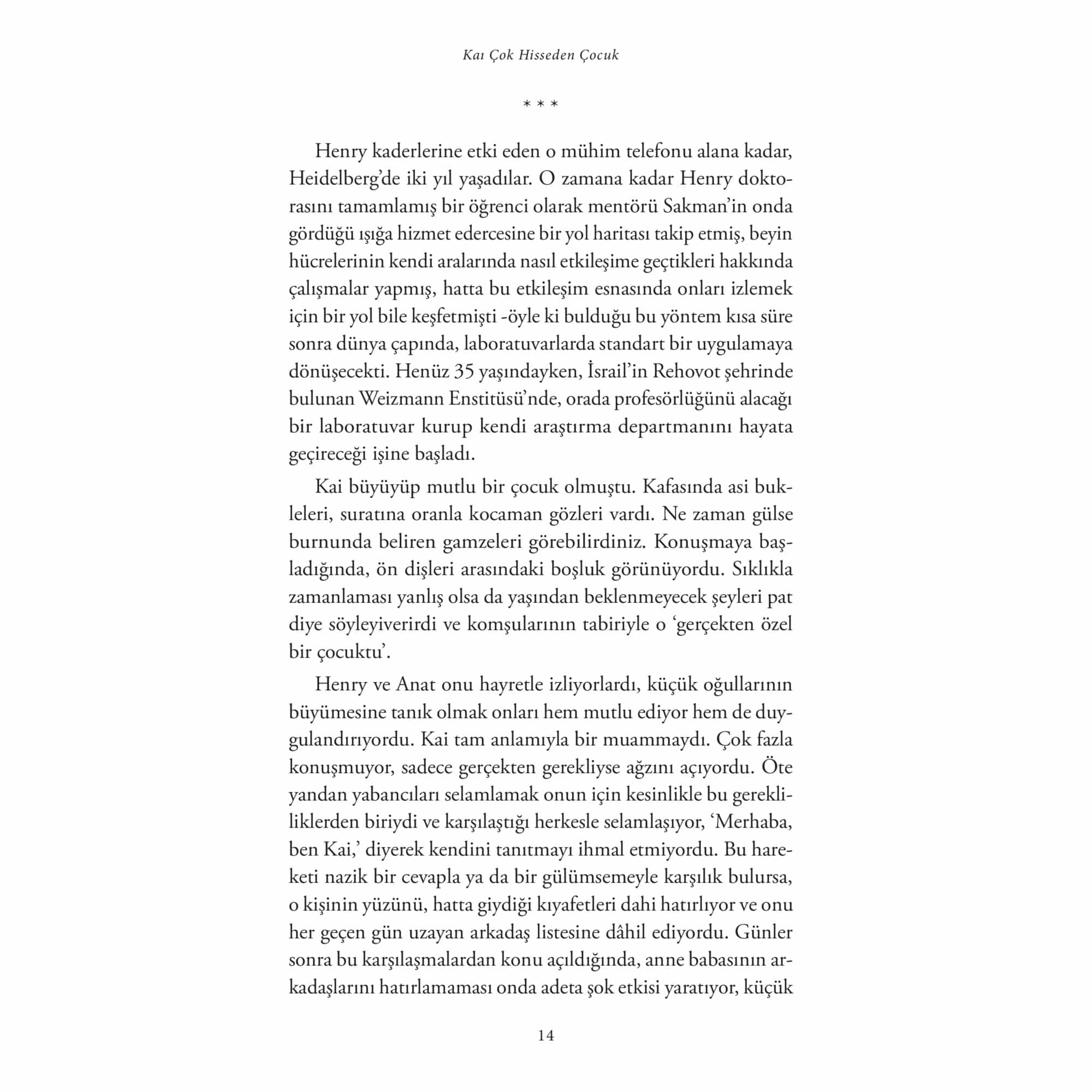 Henry Markram, nörobilimin Elon Musk’ıdır. Beynin süper bilgisayar modelini inşa etmek için çalışan “Blue Brain Project”in arkasındaki isimdir. Onu beynin gizemli dünyasını büyük bir hırsla çözmeye iten motivasyon kaynağı ise son derece kişiseldir: Otizmli oğlu Kai. Markram, Kai doğduğunda da dünyanın en ünlü beyin araştırmacılarından biriydi. Ancak Kai’yle birlikte her şey değişti. Kai’ye otizm teşhisi konulmasıyla Markram’ın çalışmaları yeni bir odak kazandı ve bu sayede bilim dünyasının otizme bakışını kökten değiştiren çalışmalar ortaya çıkmaya başladı. Otizmin empati eksikliği olduğuna dair bilimsel fikir birliği, Markram'ın oğluyla ilgili deneyimiyle uyuşmuyordu. Çünkü Kai gibi insanlar az değil, çok daha fazla “hissediyorlardı”. Duyuları bu dünya için fazla hassastı. Öyleyse o güne kadar bilim dünyasında hakim olan anlayışın sarsılması ve uygulanan tedavinin kökten değişmesi gerekiyordu. Çok Hisseden Çocuk, Henry Markram ve oğlu Kai’nin çaresizlik, hırs, tutku ve inançla dolu öyküsü.