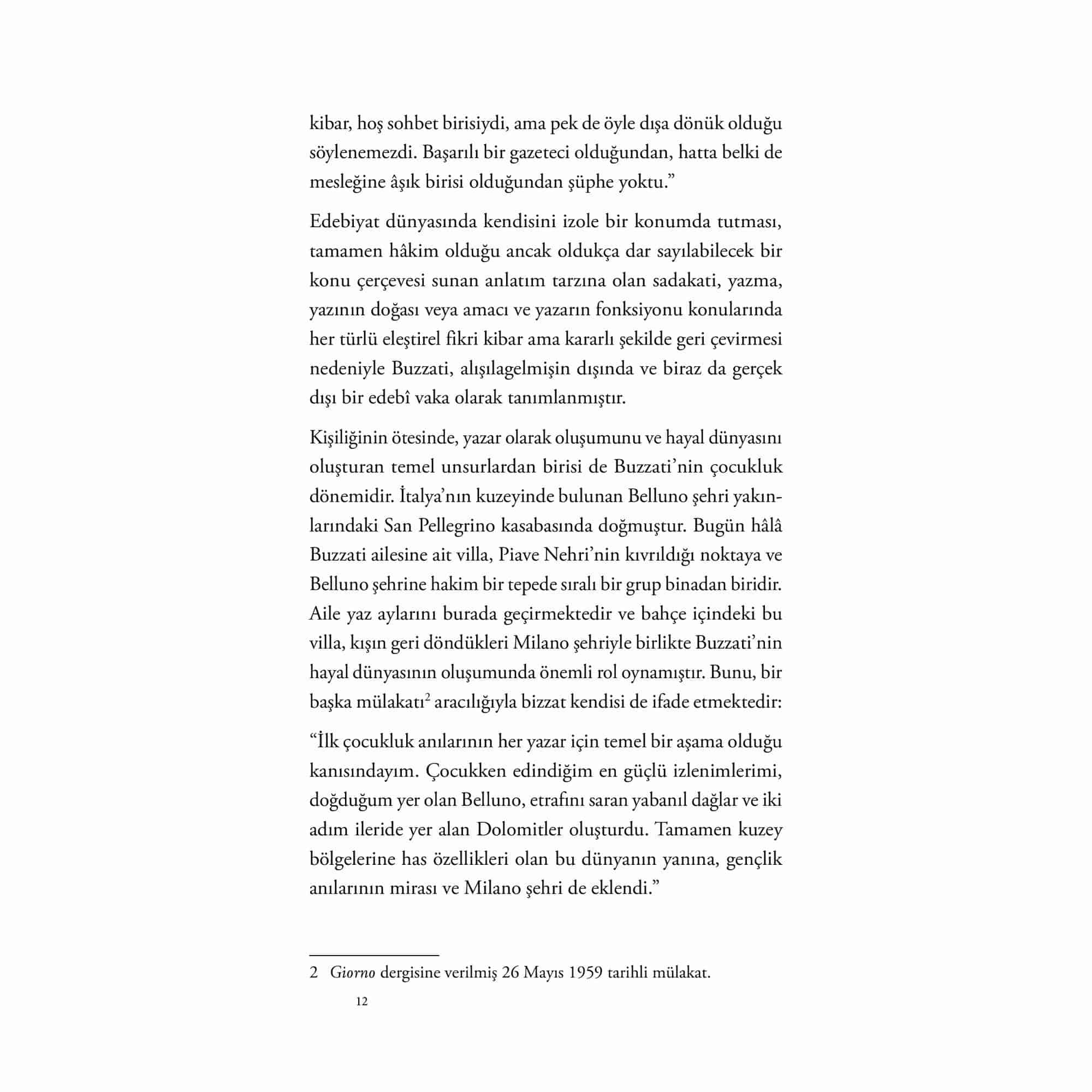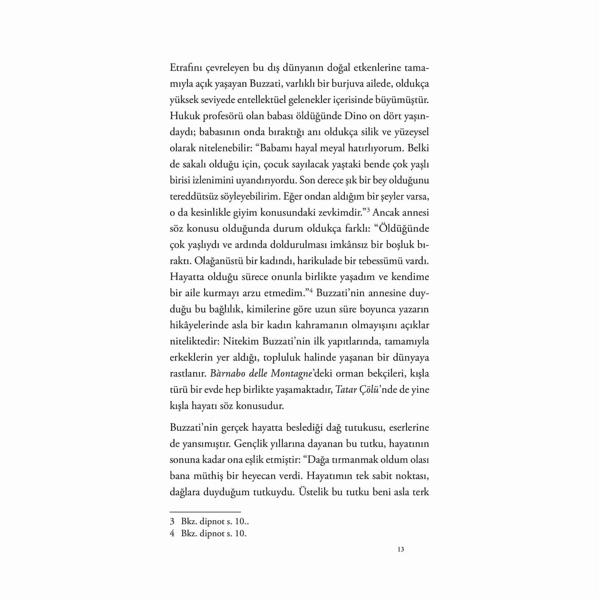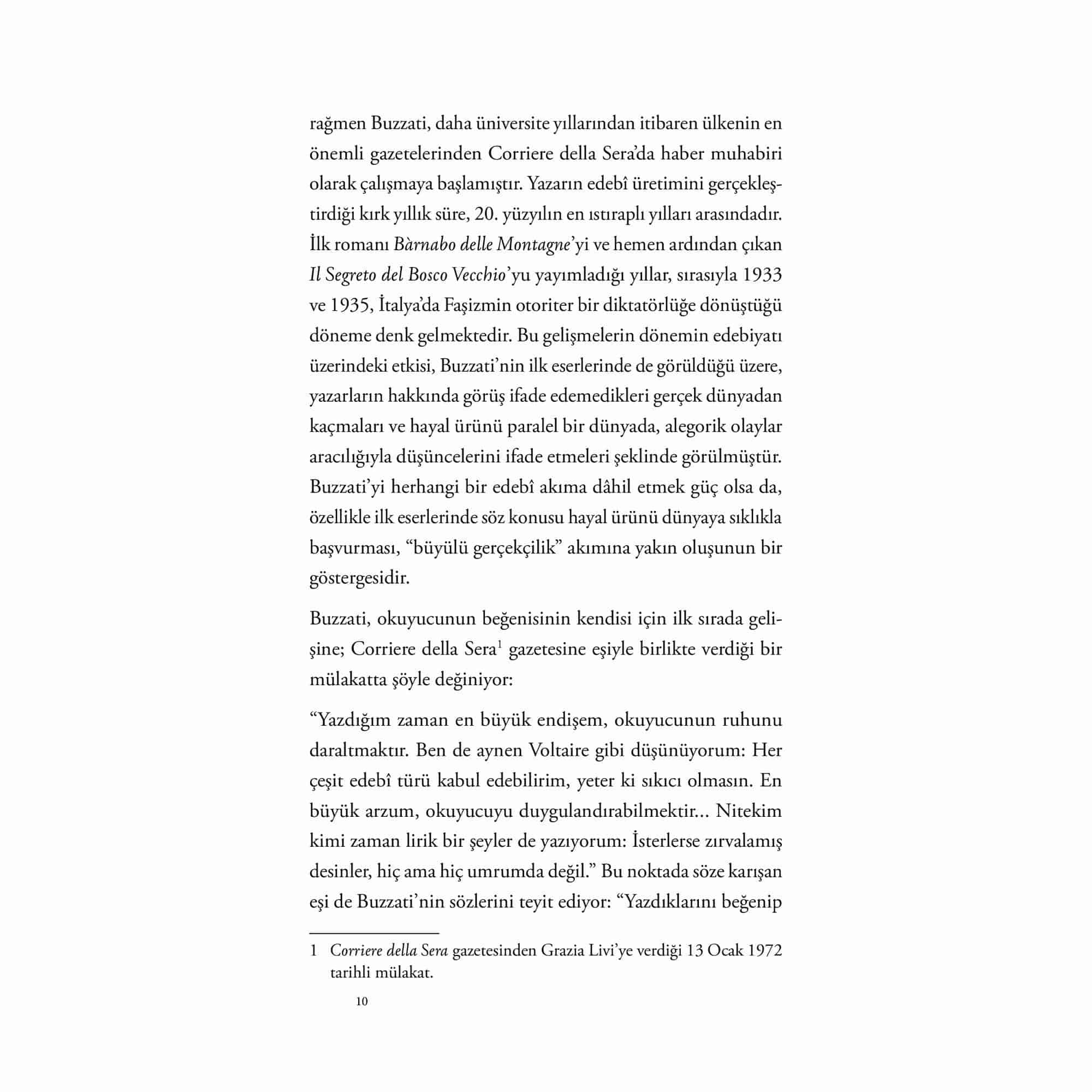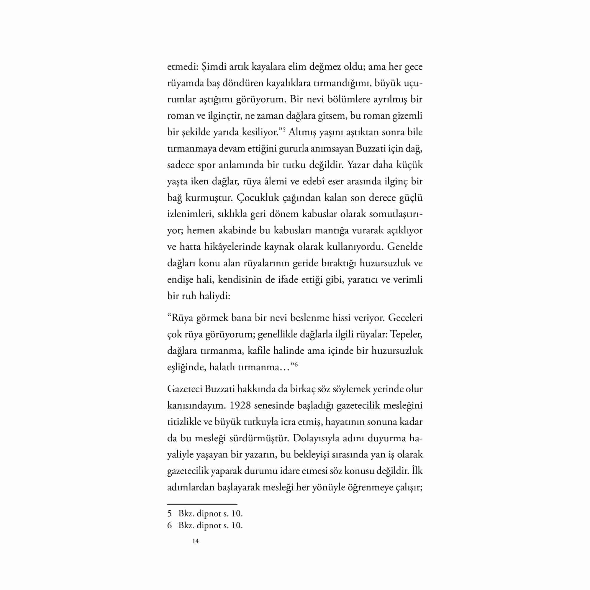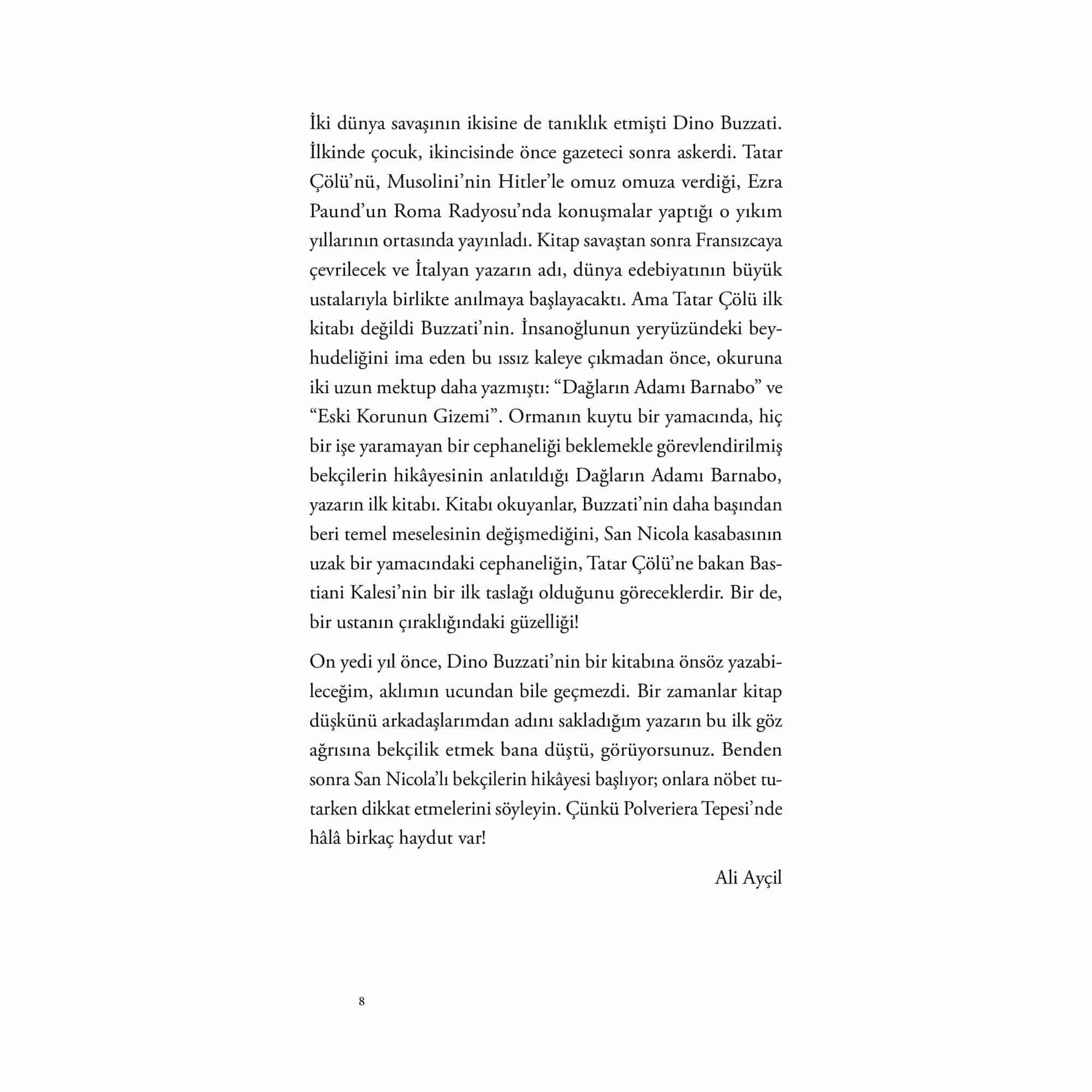 Çağdaş dünya edebiyatının ve İtalyan edebiyatının en önemli kalemlerinden Dino Buzzati’nin ilk romanı Dağların Adamı Barnabo, ormanın saklı bir köşesinde, pek işe yaramayan bir cephaneliği beklemekle görevlendirilmiş bir bekçinin hikâyesi üzerinedir. Bekçilerden birinin öldürülmesiyle görevinden ve çok sevdiği dağlardan ayrılmak zorunda kalan romanın başkahramanı Barnabo bir taraftan pişmanlık ve yalnızlık duygusuyla savaşırken, diğer taraftan akıp giden hayatla, her şeyi anıya dönüştüren zamanla, düşün ve hakikatin zıtlığından doğan çelişkiyle ve sıkıntıyla mücadele ederek varoluşuna bir anlam bulmaya çalışır. Buzzati, sembollerle dolu gerçeküstü bir dünyayı, gerçek dünyanın yanına yerleştirir; hakikati istila eden hiçlik duygusunu bir varoluş biçimi olarak okura sunar. Dağların Adamı Barnabo, insanın dinmeyen yalnızlığına, doğaya içkin tabiatına ve zamanla çelişkili ilişkisine dair derinlikli bir roman... “Gelecek nesillerin asla unutmayacağı isimler vardır şüphesiz. Dino Buzzati de bunlardan biri.” –Jorge Luis Borges