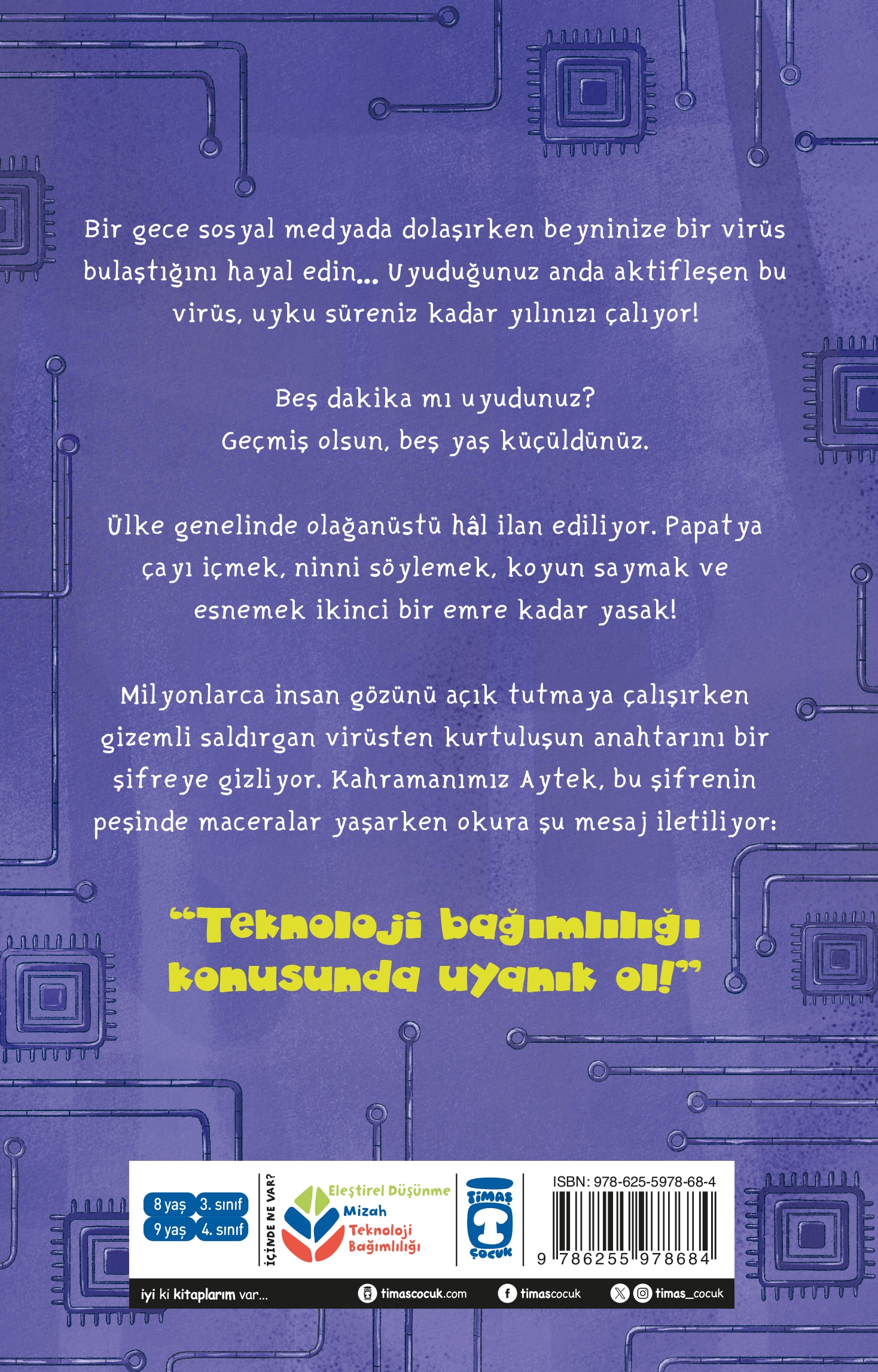 Bir gece sosyal medyada dolaşırken beyninize bir virüs bulaştığını hayal edin… Uyuduğunuz anda aktifleşen bu virüs, uyku süreniz kadar yılınızı çalıyor! Beş dakika mı uyudunuz? Geçmiş olsun, beş yaş küçüldünüz. Ülke genelinde olağanüstü hâl ilan ediliyor. Papatya çayı içmek, ninni söylemek, koyun saymak ve esnemek ikinci bir emre kadar yasak! Milyonlarca insan gözünü açık tutmaya çalışırken gizemli saldırgan virüsten kurtuluşun anahtarını bir şifreye gizliyor. Kahramanımız Aytek bu şifrenin peşinde maceralar yaşarken okura şu mesaj iletiliyor: “Teknoloji bağımlılığı konusunda uyanık ol!”