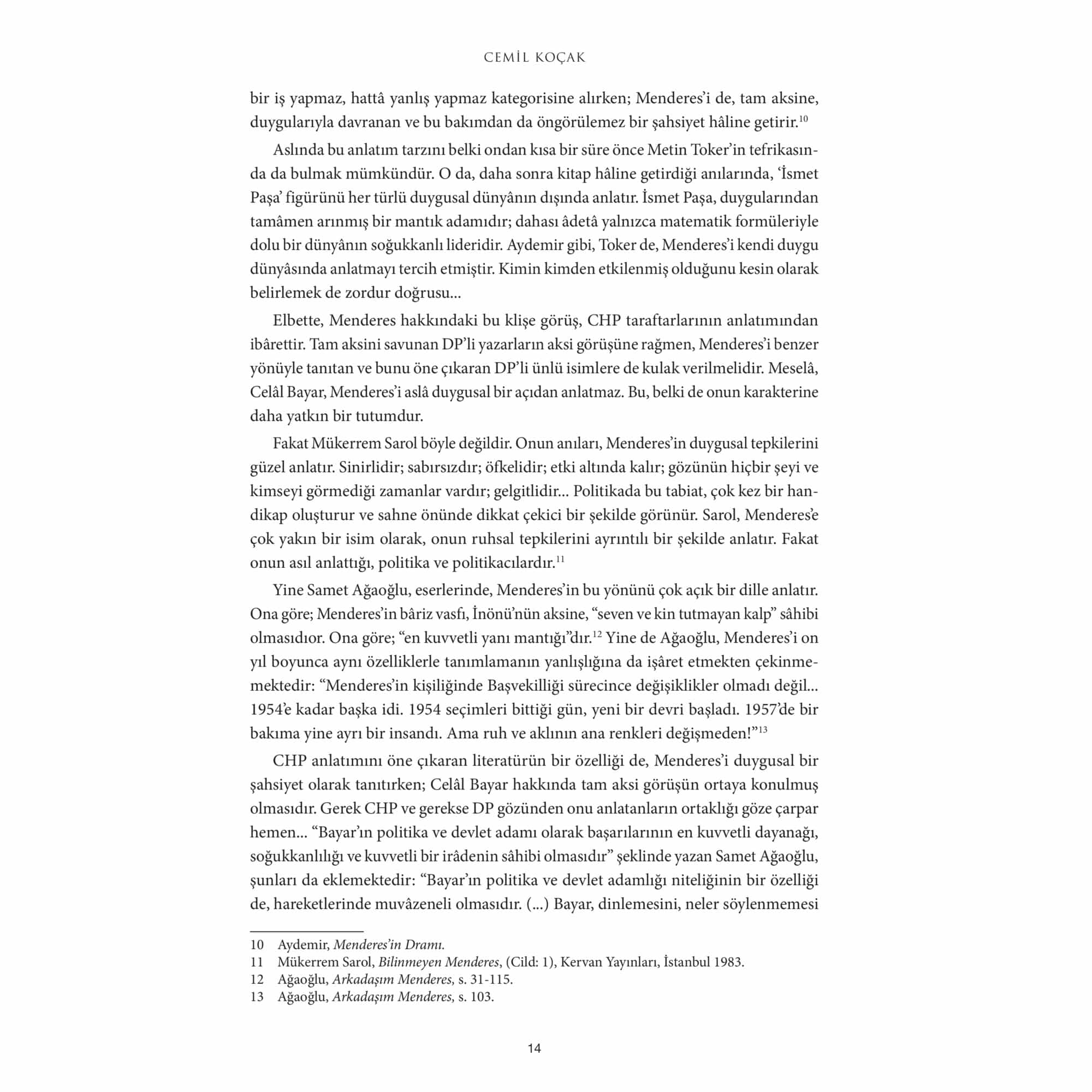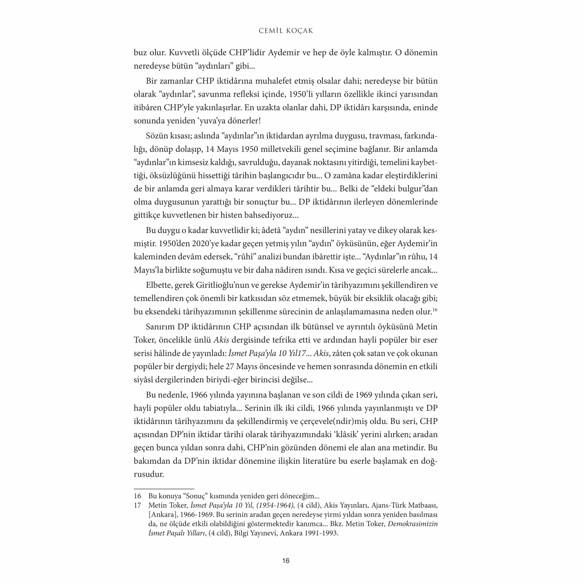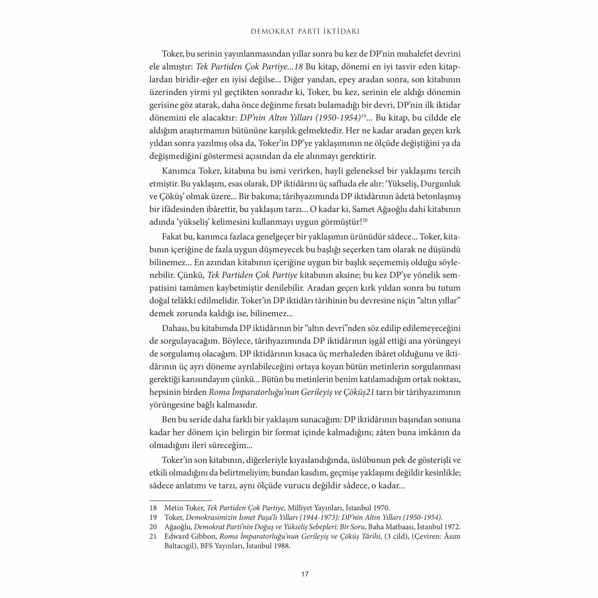 Cemil Koçak, yakın târih alanında yaptığı arkeolojik kazılarla resmî târihi ve onun nasıl oluşturulduğunu açıklayarak, unutulanları hatırlatıyor ve geçmişimizle yüzleşmemizi sağlıyor. Yakın târihimizle yüzleştiğimizde ise geçmişin resmî târih aracılığıyla hâfızalarımızdan nasıl silinmeye çalışıldığını meydana çıkarıyor. Koçak, bu çalışmasında genç Türkiye Cumhuriyeti’nin demokrasiyle imtihanı olan Demokrat Parti dönemini mercek altına alıyor. · Demokrat Parti’nin târihyazımımızdaki yeri... Bu dönemi hangi kalemler nasıl yazdı? · Demokrat Parti’nin iktidâra geçtiği 14 Mayıs 1950 gecesinden sonra neler yaşandı? · Kendisi de bu sonucu çok beklemediğini sonradan itiraf eden “yeni iktidâr”ın, yâni Demokrat Parti’nin şekillenme sürecinin ayrıntıları… · Peki Demokrat Parti iktidâra gelmeye hazır mıydı? · Siyâsî literatürdeki Bayar-Menderes ilişkisi ‘meselesi’nin tüm ayrıntıları… · Bir gün bile devlet hizmetinde yer almayan Adnan Menderes’in bu hizmetlerin en yüksek sorumluluk noktasında bulunması onu nasıl etkiledi? · Demokrat Parti’nin Başbakanı olarak Adnan Menderes… · Rakamlarla Demokrat Parti’nin seçim vaadleri ve sonuçları… · Halkevleri kapatıldı mı gerçekten? Halkevleri meselesi ve ardında yatanlar… · Demokrat Parti iktidârının milliyetçi-muhafazakâr-İslâmcı ve bu eksendeki gruplar açısından bir ‘cennet’ olduğu düşüncesi ne kadar doğruydu? Cemil Koçak, Demokrat Parti Meclis Grubu zabıtlarını ilk kez bütünüyle ele aldığı Demokrat Parti İktidârı (1950-1960) üst başlıklı serisinin ilk kitabı Demokratlar ve Halkçılar (1950-1954)'te öncelikle iktidârı ele alıyor; ardından da muhalefeti; yâni hem CHP’yi, hem Millet Partisi’ni (MP) ve hem de Türkiye Köylü Partisi’ni (TKP)... Yazarın asıl amacı, iktidârla muhalifleri arasındaki “çatışmalar”ı bir bütünlük içinde yansıtmaya çalışırken siyâsî anlaşmazlıkların karşılıklı etkilerini ve tepkilerini aynı bütünsellik içinde gösterebilmektir. Bu bakımdan zaman zaman ve belki de sık sık kronolojik târih anlatımından ayrılıyor; aksine, tematik bir bütünlüğün oluşmasına gayret ediyor. Temaların ve kronolojinin sarmalı içinde kalırken; dönemin “ruh”unu aktarmayı arzu ediyor aslında...