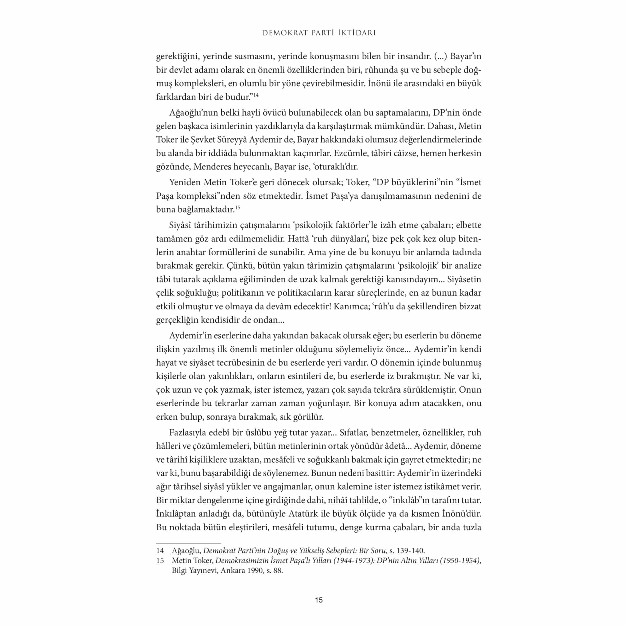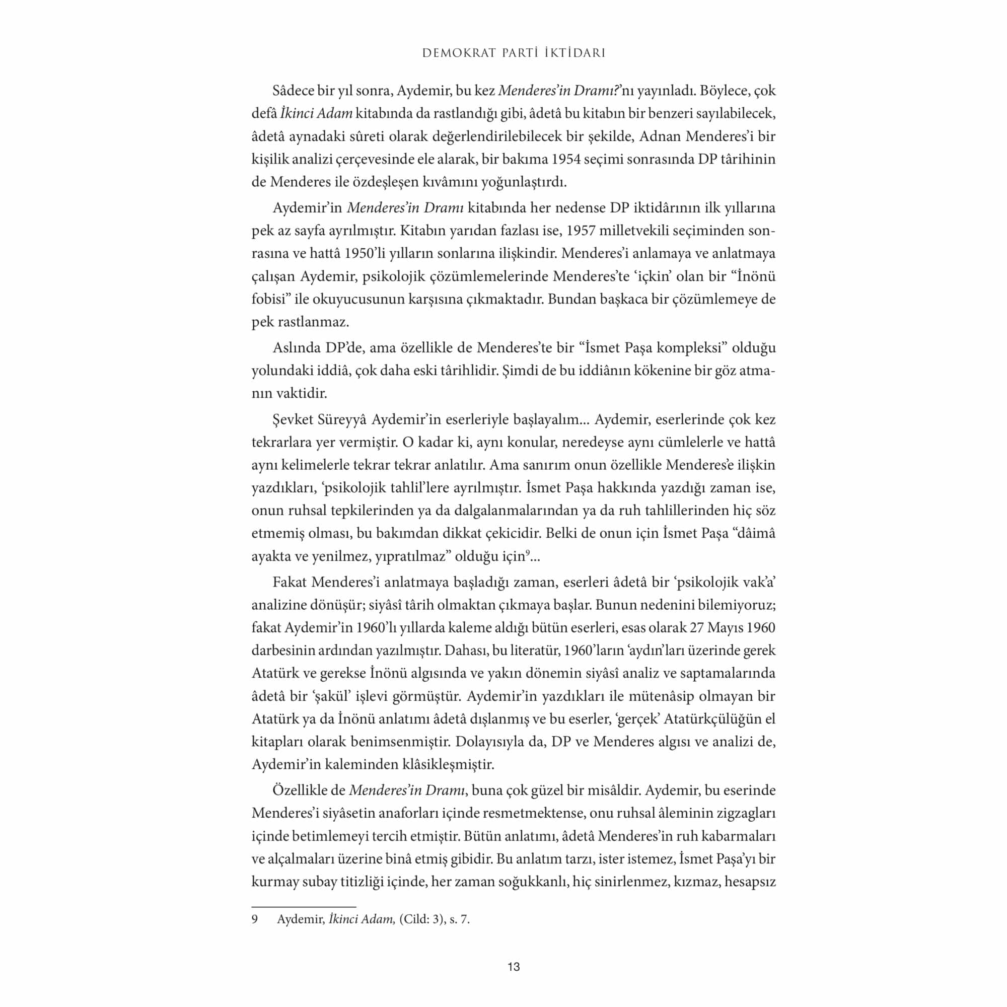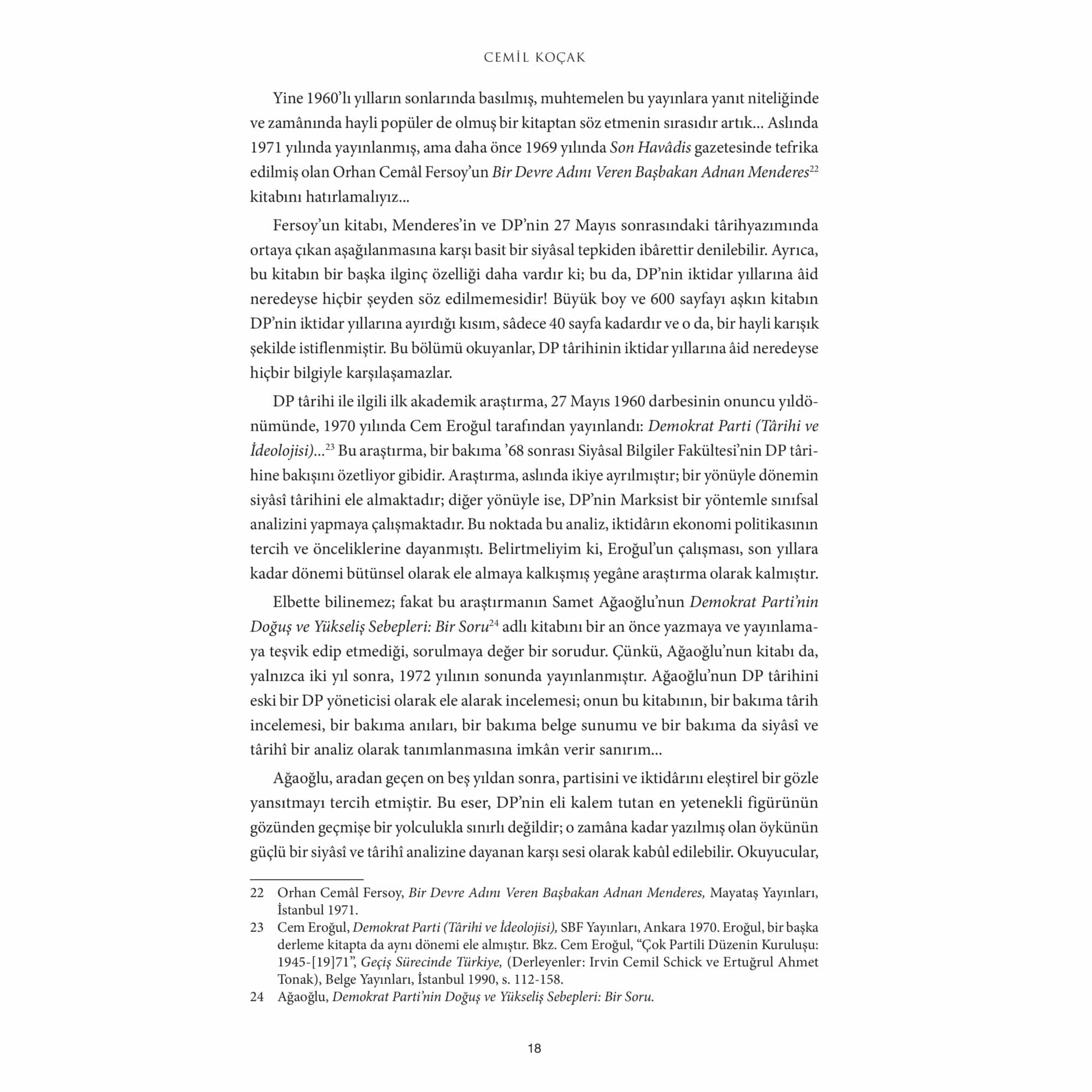 Cemil Koçak, yakın târih alanında yaptığı arkeolojik kazılarla resmî târihi ve onun nasıl oluşturulduğunu açıklayarak, unutulanları hatırlatıyor ve geçmişimizle yüzleşmemizi sağlıyor. Yakın târihimizle yüzleştiğimizde ise geçmişin resmî târih aracılığıyla hâfızalarımızdan nasıl silinmeye çalışıldığını meydana çıkarıyor. Koçak, bu çalışmasında genç Türkiye Cumhuriyeti’nin demokrasiyle imtihanı olan Demokrat Parti dönemini mercek altına alıyor. · Demokrat Parti’nin târihyazımımızdaki yeri... Bu dönemi hangi kalemler nasıl yazdı? · Demokrat Parti’nin iktidâra geçtiği 14 Mayıs 1950 gecesinden sonra neler yaşandı? · Kendisi de bu sonucu çok beklemediğini sonradan itiraf eden “yeni iktidâr”ın, yâni Demokrat Parti’nin şekillenme sürecinin ayrıntıları… · Peki Demokrat Parti iktidâra gelmeye hazır mıydı? · Siyâsî literatürdeki Bayar-Menderes ilişkisi ‘meselesi’nin tüm ayrıntıları… · Bir gün bile devlet hizmetinde yer almayan Adnan Menderes’in bu hizmetlerin en yüksek sorumluluk noktasında bulunması onu nasıl etkiledi? · Demokrat Parti’nin Başbakanı olarak Adnan Menderes… · Rakamlarla Demokrat Parti’nin seçim vaadleri ve sonuçları… · Halkevleri kapatıldı mı gerçekten? Halkevleri meselesi ve ardında yatanlar… · Demokrat Parti iktidârının milliyetçi-muhafazakâr-İslâmcı ve bu eksendeki gruplar açısından bir ‘cennet’ olduğu düşüncesi ne kadar doğruydu? Cemil Koçak, Demokrat Parti Meclis Grubu zabıtlarını ilk kez bütünüyle ele aldığı Demokrat Parti İktidârı (1950-1960) üst başlıklı serisinin ilk kitabı Demokratlar ve Halkçılar (1950-1954)'te öncelikle iktidârı ele alıyor; ardından da muhalefeti; yâni hem CHP’yi, hem Millet Partisi’ni (MP) ve hem de Türkiye Köylü Partisi’ni (TKP)... Yazarın asıl amacı, iktidârla muhalifleri arasındaki “çatışmalar”ı bir bütünlük içinde yansıtmaya çalışırken siyâsî anlaşmazlıkların karşılıklı etkilerini ve tepkilerini aynı bütünsellik içinde gösterebilmektir. Bu bakımdan zaman zaman ve belki de sık sık kronolojik târih anlatımından ayrılıyor; aksine, tematik bir bütünlüğün oluşmasına gayret ediyor. Temaların ve kronolojinin sarmalı içinde kalırken; dönemin “ruh”unu aktarmayı arzu ediyor aslında...