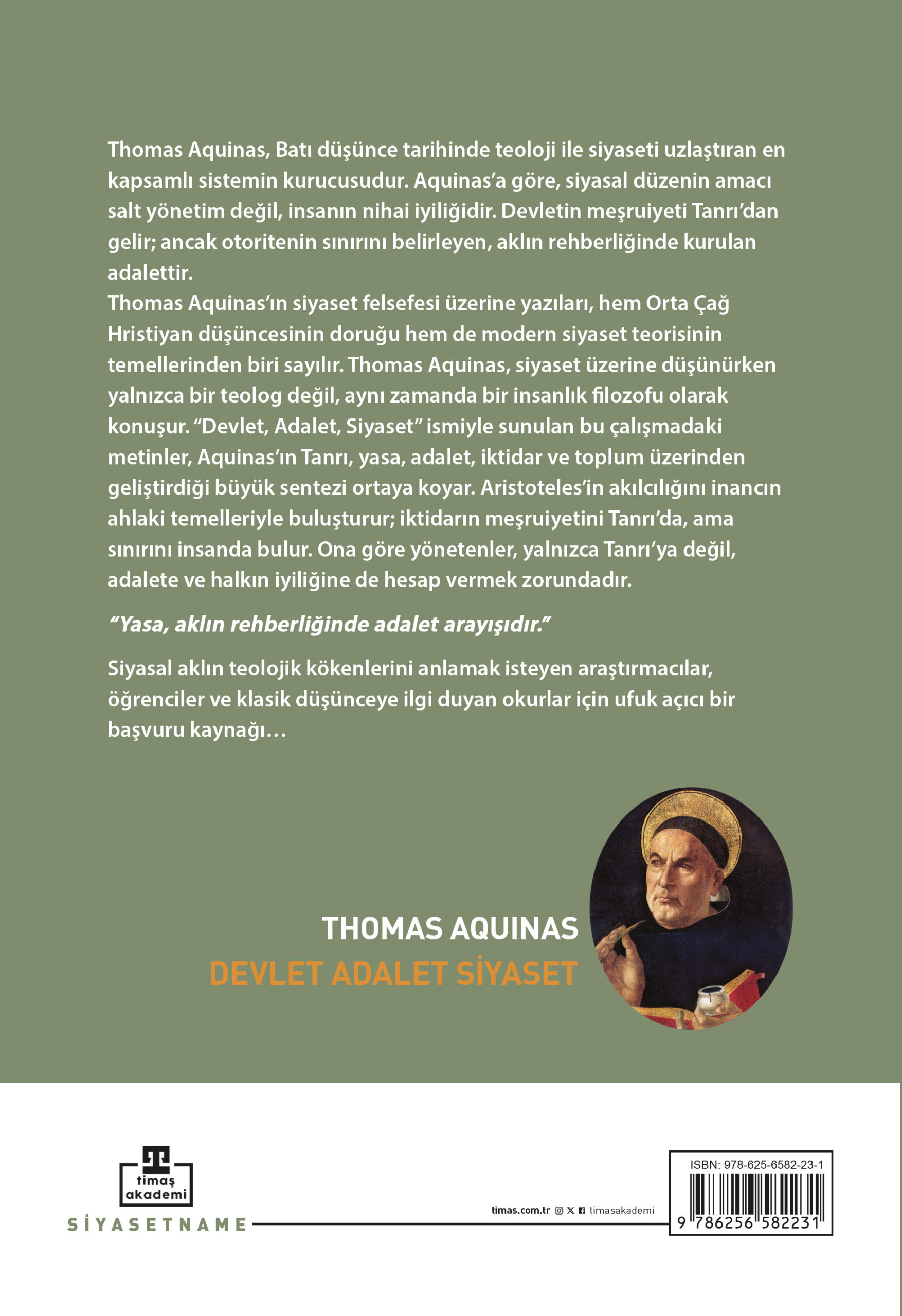 Thomas Aquinas, Batı düşünce tarihinde teoloji ile siyaseti uzlaştıran en kapsamlı sistemin kurucusudur. Aquinas’a göre, siyasal düzenin amacı salt yönetim değil, insanın nihai iyiliğidir. Devletin meşruiyeti Tanrı’dan gelir; ancak otoritenin sınırını belirleyen, aklın rehberliğinde kurulan adalettir. Thomas Aquinas’ın siyaset felsefesi üzerine yazıları, hem Orta Çağ Hristiyan düşüncesinin doruğu hem de modern siyaset teorisinin temellerinden biri sayılır. Thomas Aquinas, siyaset üzerine düşünürken yalnızca bir teolog değil, aynı zamanda bir insanlık filozofu olarak konuşur. “Devlet, Adalet, Siyaset” ismiyle sunulan bu çalışmadaki metinler, Aquinas’ın Tanrı, yasa, adalet, iktidar ve toplum üzerinden geliştirdiği büyük sentezi ortaya koyar. Aristoteles’in akılcılığını inancın ahlaki temelleriyle buluşturur; iktidarın meşruiyetini Tanrı’da, ama sınırını insanda bulur. Ona göre yönetenler, yalnızca Tanrı’ya değil, adalete ve halkın iyiliğine de hesap vermek zorundadır. “Yasa, aklın rehberliğinde adalet arayışıdır.” Siyasal aklın teolojik kökenlerini anlamak isteyen araştırmacılar, öğrenciler ve klasik düşünceye ilgi duyan okurlar için ufuk açıcı bir başvuru kaynağı…