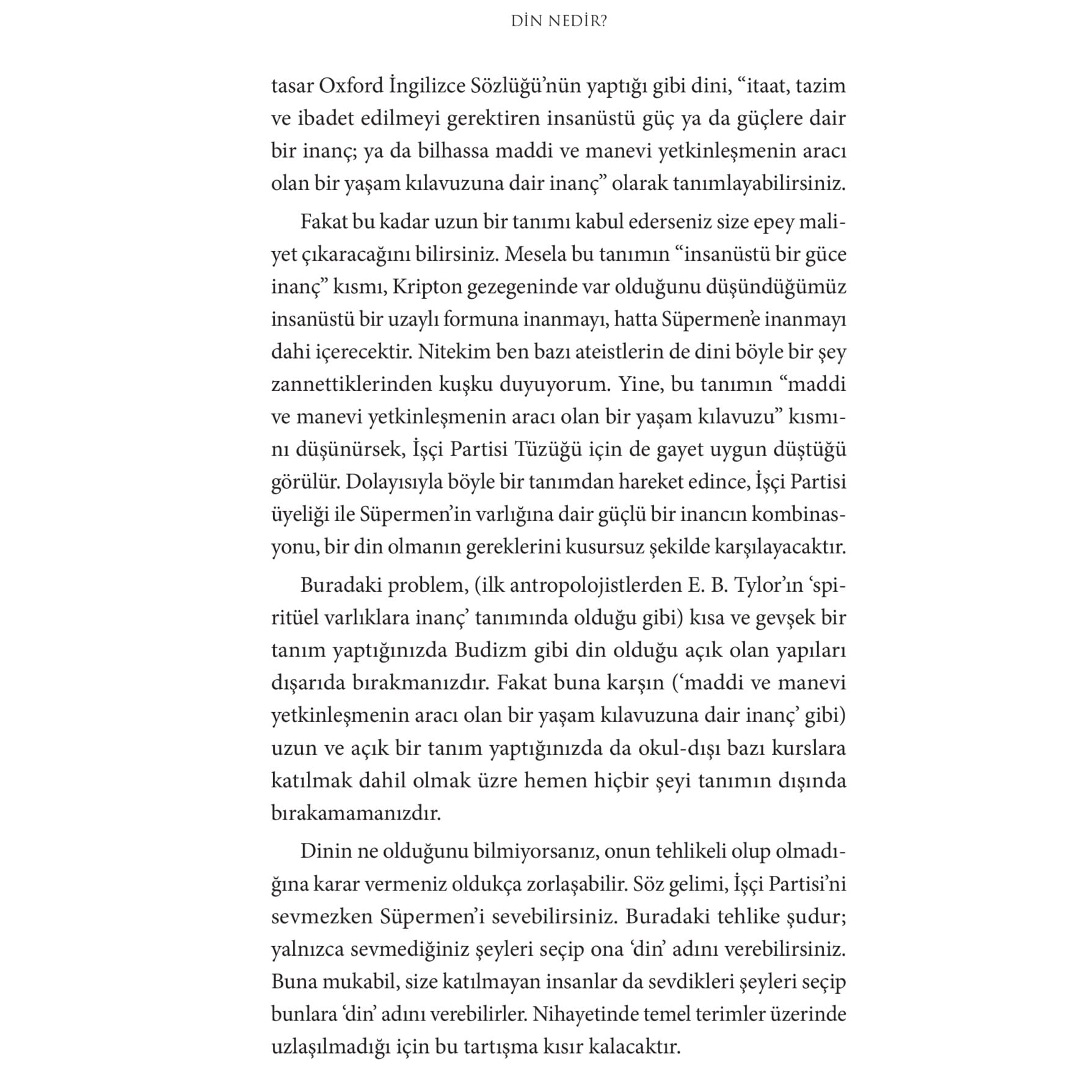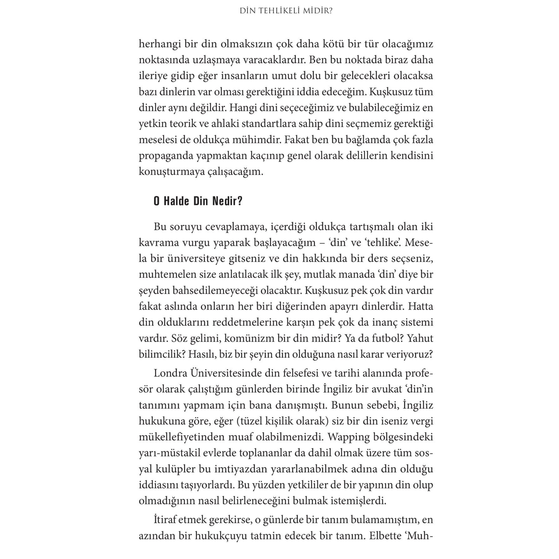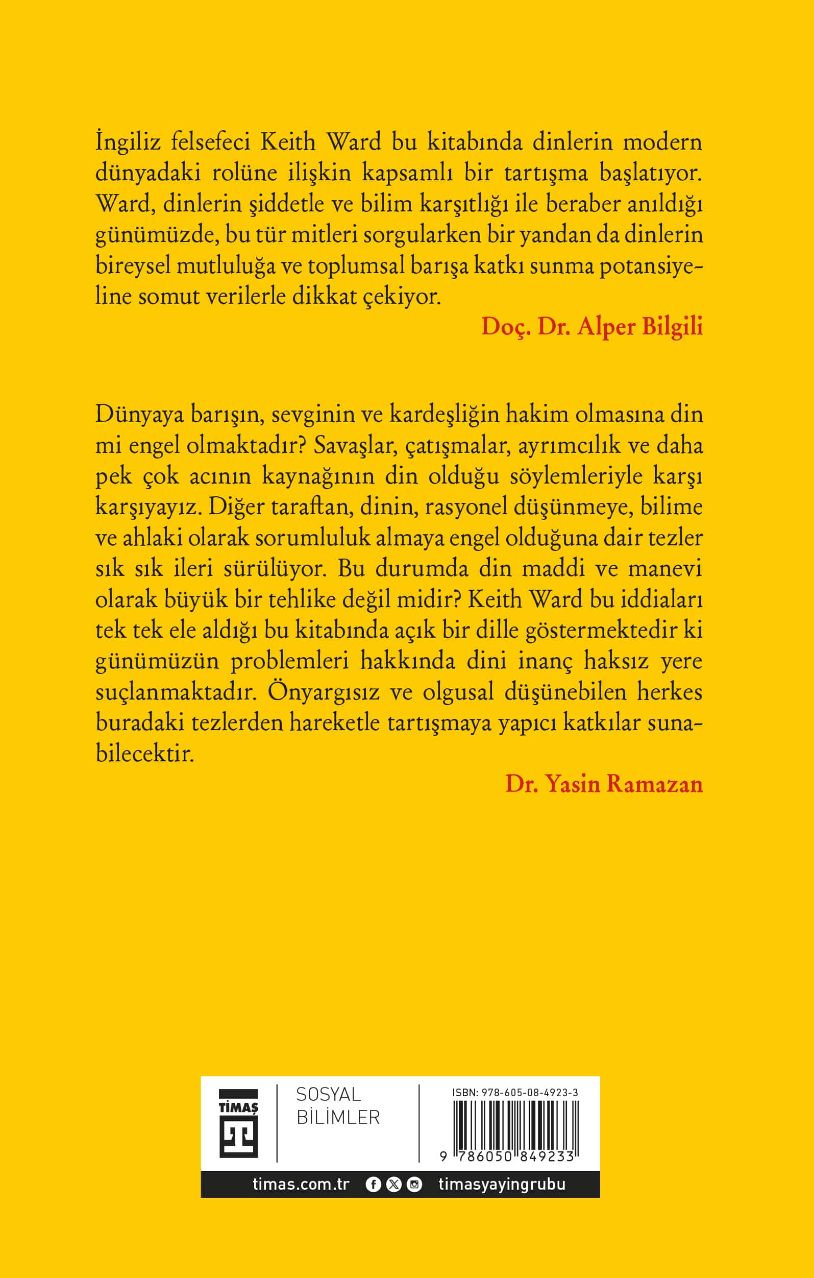 İngiliz felsefeci Keith Ward bu kitabında dinlerin modern dünyadaki rolüne ilişkin kapsamlı bir tartışma başlatıyor. Ward, dinlerin şiddetle ve bilim karşıtlığı ile beraber anıldığı günümüzde, bu tür mitleri sorgularken bir yandan da dinlerin bireysel mutluluğa ve toplumsal barışa katkı sunma potansiyeline somut verilerle dikkat çekiyor. Doç. Dr. Alper Bilgili Dünyaya barışın, sevginin ve kardeşliğin hakim olmasına din mi engel olmaktadır? Savaşlar, çatışmalar, ayrımcılık ve daha pek çok acının kaynağının din olduğu söylemleriyle karşı karşıyayız. Diğer taraftan, dinin, rasyonel düşünmeye bilime ve ahlaki olarak sorumluluk almaya engel olduğuna dair tezler sık sık ileri sürülüyor. Bu durumda din maddi ve manevi olarak büyük bir tehlike değil midir? Keith Ward bu iddiaları tek tek ele aldığı bu kitabında açık bir dille göstermektedir ki günümüzün problemleri hakkında dinî inanç haksız yere suçlanmaktadır. Önyargısız ve olgusal düşünebilen herkes buradaki tezlerden hareketle tartışmaya yapıcı katkılar sunabilecektir. Dr. Yasin Ramazan