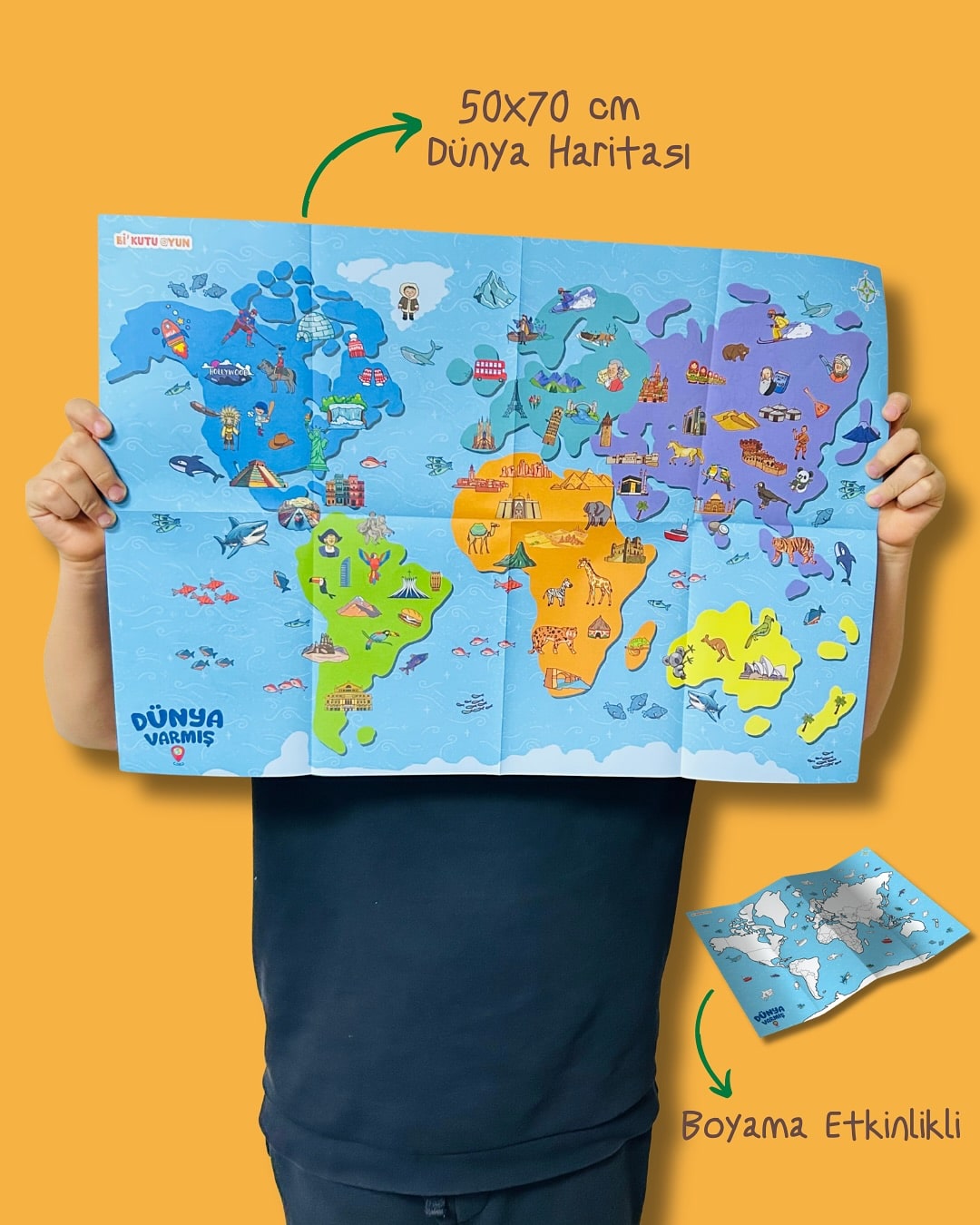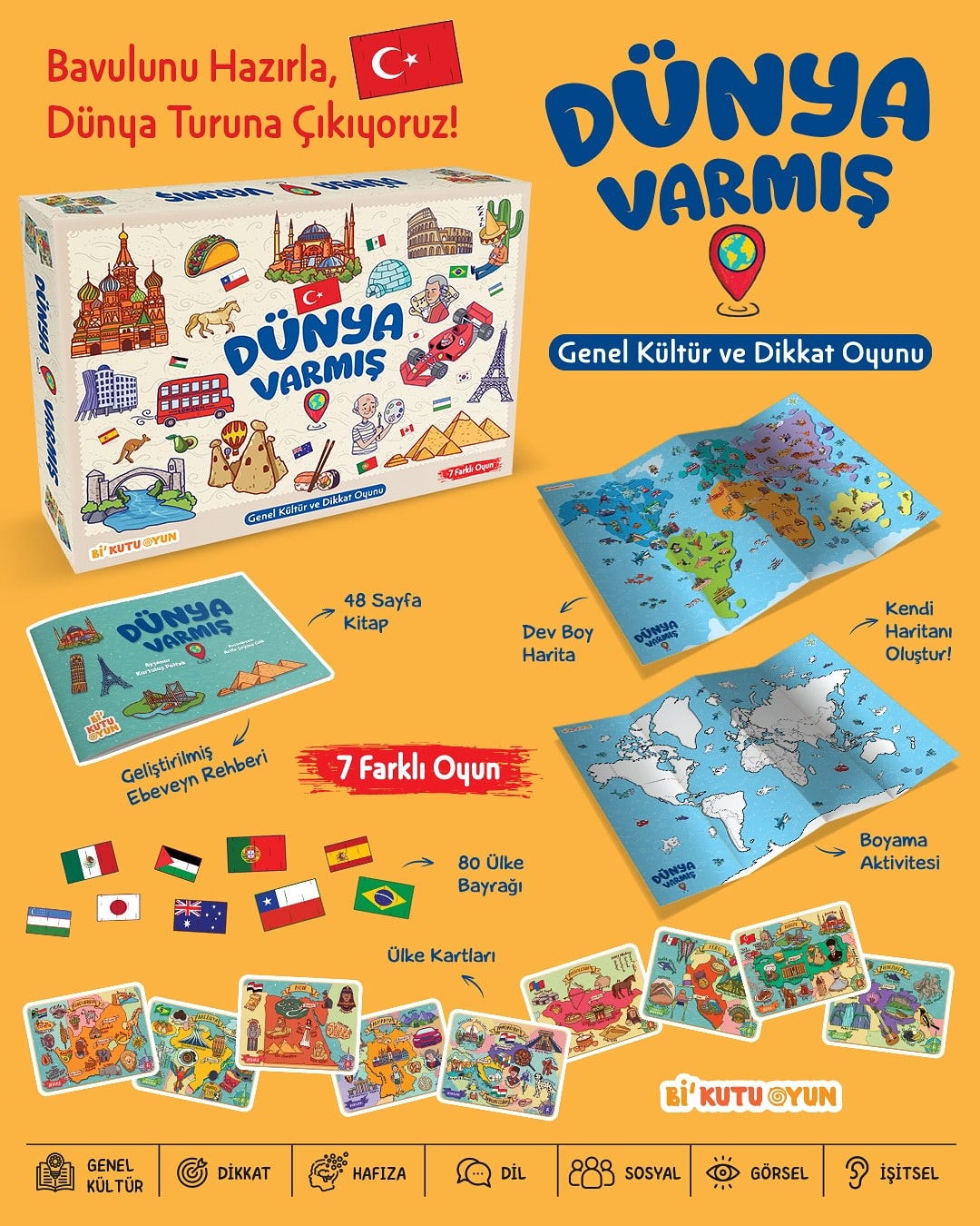 Bavulunu Hazırla, Dünya Turuna Çıkıyoruz! Ülkeler, bayraklar, bilim insanları ve doğa harikaları… Keşfedilecek koca bir dünya bu kutunun içinde seni bekliyor! Dünya Varmış, meraklı kâşifleri eğlenceli bir bilgi yolculuğuna çıkarıyor. Sadece dünyayı tanımakla kalmayacak; oynadıkça genel kültürünü, dikkatini ve hafızanı da güçlendireceksin. Sormayı, düşünmeyi ve araştırmayı asla bırakmayanlar için: Oyun başlasın!