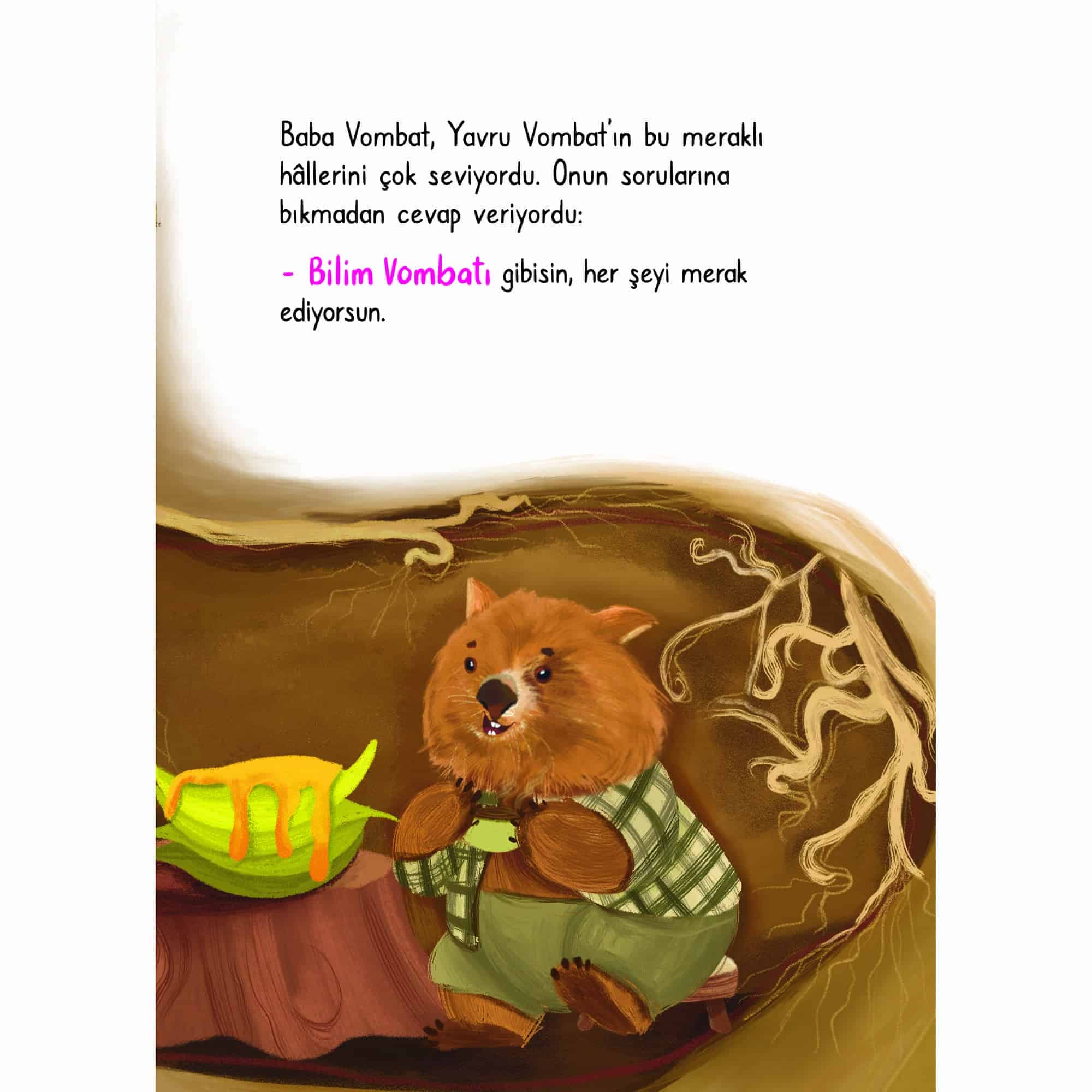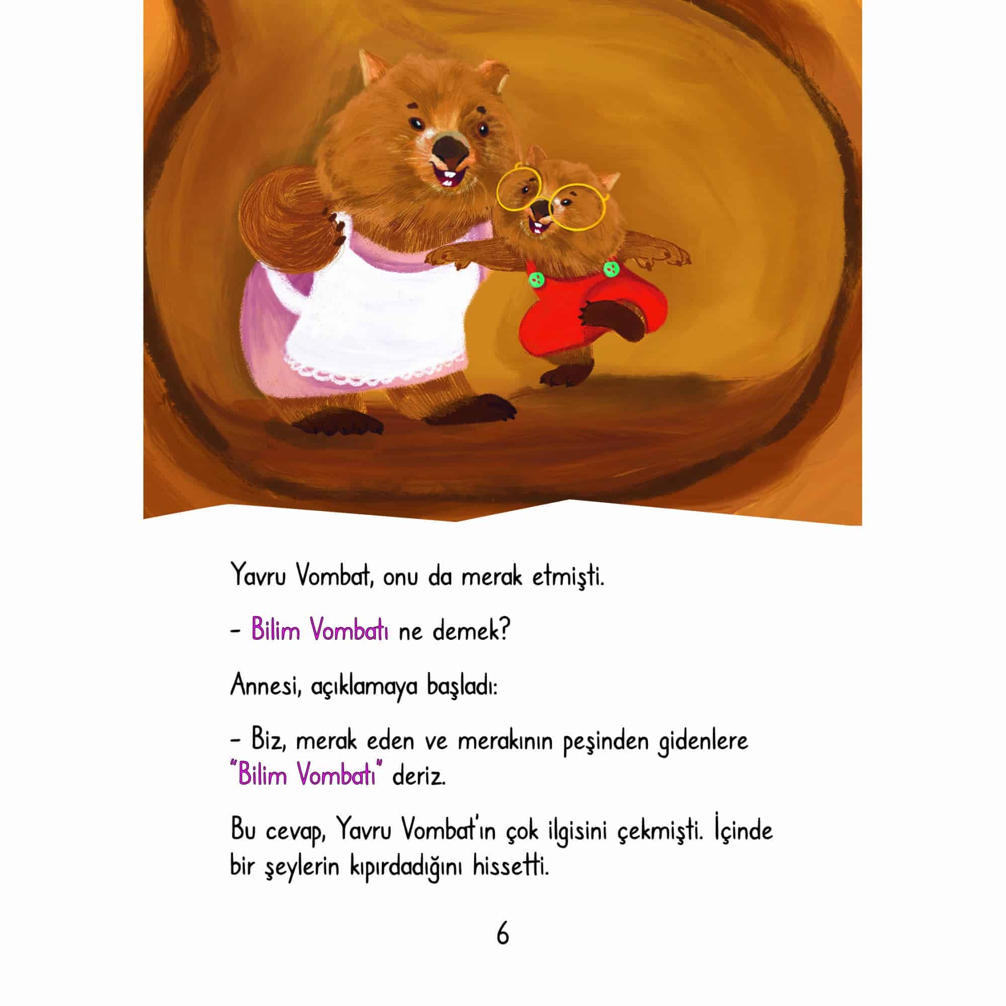 Vombat dünyanın en korkak hayvanı! Hatta korkudan anında bayılıveriyor. Ancak bilime olan merakı ve araştırma hevesi onu cesaretlendiriyor.Vombat’ın bitmek bilmeyen soruları vardır. Bu soruların peşine düşerek “Bilim Vombatı” olmanın hayallerini kurmaktadır. Böylece çılgın bir keşif yolculuğuna atılır.