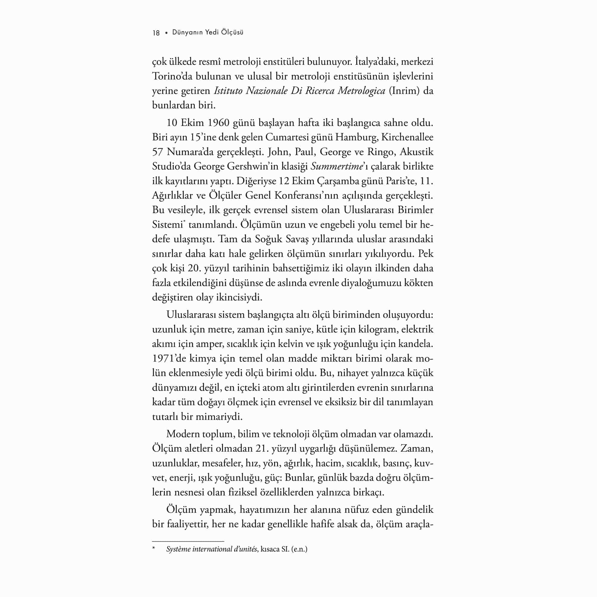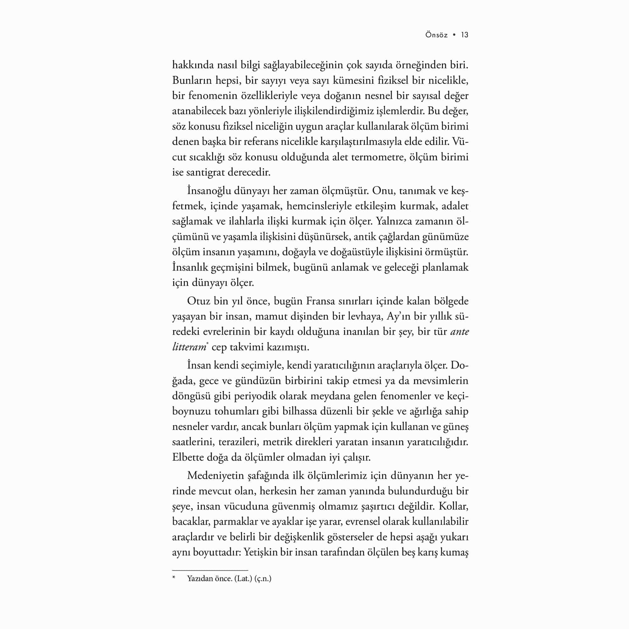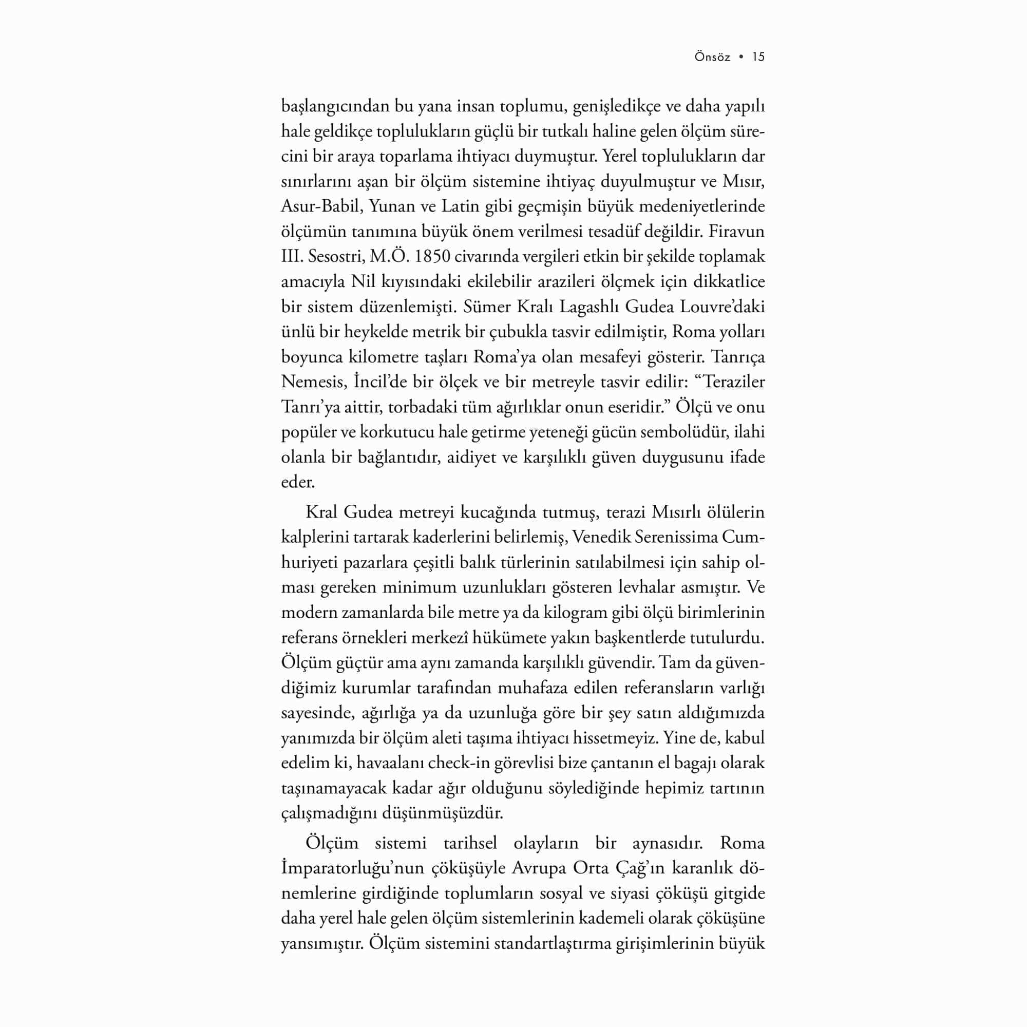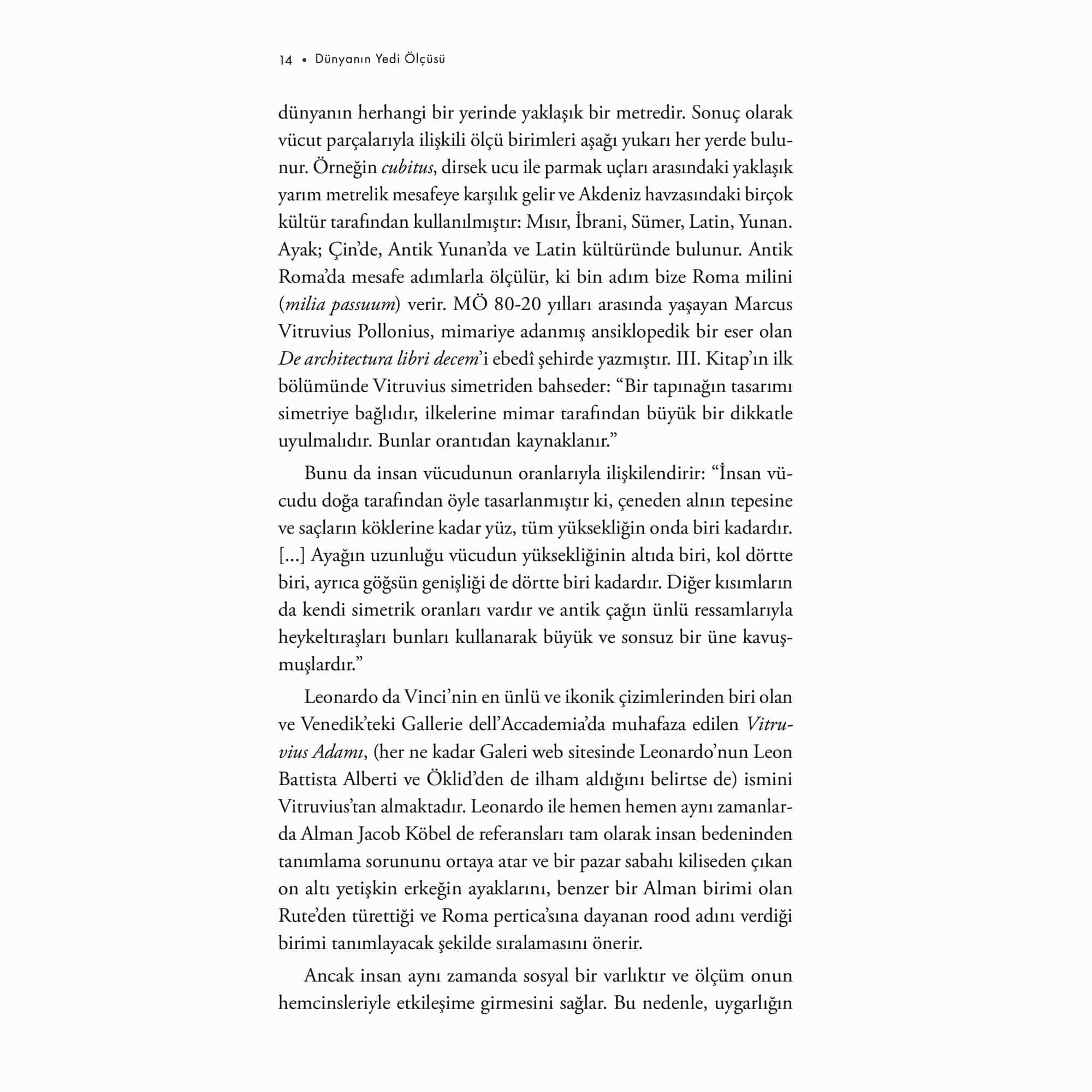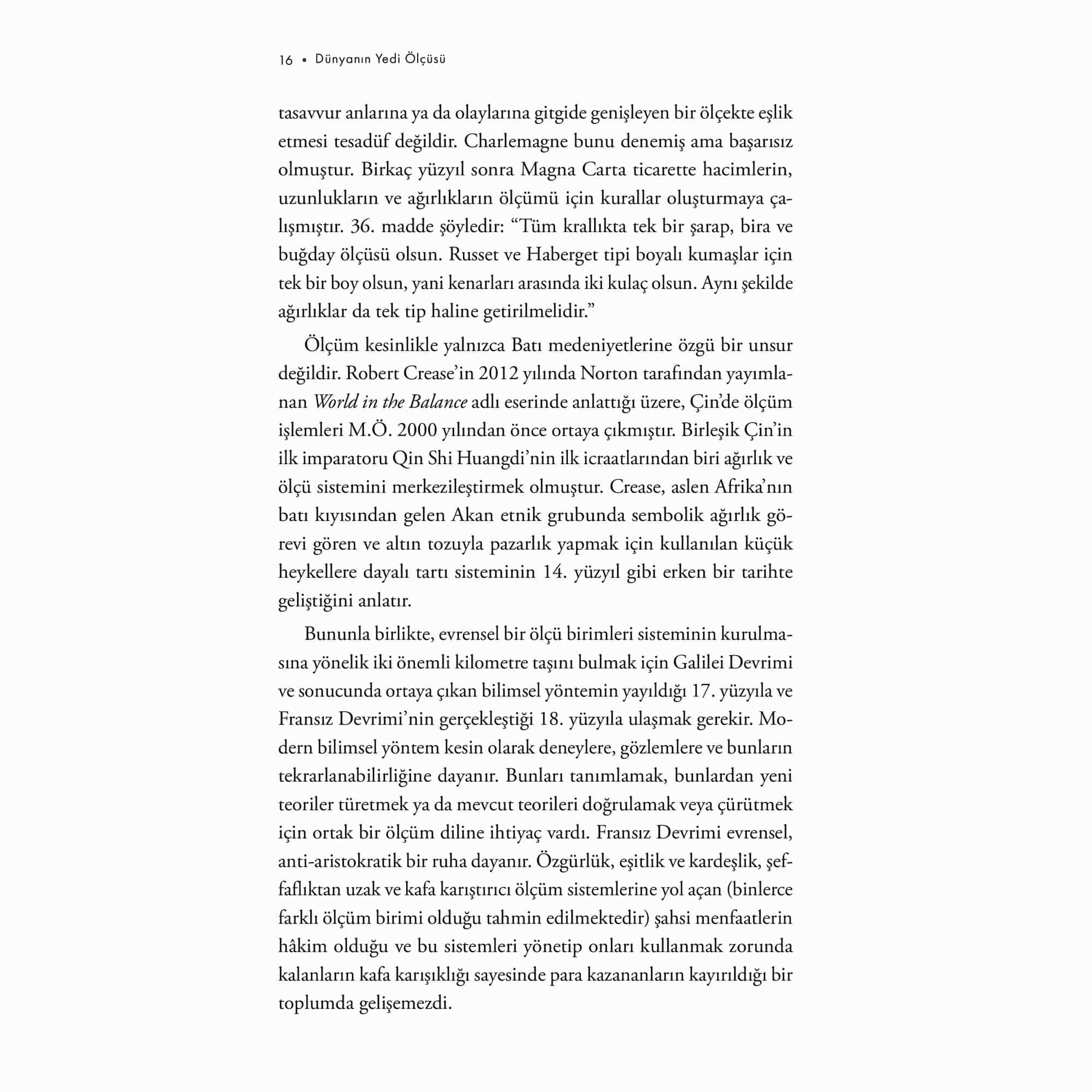 Tarihin başlangıcından bu yana yaptığımız ölçümler, evren, toplum ve doğaüstüne dair anlayışımızı şekillendirerek dünya deneyimimizin ayrılmaz bir parçası haline geldi. İtalyan fizikçi Piero Martin bu kitapta okuru insanlığın ortak kültür hazinelerinden yedi temel ölçünün; metrenin, saniyenin, kilogramın, kelvinin, amperin, molün ve kandelanın hikâyesinin merkezde olduğu bir yolculuğa çıkarıyor. Her bölümde bir ölçüm sisteminin tarihçesini, işlevini, uygulanış biçimini anlatırken aynı zamanda her bir birimin klasik fizikten kuantum mekaniğine, görelilikten kimyaya, kozmolojiden temel parçacık fiziğine ve tıptan modern teknolojiye kadar bilime nasıl katkıda bulunduğunu açıklıyor. Dünya’nın aslında bu ölçülerle ne kadar büyüdüğünü ve küçüldüğünü gözler önüne seriyor; sonsuz küçükten sonsuz büyüğe uzanan bu serüvende insan olarak yerimizi bir kez daha düşünmemizi sağlıyor. “Piero Martin’in keyifli kitabı, yedi ölçü biriminin gelişimini insan hikâyeleriyle birleştiriyor. Her hikâye lezzetli bir lokma –ve ben hepsini bir oturuşta silip süpürdüm.” –Steven Cowley, Princeton Plazma Fiziği Laboratuvarı Direktörü “Dünyanın Yedi Ölçüsü şimdiden rekor kırdı: Yale University Press, çeviri haklarını daha kitap çıkmadan satın aldı. Bu göz ardı edilebilecek bir gerçek değil. Üstelik Amerikalıların, bilim insanlarının kapasitesi ve kitaplarını dünya genelinde yayma güçleri düşünüldüğünde, yabancı fizikçilerin yazdığı kitapları tercüme etmeleri alışılmış bir durum değildir. Ama bu sefer hayal gerçek oldu.” –Il Gazzettino