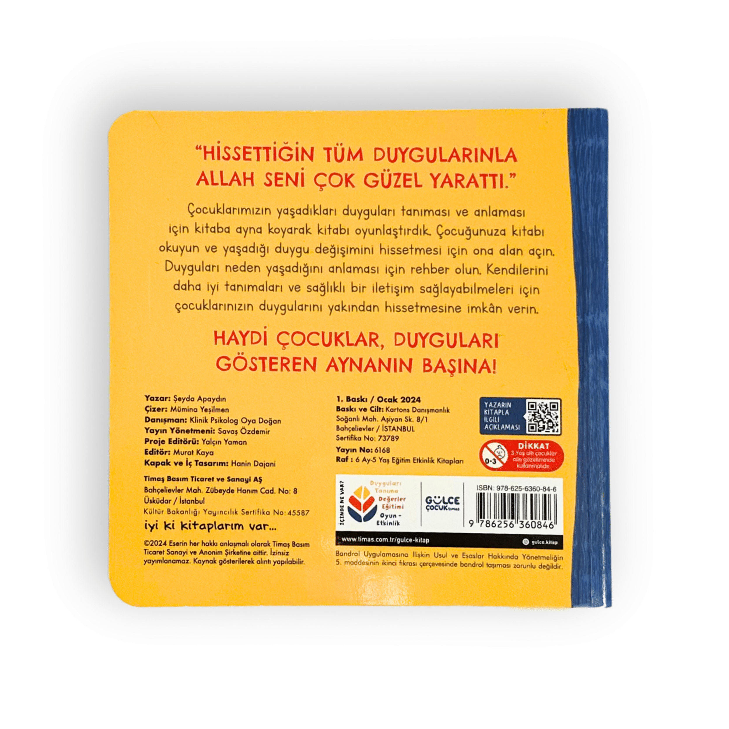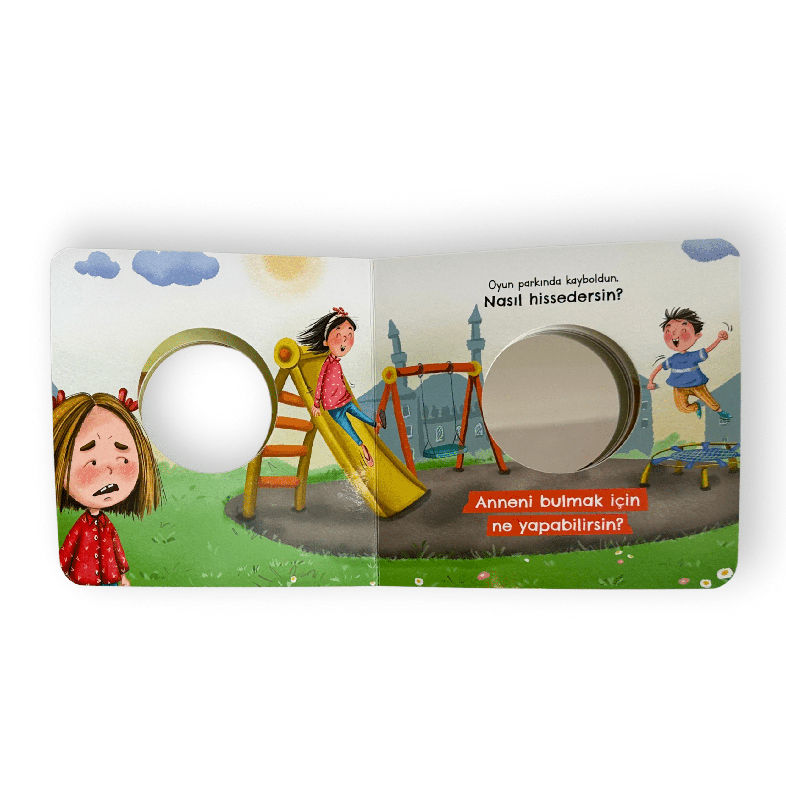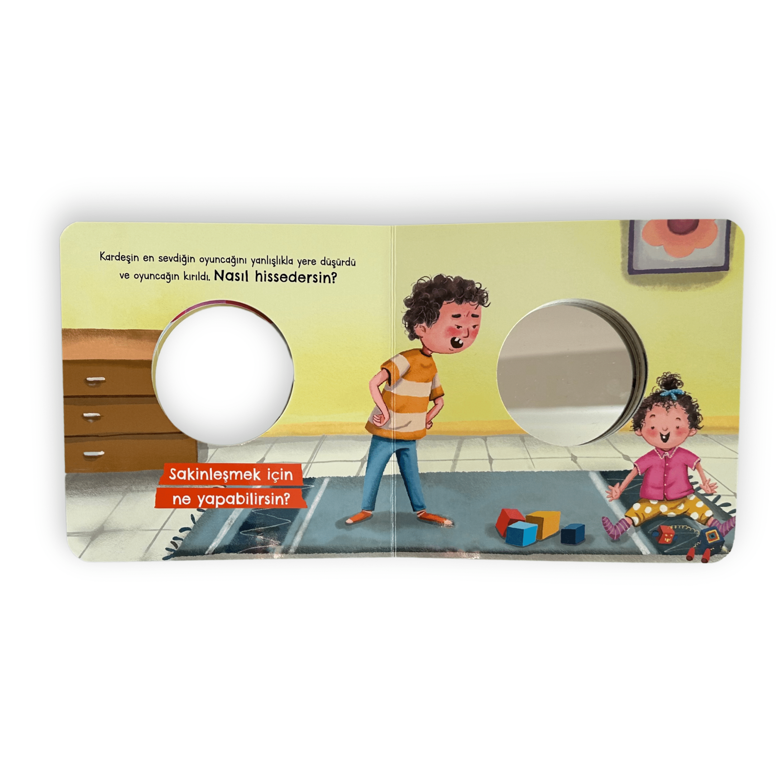 "HİSSETTİĞİN TÜM DUYGULARINLA ALLAH SENİ ÇOK GÜZEL YARATTI." Çocuklarımızın yaşadıkları duyguları tanıması ve anlaması için kitaba ayna koyarak kitabı oyunlaştırdık. Çocuğunuza kitabı okuyun ve yaşadığı duygu değişimini hissetmesi için ona alan açın. Duyguları neden yaşadığını anlaması için rehber olun. Kendilerini daha iyi tanıması ve sağlıklı bir sosyal hayat için çocuklarınızın duygularını yakından hissetmesine imkan verin. HAYDİ DUYGULARI GÖSTEREN AYNANIN BAŞINA!