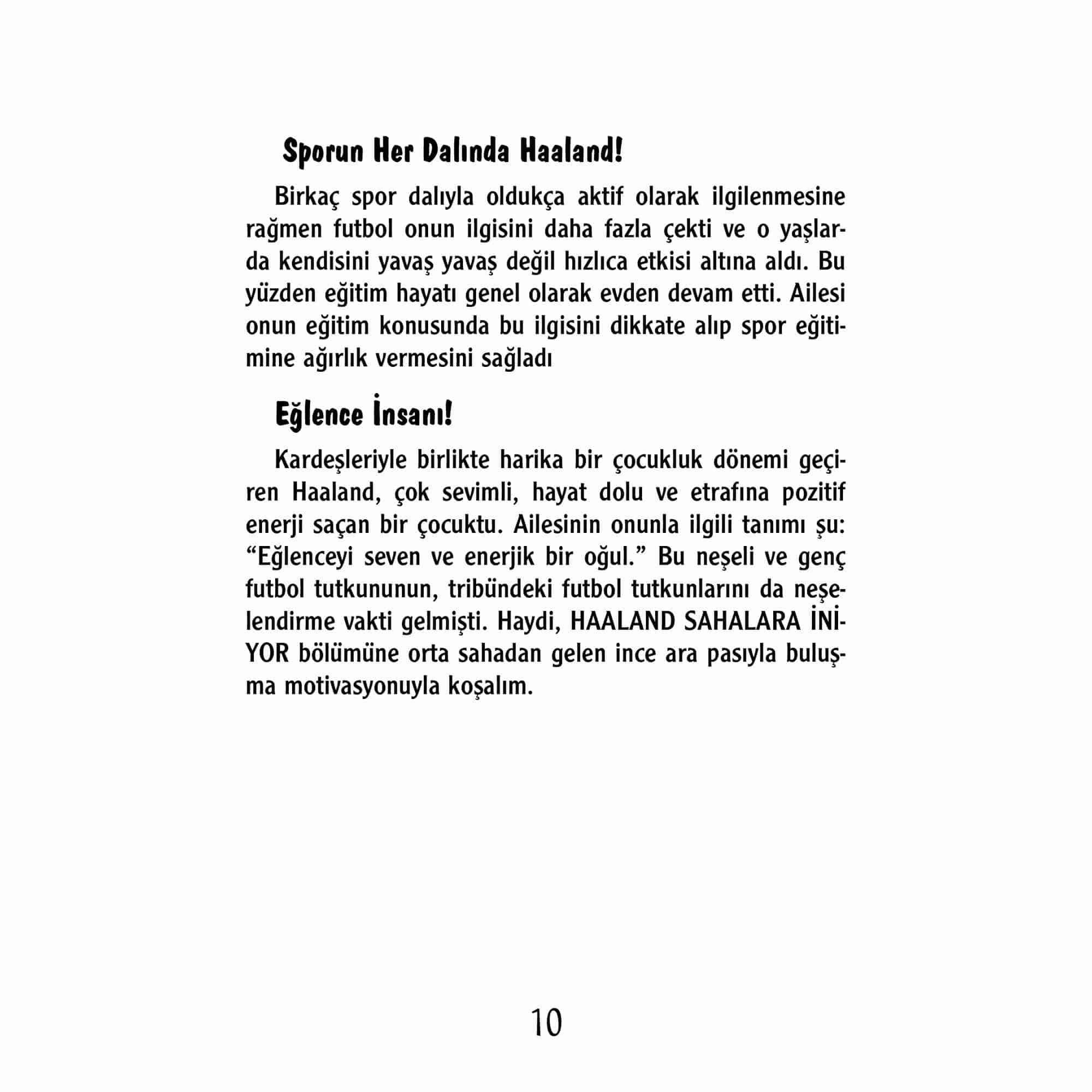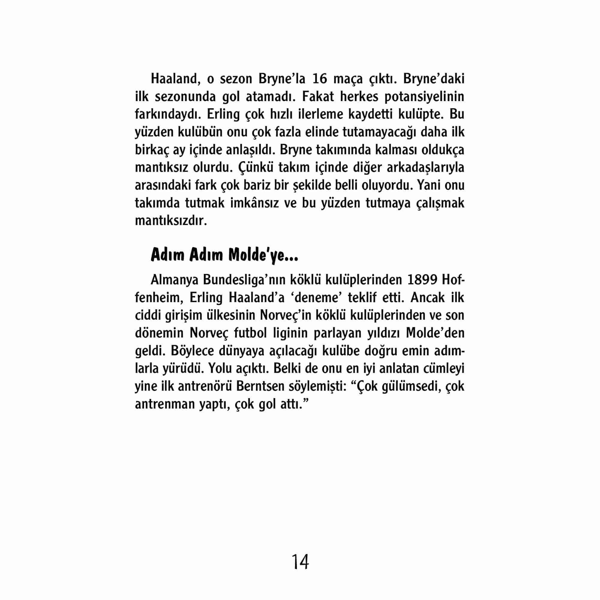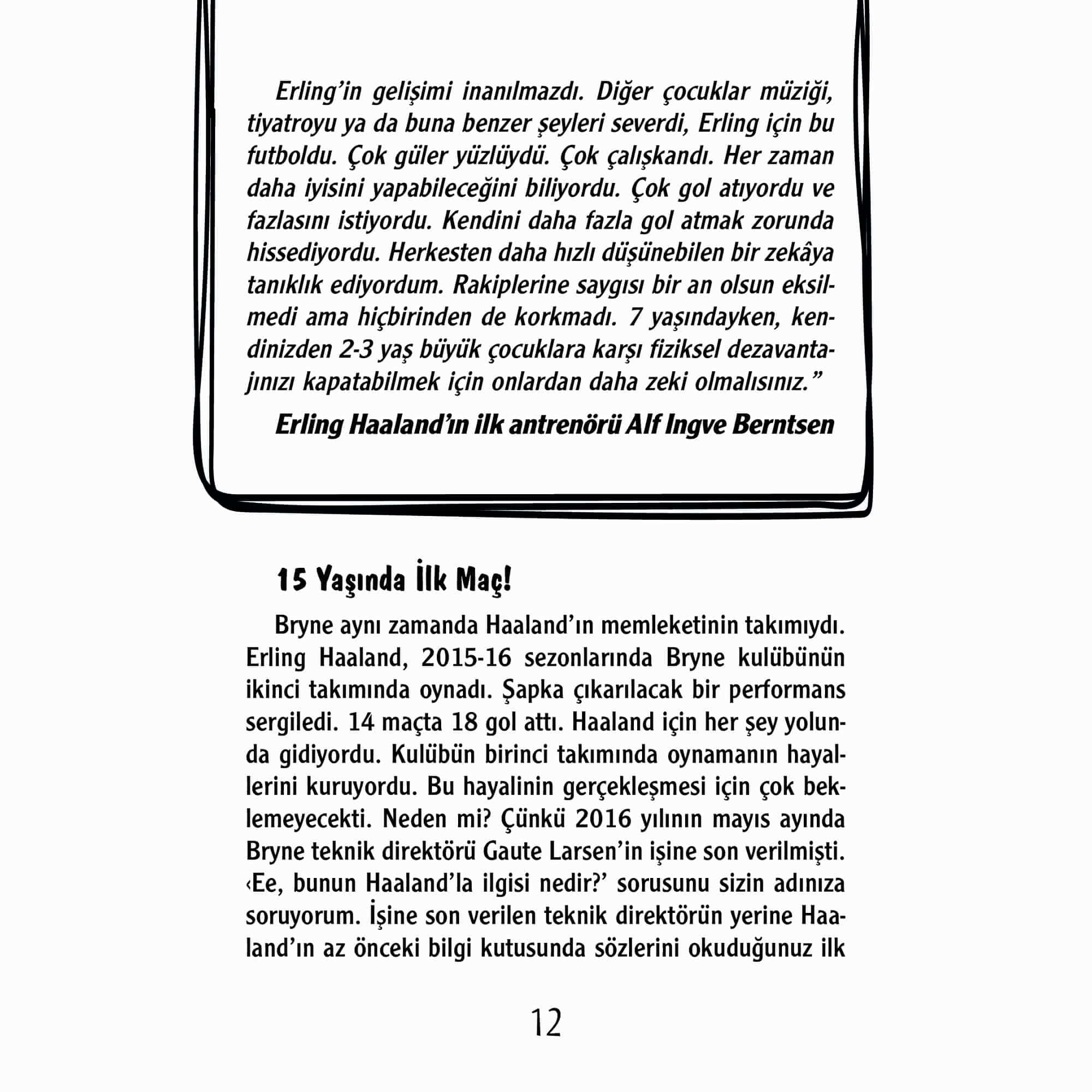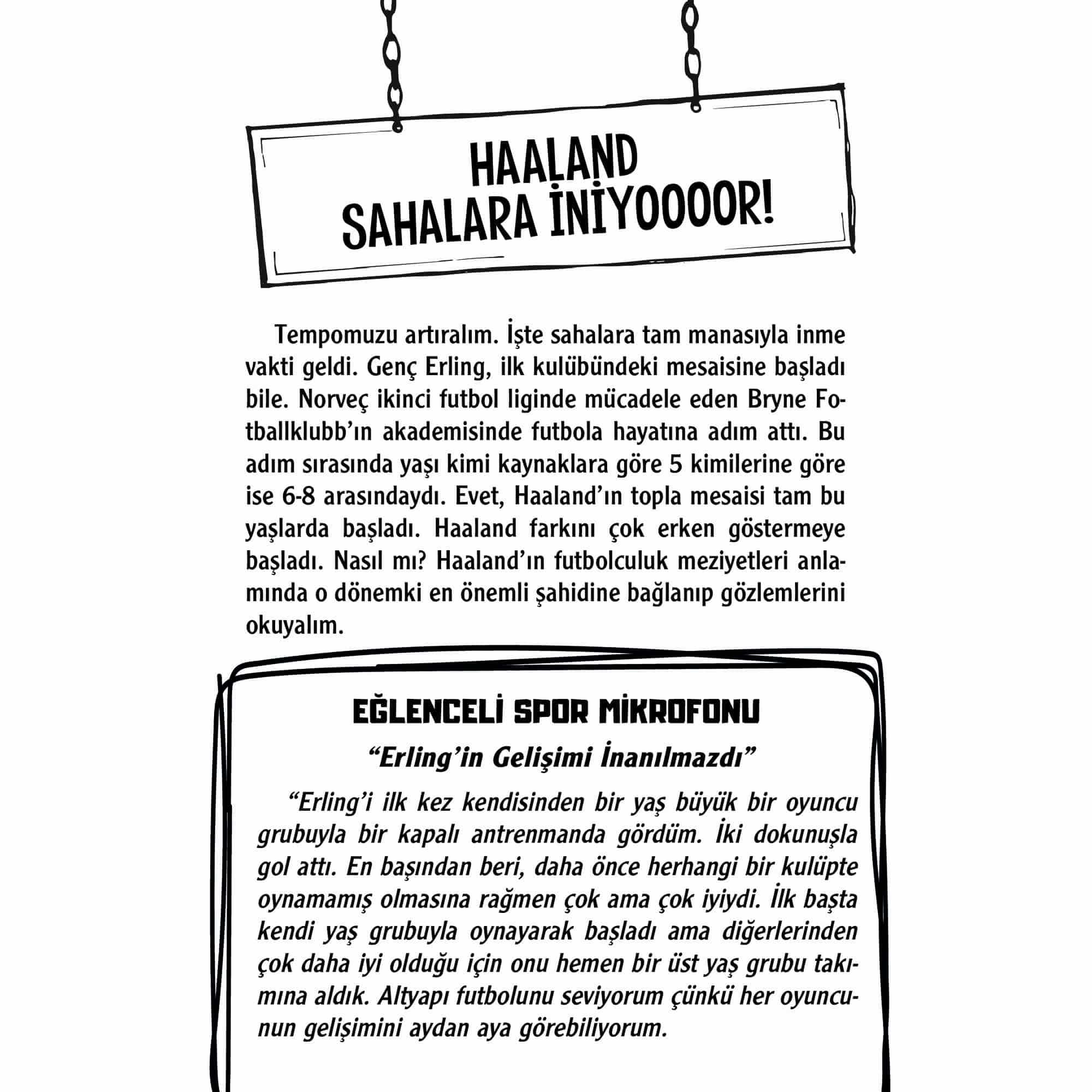 Bu kitapla, çocuklar dünya futbol tarihinin en önemli futbolcularından biri olma yolunda emin adımlarla yol alan Erling Haaland'ın daha çocuk yaşlarda hayallerinin peşinden koşmak için verdiği mücadeleyi öğrenecek. Başarı merdivenlerini çıkarken gösterdiği disiplin çocuklara ve gençlere ilham olacak. Çocukların gözündeki değeri, bu kitaptaki gerçek hikâyelerle birleşince oldukça önemli bir sıcaklık sağlanacaktır. Bu anlamda Haaland'ın, titizlikle ve onlarca yerli ve yabacı kaynaktan yararlanılarak kaleme alınan hayatı, referans niteliği de taşıyor. Kitap; mücadele, azim, kararlılık, çalışma, disiplin, saygı ve spor sevgisi kazanımları içinde barındırıyor.