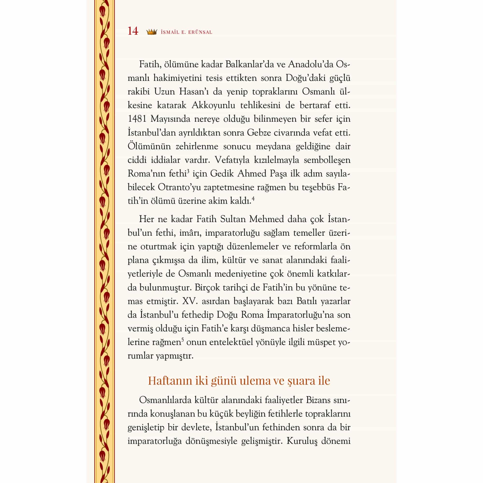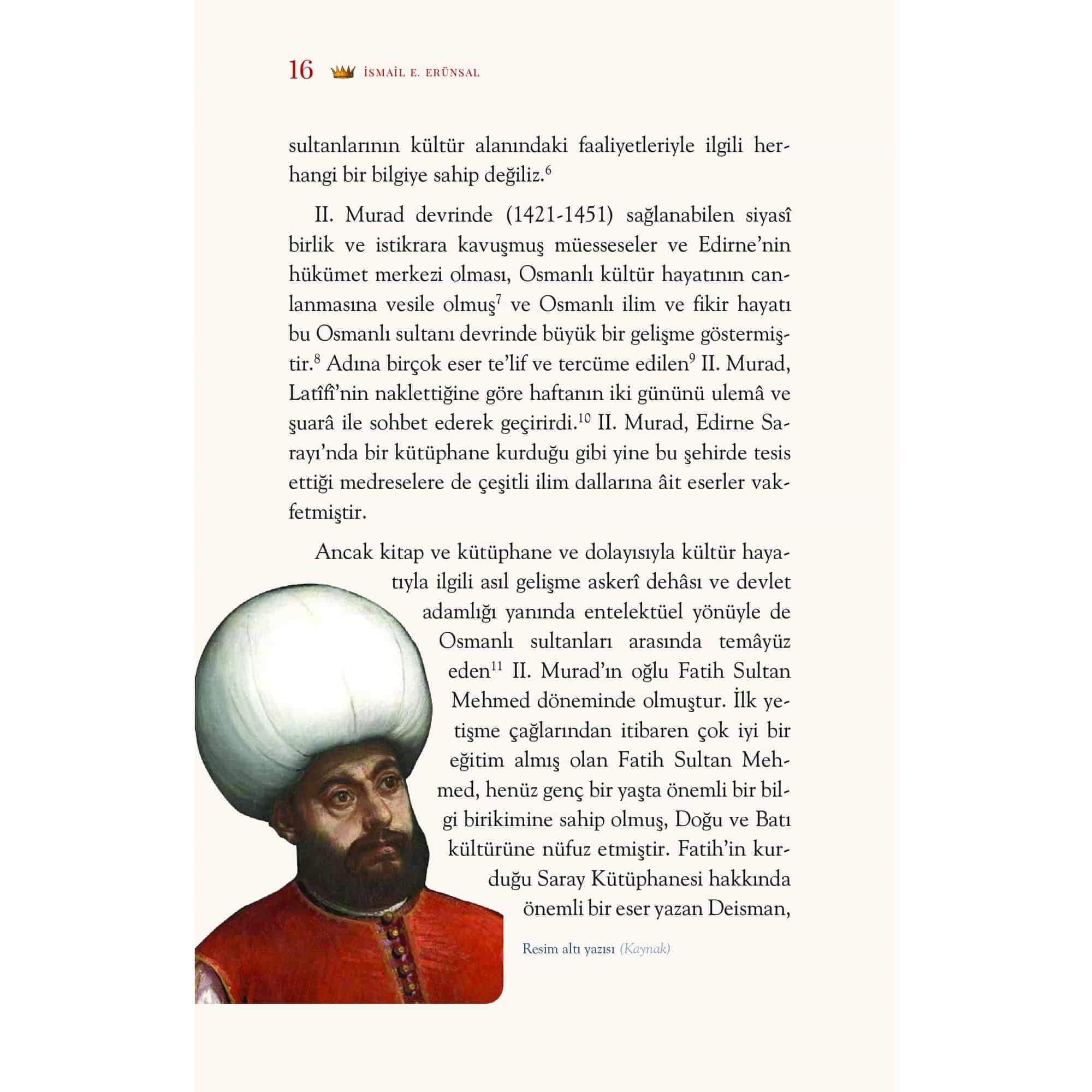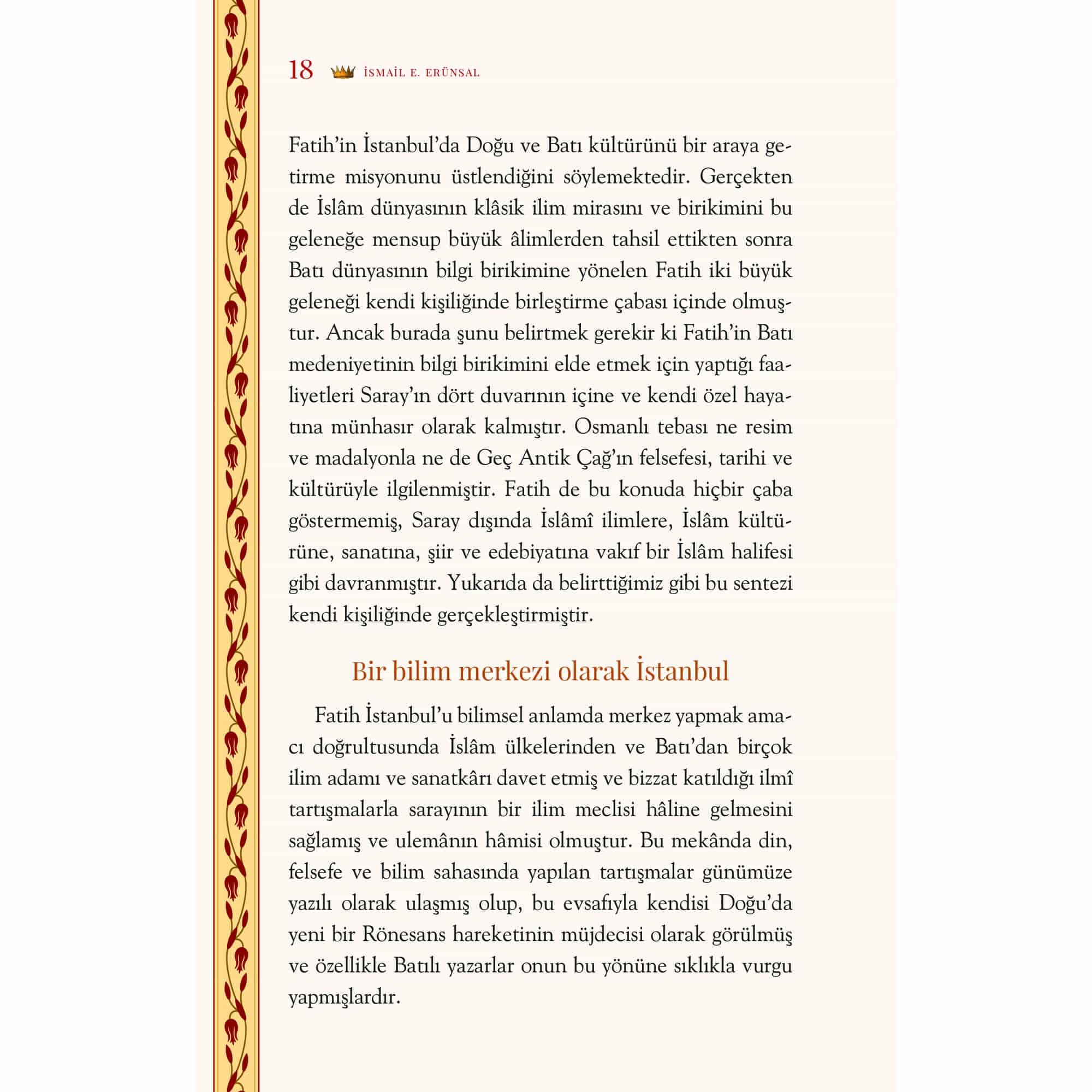 Fatih Sultan Mehmed, 1453 yılında İstanbul’u fethettiğinde kurmak istediği dünya imparatorluğunun başkentini aynı zamanda bir kültür merkezi haline getirmeyi amaçlıyordu. Çok genç yaşta Doğu ve Batı kültürüne hâkim olan Fatih, bir yandan İslâm bir yandan da eski Yunan ve Roma’nın kültür mirasıyla yakından ilgileniyordu. Her gün Büyük İskender’in hayatını dinleyen, dönemin ulemasının dinî konularda yaptığı sohbetlere katılan, kütüphanesi için İlyada Destanı’nın bir nüshasını hazırlatan, “din ve felsefe münasebetleri” konusundaki önemli iki âliminden birer eser yazmalarını isteyen aynı Fatih’tir. Topkapı Sarayı’nda kurduğu kütüphanede İslâm dininin ve kültürünün en önemli kaynakları yanında Grekçe, Latince, Ermenice, Süryanice, İtalyanca ve İbranice yazılmış yazma eserler de mevcuttu. Prof. Dr. İsmail E. Erünsal, Fatih’in Entelektüel Portresi’nde hiçbir Osmanlı padişahı ile kıyaslanamayacak bu büyük hükümdara, ilgilerini, meraklarını ve kütüphanelerini merkeze alarak yakından bakmayı deniyor.