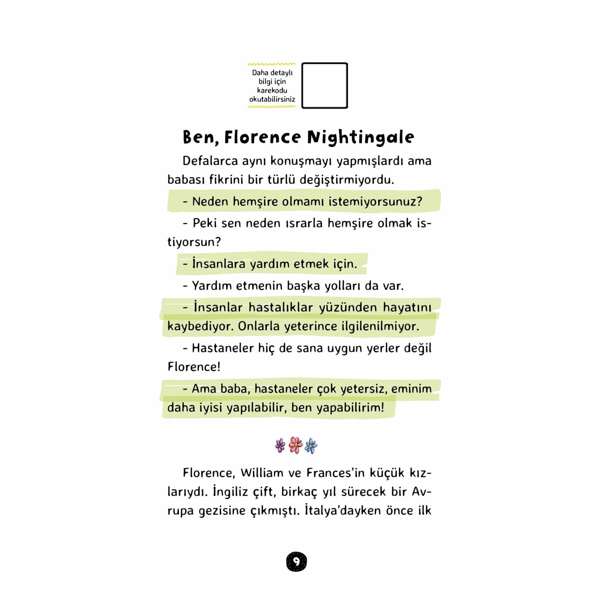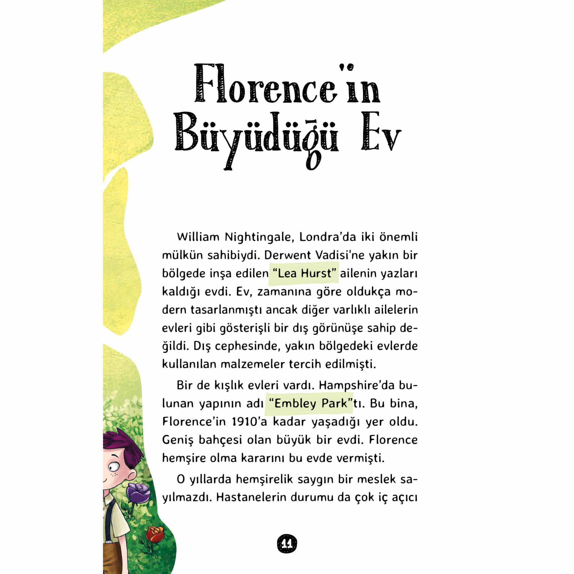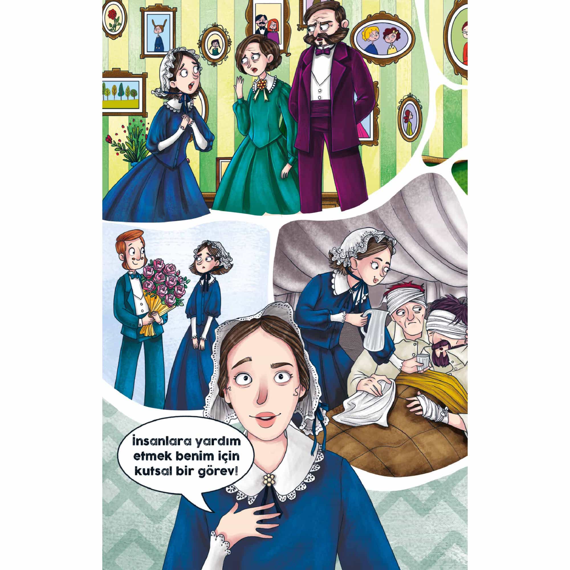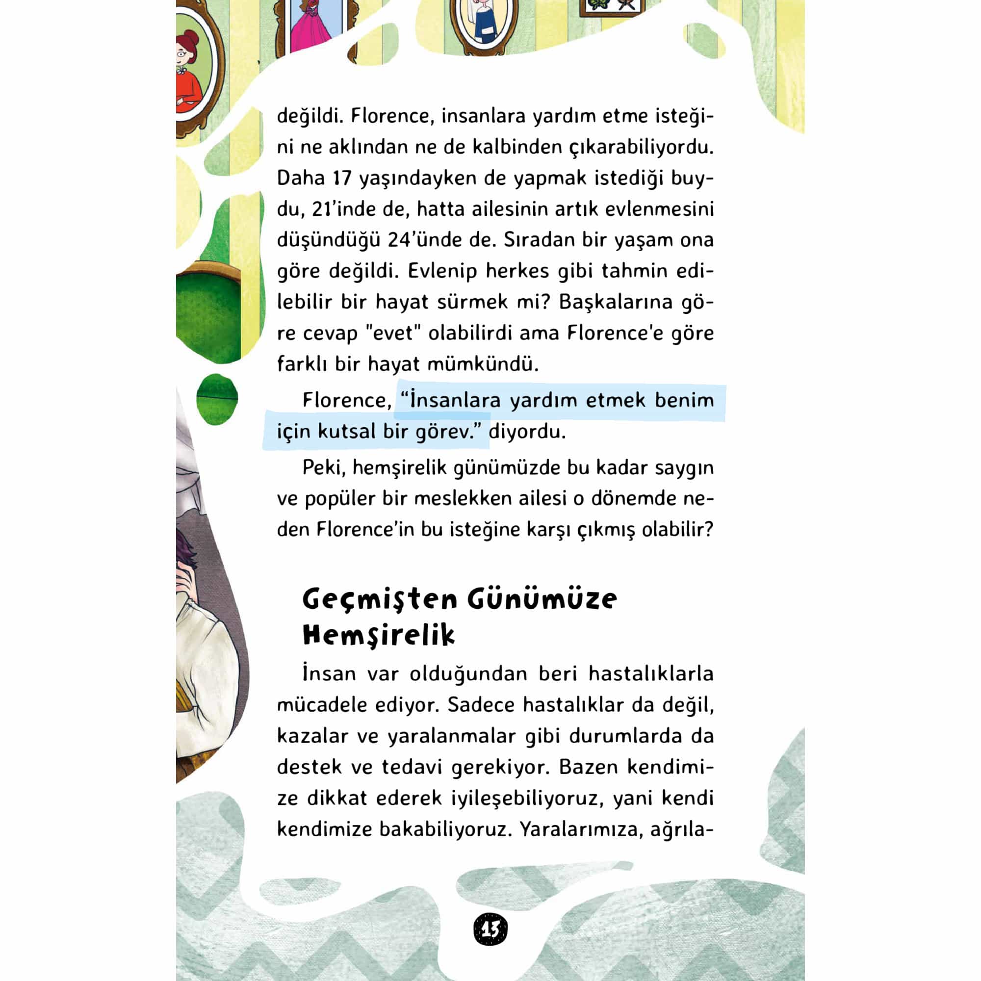 Sıradan bir yaşam ona göre değildi. Hemşireliğin iyi bir meslek olarak anılmadığı günlerde ailesine karşı çıkarak tutkusunun peşinden gitti. Yardımseverliği, merhameti ve azmiyle takdir topladı. Savaş yıllarında ülke değiştirerek askerlere baktı. Hastanelerin temizlik koşullarını iyileştirdi ve bir çığır açarak modern hemşireliği kurdu. İngiliz Liyakat Nişanı’nı alan ilk kadın olarak tarihe geçti. Çalışmaktan ve araştırmaktan asla vazgeçmeyen, hayatını yardım etmeye adayan, onlarca kadına güç veren bir hemşire, Florence Nightingale.