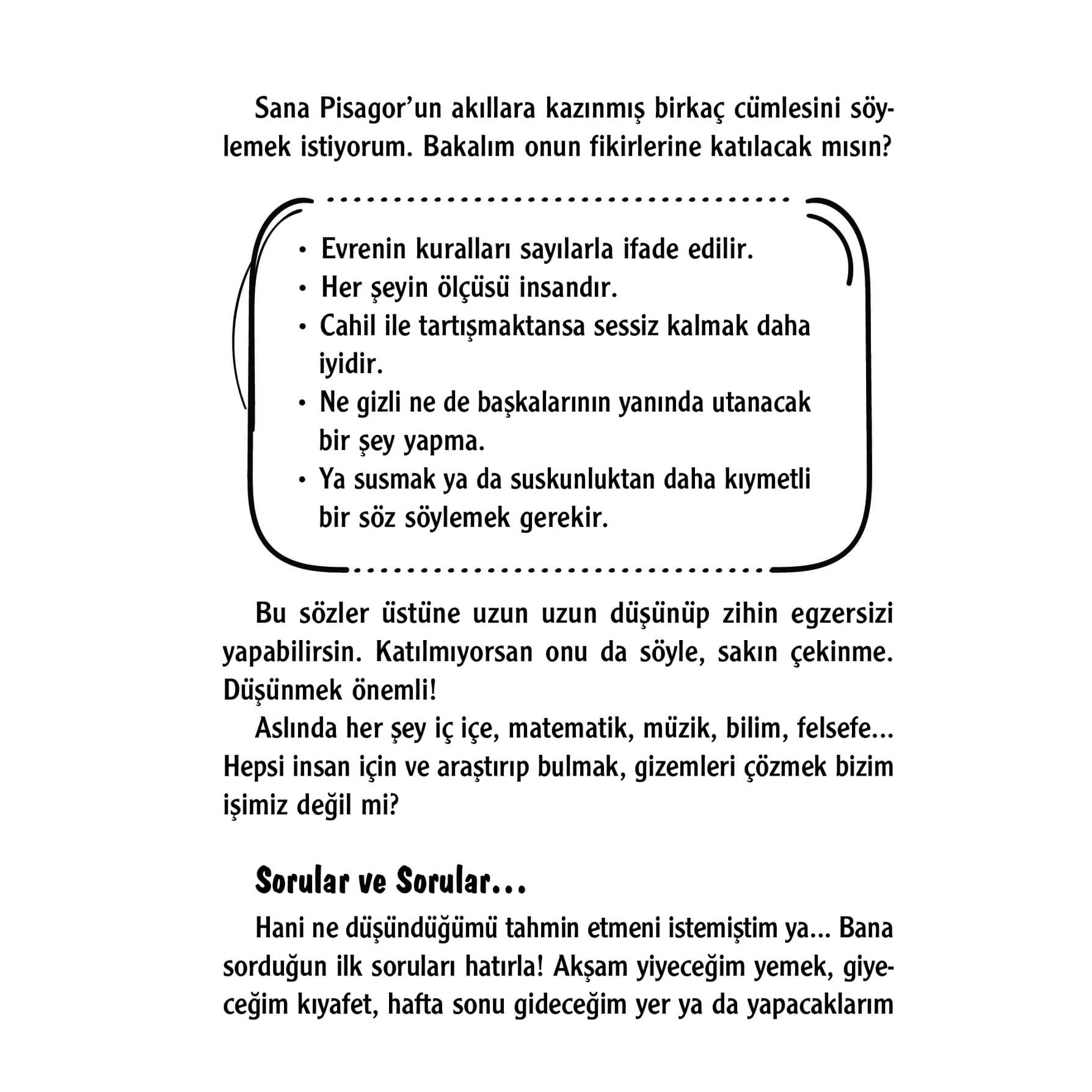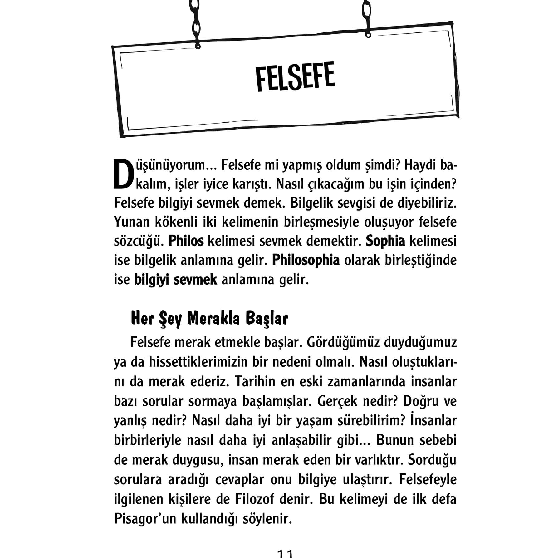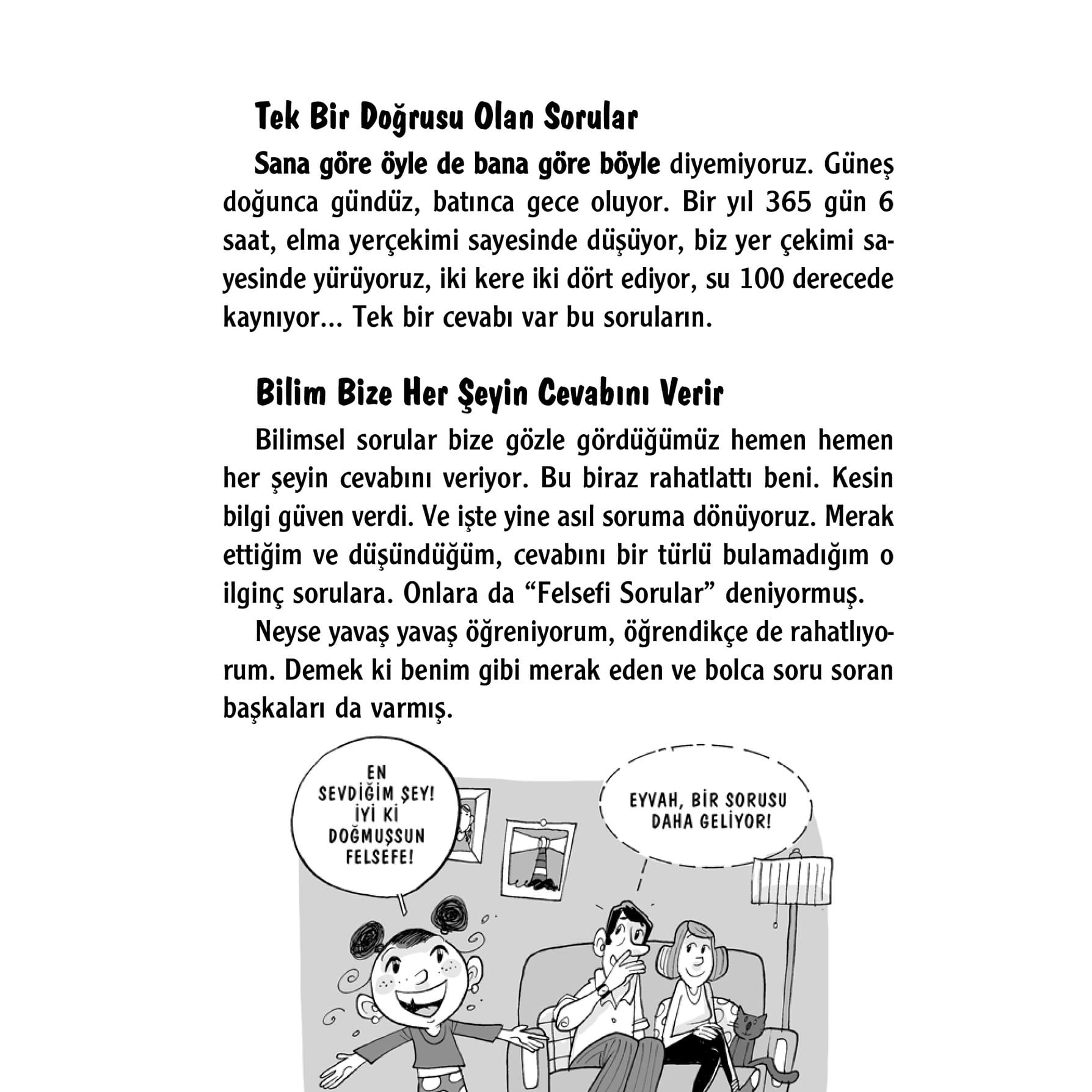Bu kitapta, tarihin en büyük düşünürlerinin yaşamlarına konuk olacaksın. Sokrates’ten Pisagor’a, Farabi’den Descartes’e, Biruni’den Thales’e, Aristo’dan İbni Sina’ya çok sayıda düşünürle yakından tanışacaksın. Filozofların maceralarıyla dolu hikâyelerini keşfederken sen de büyük sorular sormaya başlayacaksın. Belki geleceğin filozofu olma yolunda ilk adımı atmış olacaksın. Merak etmenin ve düşünmenin inanılmaz sana nasıl kapılar açtığının şaşırarak farkına varacaksın. Filozoflar, dünyaya farklı gözlerle bakmayı severler. Kim bilir, bu kitabı okuduktan sonra kendi muhteşem sorularını sormaya başlayacaksın!