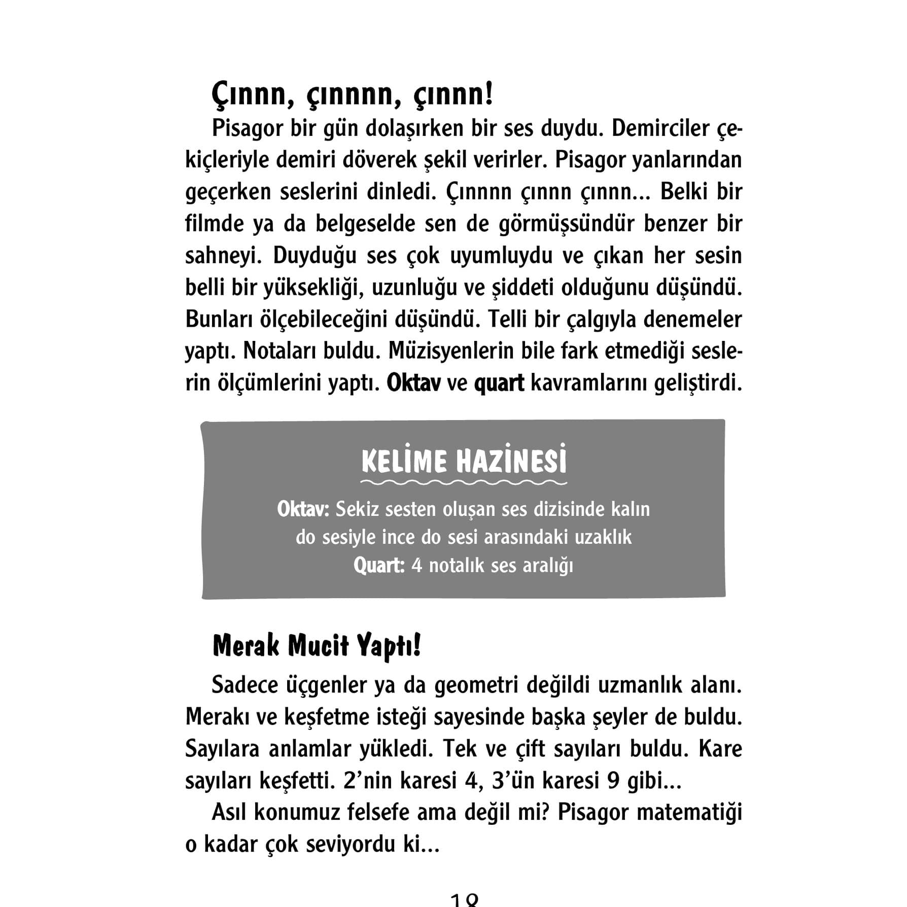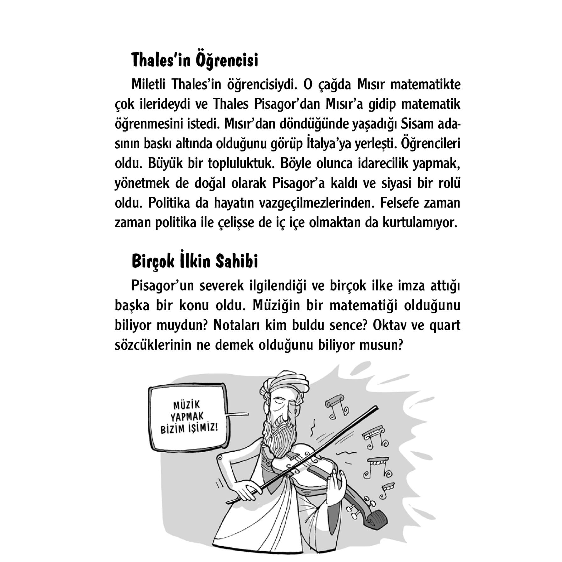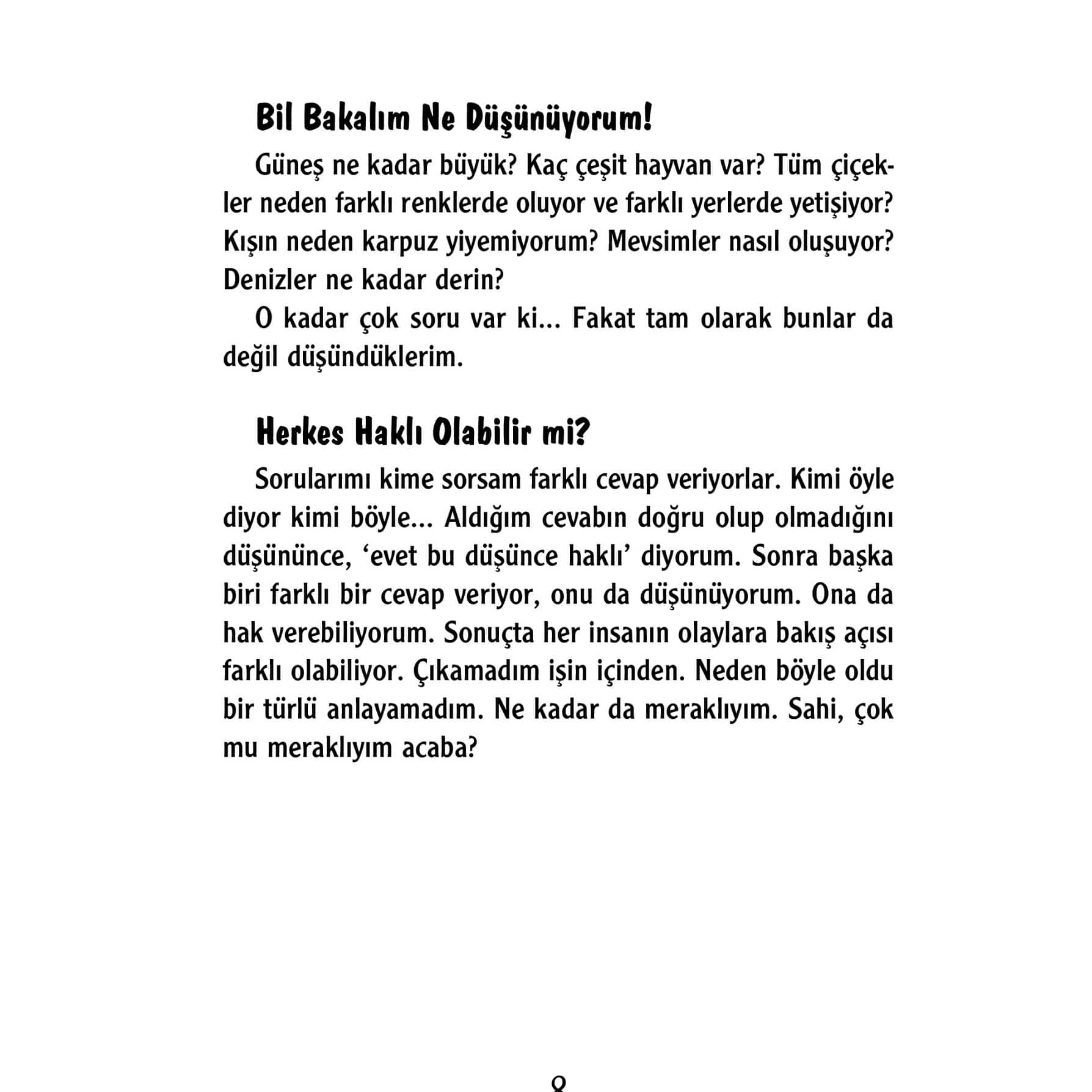 Bu kitapta, tarihin en büyük düşünürlerinin yaşamlarına konuk olacaksın. Sokrates’ten Pisagor’a, Farabi’den Descartes’e, Biruni’den Thales’e, Aristo’dan İbni Sina’ya çok sayıda düşünürle yakından tanışacaksın. Filozofların maceralarıyla dolu hikâyelerini keşfederken sen de büyük sorular sormaya başlayacaksın. Belki geleceğin filozofu olma yolunda ilk adımı atmış olacaksın. Merak etmenin ve düşünmenin inanılmaz sana nasıl kapılar açtığının şaşırarak farkına varacaksın. Filozoflar, dünyaya farklı gözlerle bakmayı severler. Kim bilir, bu kitabı okuduktan sonra kendi muhteşem sorularını sormaya başlayacaksın!