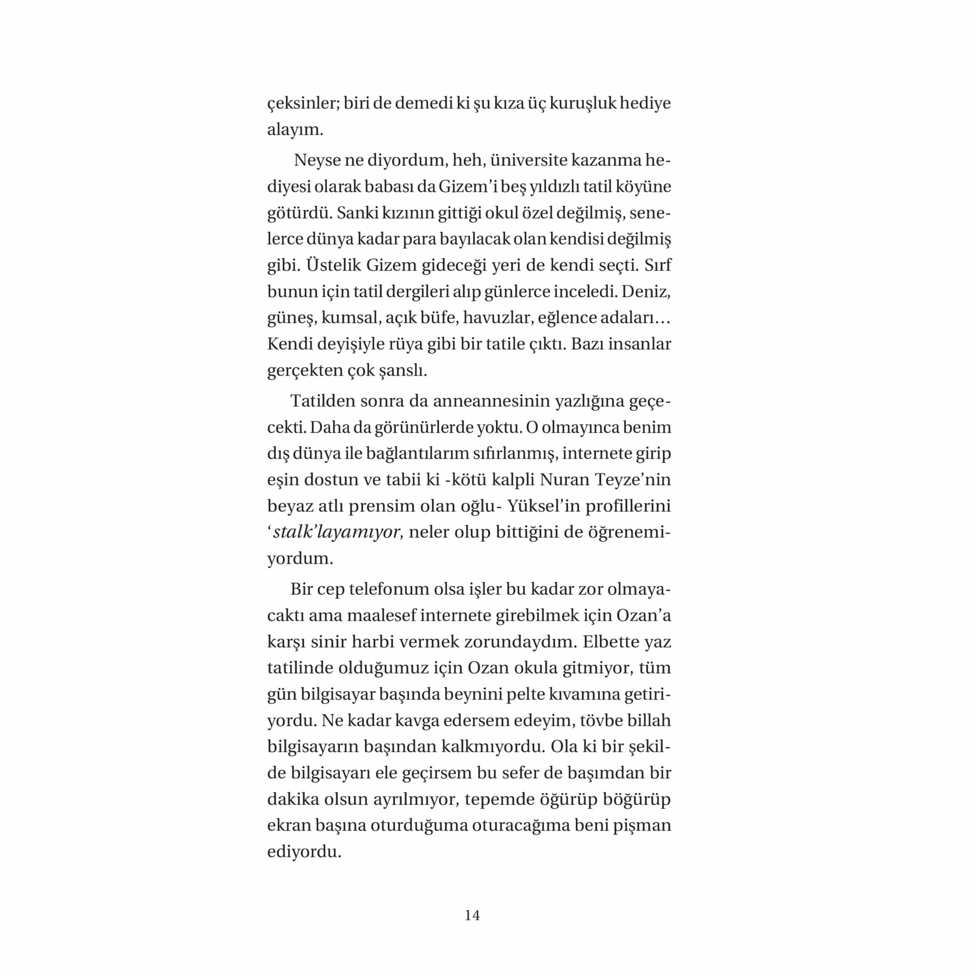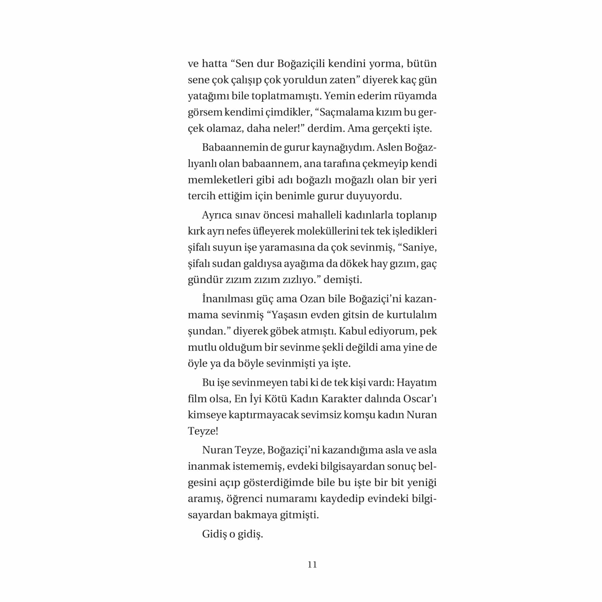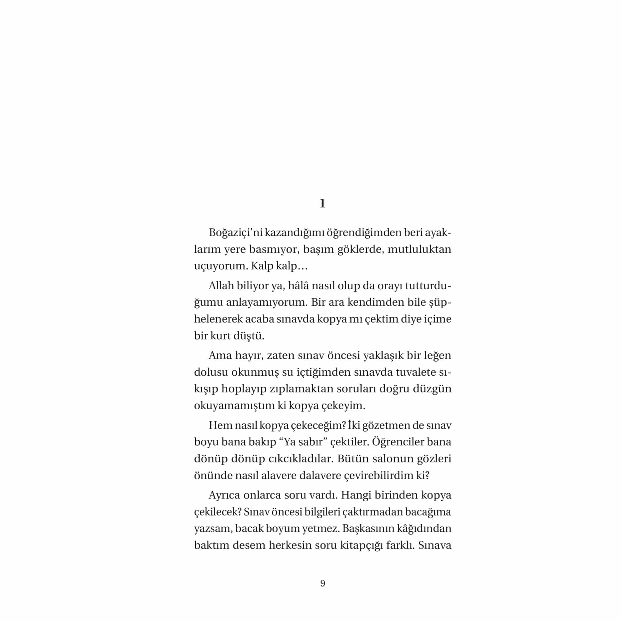Şu hayatta kaç kişi sınavda kaydırma yapıp Boğaziçi Üniversitesi’ni kazanmıştır ki? Evet, ben kazanmıştım işte! Annemin dip bucak temizlik seansları, babamın gardiyanlığı, Ozan’ın uyuzlukları, babaannemin kilitlendiği televizyon programları, Nuran Teyze’nin sinir bozucu laf sokmaları olmadan dizilerdeki gibi bir gençlik yaşayacaktım nihayet! Yani en azından ben öyle sanıyordum… Babamın kasap dükkânında çıraklık, maaile kampüs ziyaretimiz, babaannemle vahşi köy macerası, yılanlarla yaptığım korku dansı ve daha neler neler! Size tavsiyem, gülmelik maceramı okurken gölgelik bir yerde olduğunuzdan ve kaşlarınıza oksijenli su sürmediğinizden emin olun! Çünkü deniz, kum ve güneş hayaliyle çıkılan bir tatilde başınıza neler geleceğini bilemezsiniz...