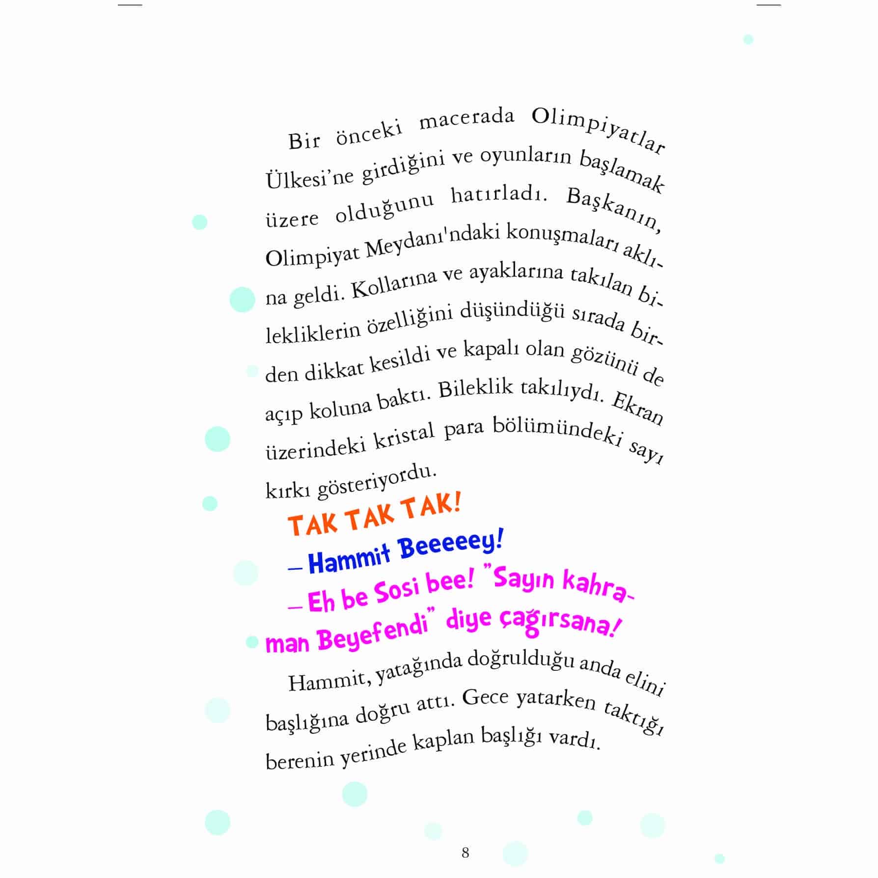 Anadolu’dan Fantasti’ye… Selam... Ben Hammit! Bu fantastik dünyanın kahramanıyım. Zıpır mirketler Sosi ve Feti, süsüne düşkün Zebragül, bazen güzel sözler söyleyen ama sonunda hep saçmalayan Bilgin de yol arkadaşlarım. Sonunda Olimpiyatlar Ülkesi'ne ulaştık! Ama macera daha yeni başlıyor: Kötü kalpli Ador, Kukiler ve Masallar Ülkesi sakinleri ile bu olimpiyatlarda yarışmamız gerekiyor. Altın Kristal'i kazanmalıyız! Birbirinden heyecanlı oyunlar, gizemli tuzaklar, çözülmeyi bekleyen şifreler, heyecan, macera ve elbette eğlence… Hepsi bu seride! Haydi, durma! Sayfaları çevir, sen de bu eğlenceli maceraya katıl! Geceleri kendi fantastik dünyasına dalan Hammit ve arkadaşlarının maceralarına doyamayacaksınız...