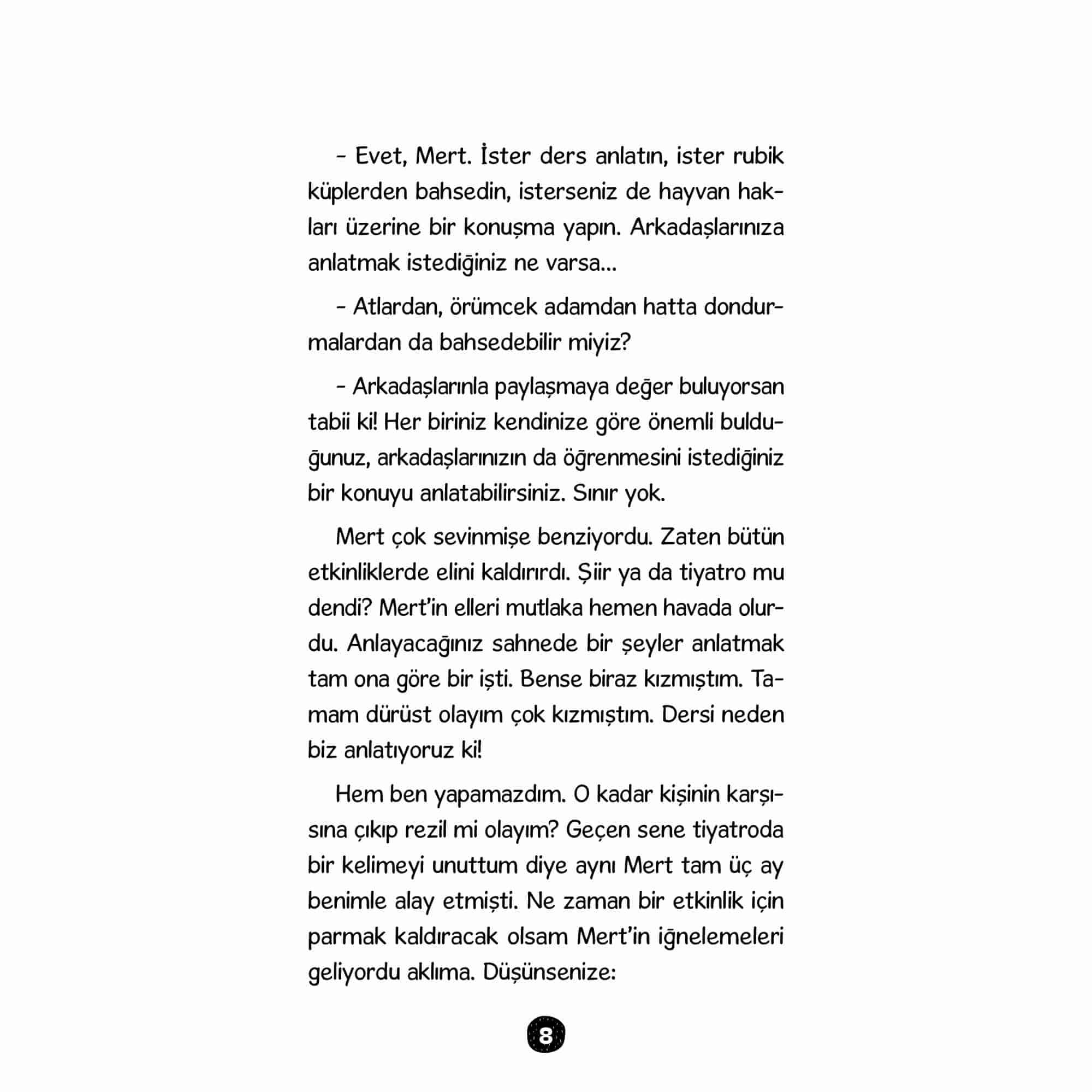 Bu kitap, çocukların arkadaş baskısından kaynaklanan sahne korkusunu ve aktif katılım çekingenliğini yenmelerine yardımcı olmayı amaçlıyor. Rezil olma korkusuyla mücadele etmenin yollarını öğreten eser, sahneye çıkmak isteyen öğrenci sayısını artırmayı hedefliyor. Hem eğlenceli hem de komik bir macera ile okuyucuyu derinden etkileyen bu kitap, aile içindeki bağları ve sosyal iletişim becerilerini güçlendirme üzerine de önemli vurgular yapıyor. Pratik uygulamalarla desteklenen hikâye, bir çocuğun heyecanını nasıl yeneceğini adım adım gösterirken, okurlarına aynı zamanda etkili hitabet teknikleri de sunuyor. Bu kitap, çocukların kendilerini ifade etme yeteneklerini geliştirmelerine büyük katkı sağlayacak.