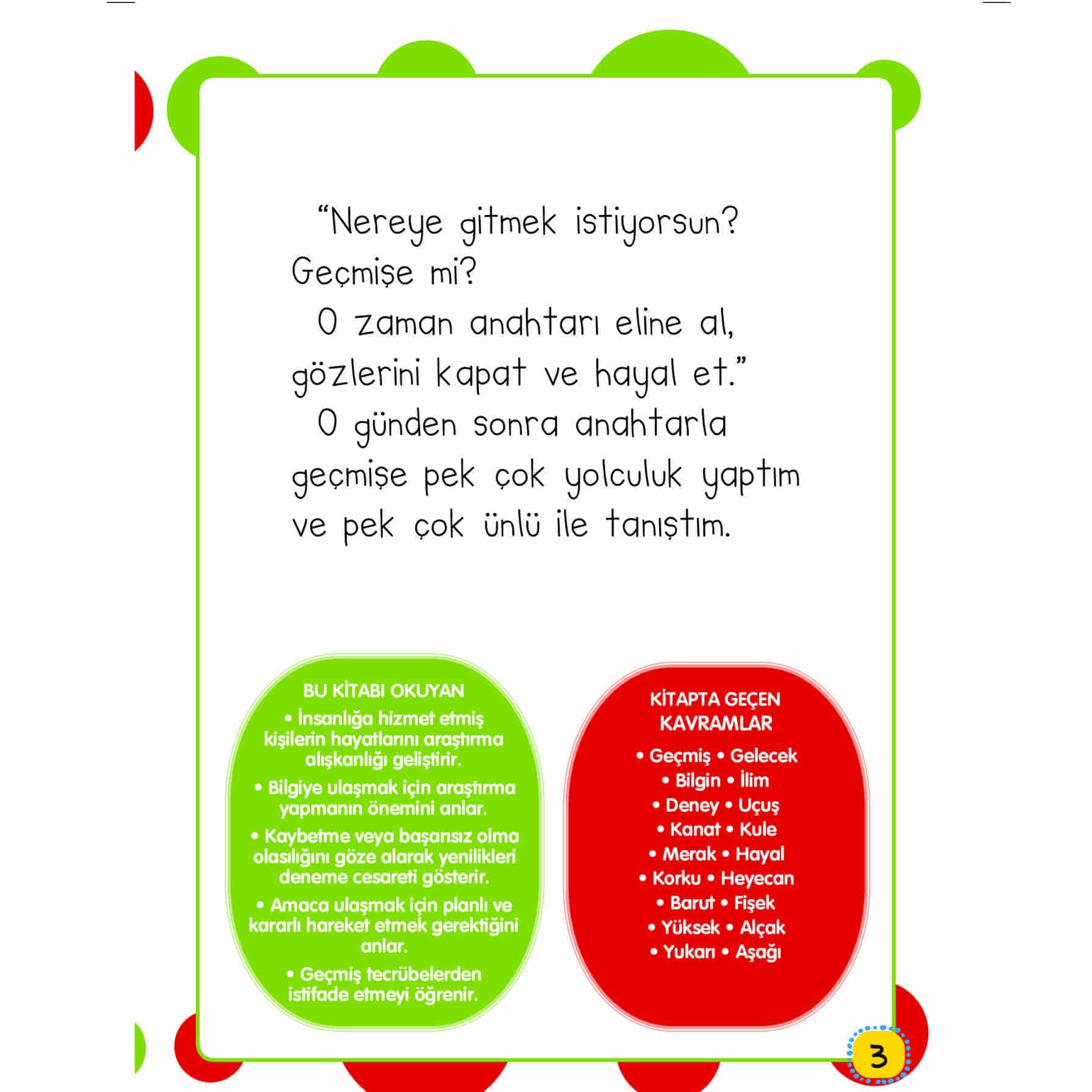 Hezarfen'le Bir Gün, çocuklara Hezarfen Ahmet Çelebi ve tarihteki yerini anlatırken, aynı zamanda aşağıdaki kazanımları da edinmelerini sağlar. • İnsanlığa hizmet etmiş kişilerin hayatlarını araştırma alışkanlığı geliştirirler. • Bilgiye ulaşmak için araştırma yapmanın önemini anlarlar. • Kaybetme veya başarısız olma olasılığını göze alarak [...]