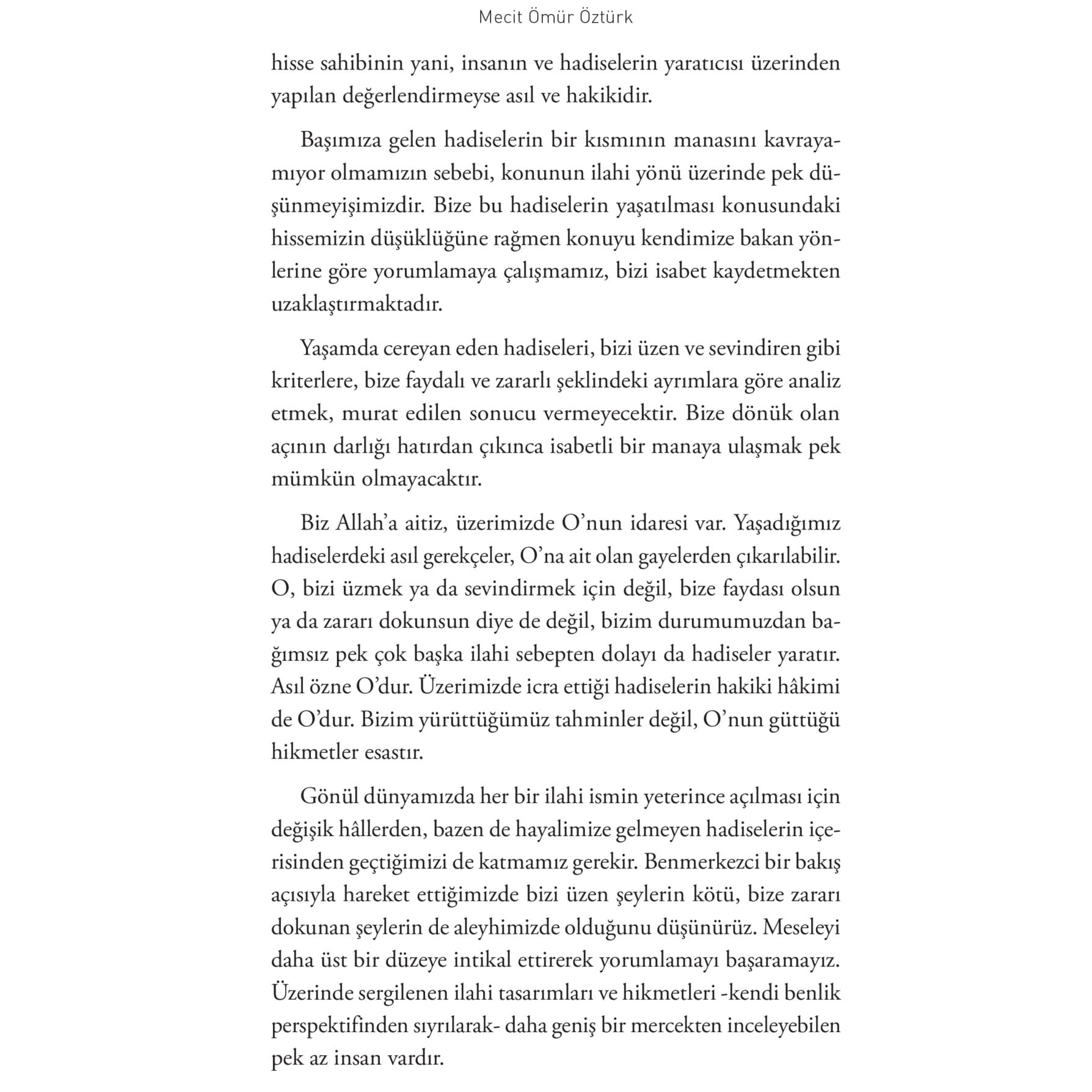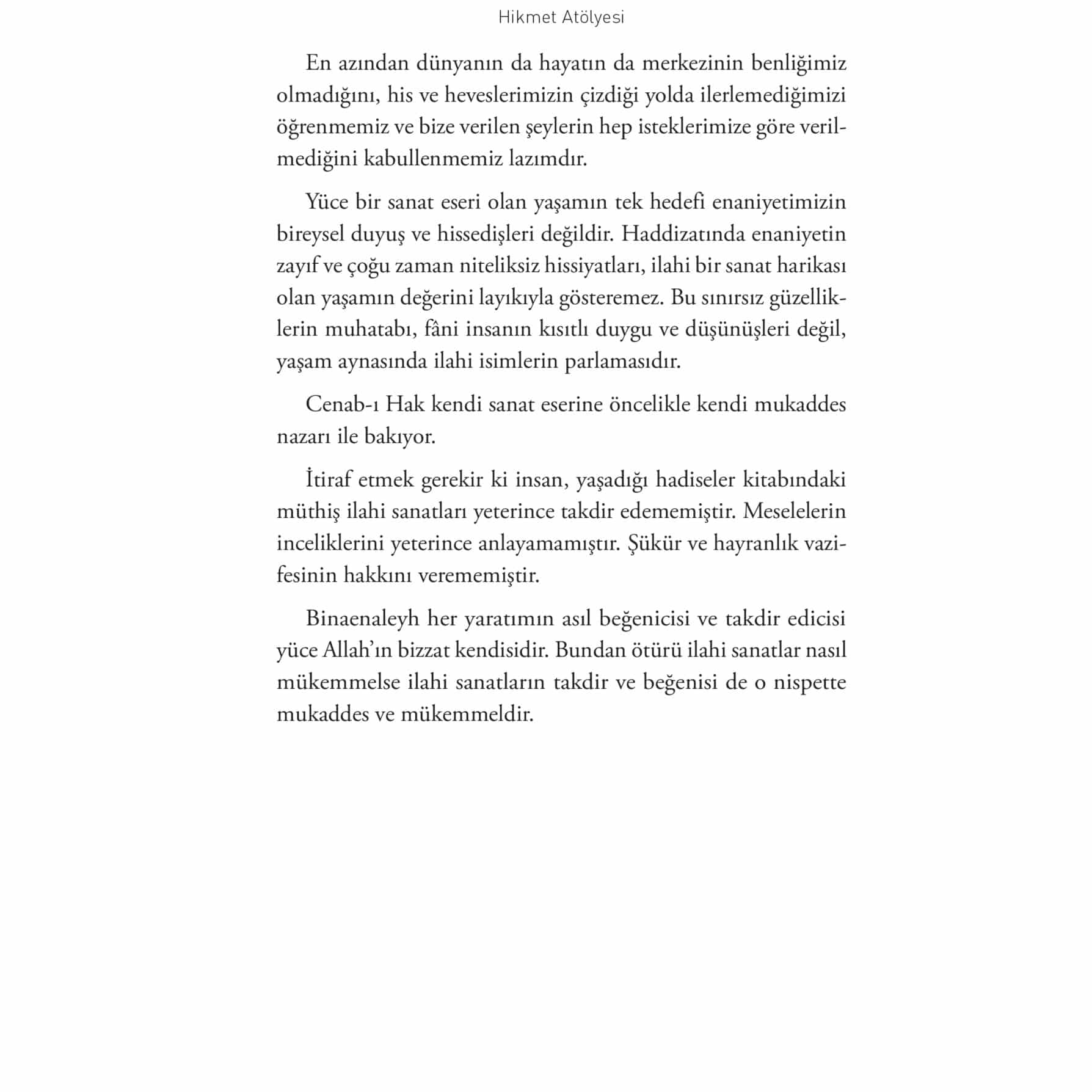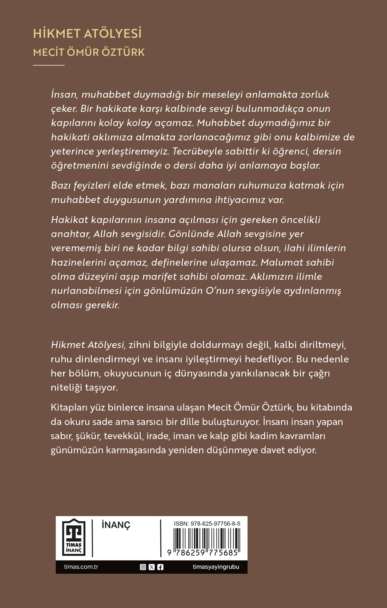 İnsan, muhabbet duymadığı bir meseleyi anlamakta zorluk çeker. Bir hakikate karşı kalbinde sevgi bulunmadıkça onun kapılarını kolay kolay açamaz. Muhabbet duymadığımız bir hakikati aklımıza almakta zorlanacağımız gibi onu kalbimize de yeterince yerleştiremeyiz. Tecrübeyle sabittir ki öğrenci, dersin öğretmenini sevdiğinde o dersi daha iyi anlamaya başlar. Bazı feyizleri elde etmek, bazı manaları ruhumuza katmak için muhabbet duygusunun yardımına ihtiyacımız var. Hakikat kapılarının insana açılması için gereken öncelikli anahtar, Allah sevgisidir. Gönlünde Allah sevgisine yer verememiş biri ne kadar bilgi sahibi olursa olsun, ilahi ilimlerin hazinelerini açamaz, definelerine ulaşamaz. Malumat sahibi olma düzeyini aşıp marifet sahibi olamaz. Aklımızın ilimle nurlanabilmesi için gönlümüzün O’nun sevgisiyle aydınlanmış olması gerekir. Hikmet Atölyesi, zihni bilgiyle doldurmayı değil, kalbi diriltmeyi, ruhu dinlendirmeyi ve insanı iyileştirmeyi hedefliyor. Bu nedenle her bölüm, okuyucunun iç dünyasında yankılanacak bir çağrı niteliği taşıyor. Kitapları yüz binlerce insana ulaşan Mecit Ömür Öztürk, bu kitabında da okuru sade ama sarsıcı bir dille buluşturuyor. İnsanı insan yapan sabır, şükür, tevekkül, irade, iman ve kalp gibi kadim kavramları günümüzün karmaşasında yeniden düşünmeye davet ediyor.