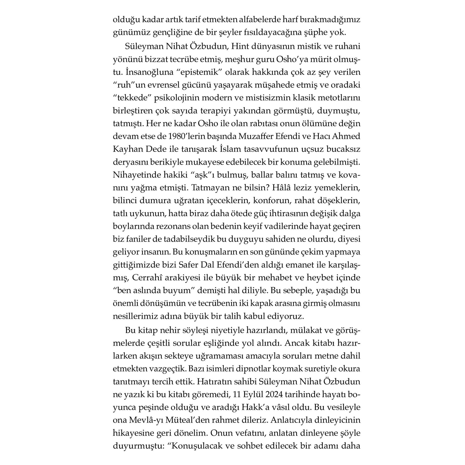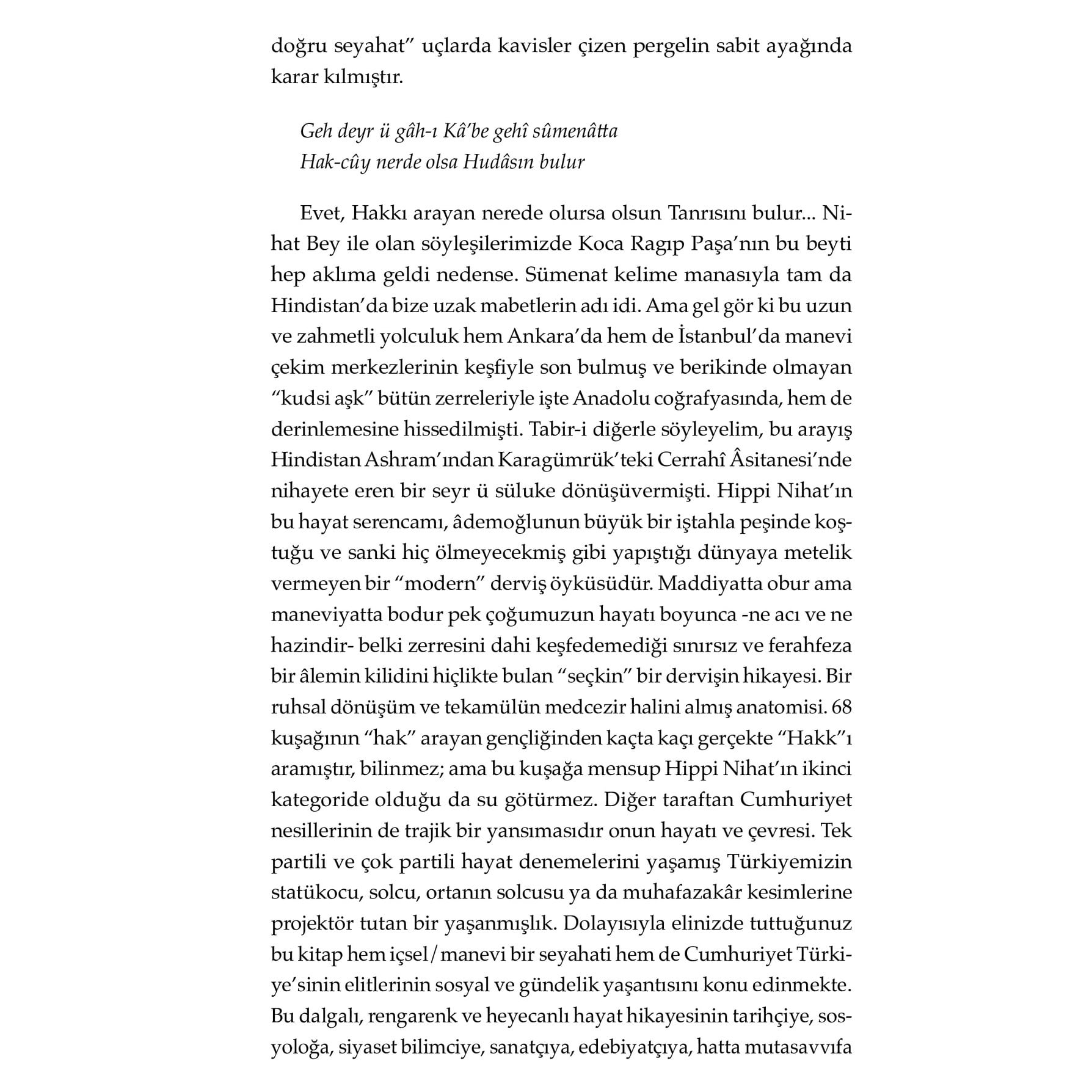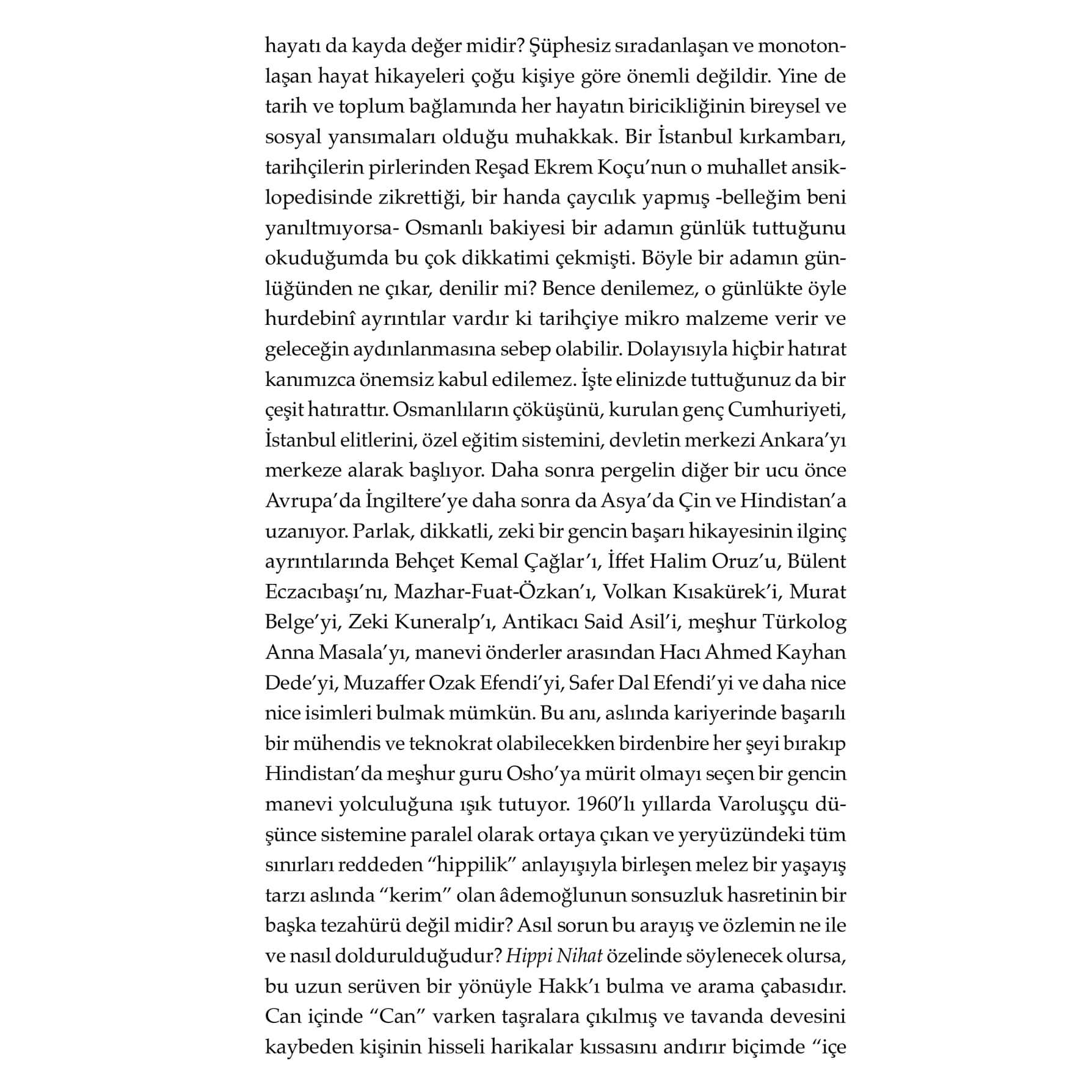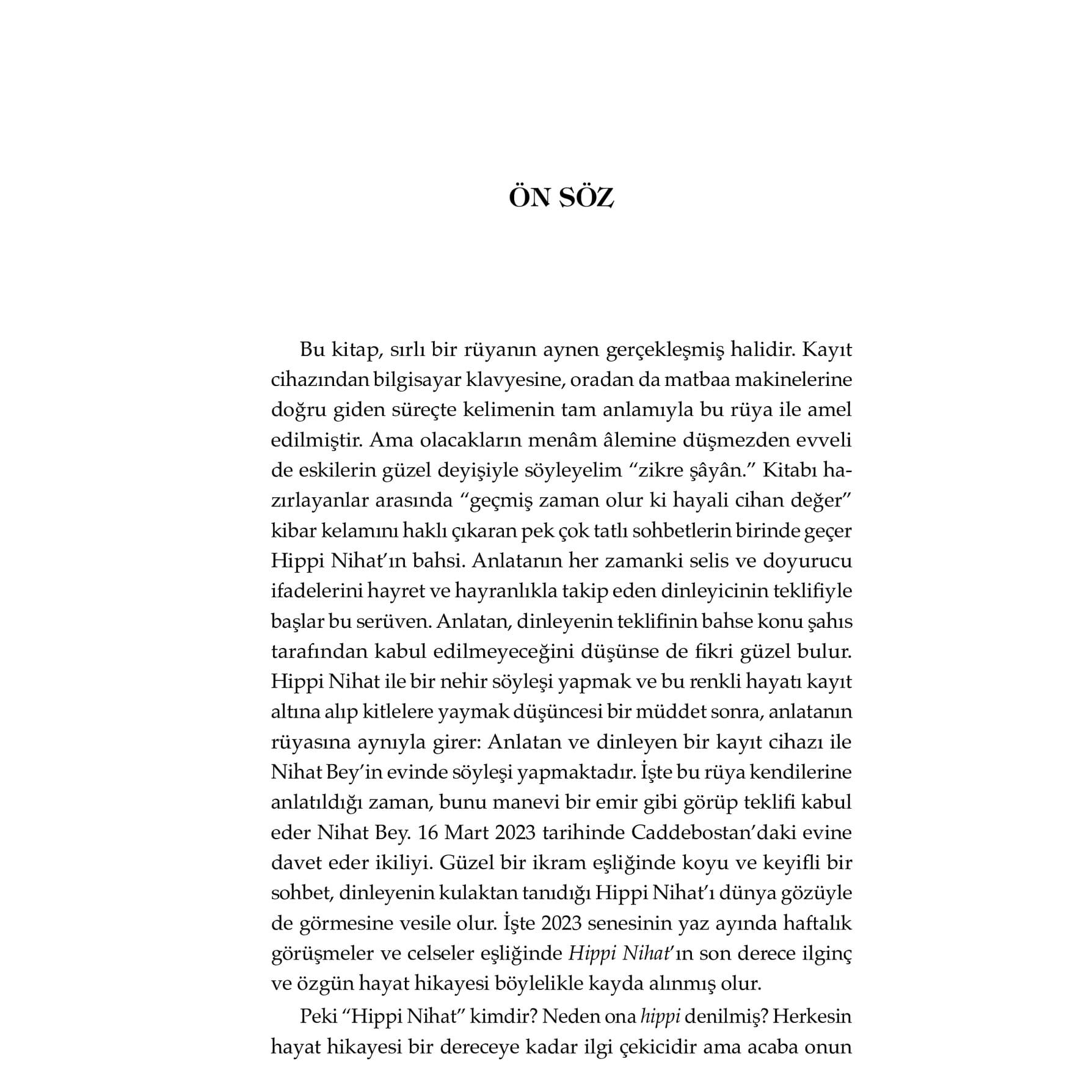 Benim Hindistan’da gördüğüm o sıra dışı haller aslında “Allahsız”dı. Allah lafı edilmezdi. O sebeple her şeyin başı öncelikle bir olan Allah’a inanmaktır. Din, bir insanın ulaşacağı mananın çok ötesinde bir muhtevaya sahip. Bu kitap, kariyerinde başarılı bir mühendis ve teknokrat olabilecekken birdenbire her şeyi bırakıp Hindistan’da meşhur guru Osho’ya mürit olmayı seçen bir gencin manevi yolculuğuna ışık tutuyor. 1960’lı yıllarda Varoluşçu düşünce sistemine paralel olarak ortaya çıkan ve yeryüzündeki tüm sınırları reddeden “hippilik” anlayışıyla birleşen melez bir yaşayış tarzı, aslında “kerim” olan âdemoğlunun sonsuzluk hasretinin bir tezahürü olarak “Hippi Nihat” özelinde söylenecek olursa Hakk’ı bulma ve arama çabasıdır. Osho'nun ashramında başlayıp Anadolu irfanında nihayete eren bu hatırat, yalnızca bir dönemin ruhunu değil, bir insanın hakikati arama çabasını, düşüşlerini ve dönüşlerini anlatıyor.
