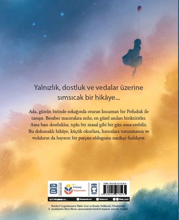 Yalnızlık, dostluk ve vedalar üzerine dokunaklı bir hikâye… Ana karakterimiz bir gün Pofuduk ile tanışır ve aralarındaki beklenmedik dostluk, hayatı boyunca unutamayacağı değerli anlar yaratır. Birlikte gülüp eğlenir, maceralara atılırlar. Ancak hayattaki birçok şey gibi, bazı dostluklar da bir gün vedayla buluşur... Bu kitap, çocuklara kayıpları kabullenmeyi, anıları sahiplenmeyi ve yeni başlangıçların güzelliğini öğretirken, empati ve sevgi dolu bir hikâye sunuyor.