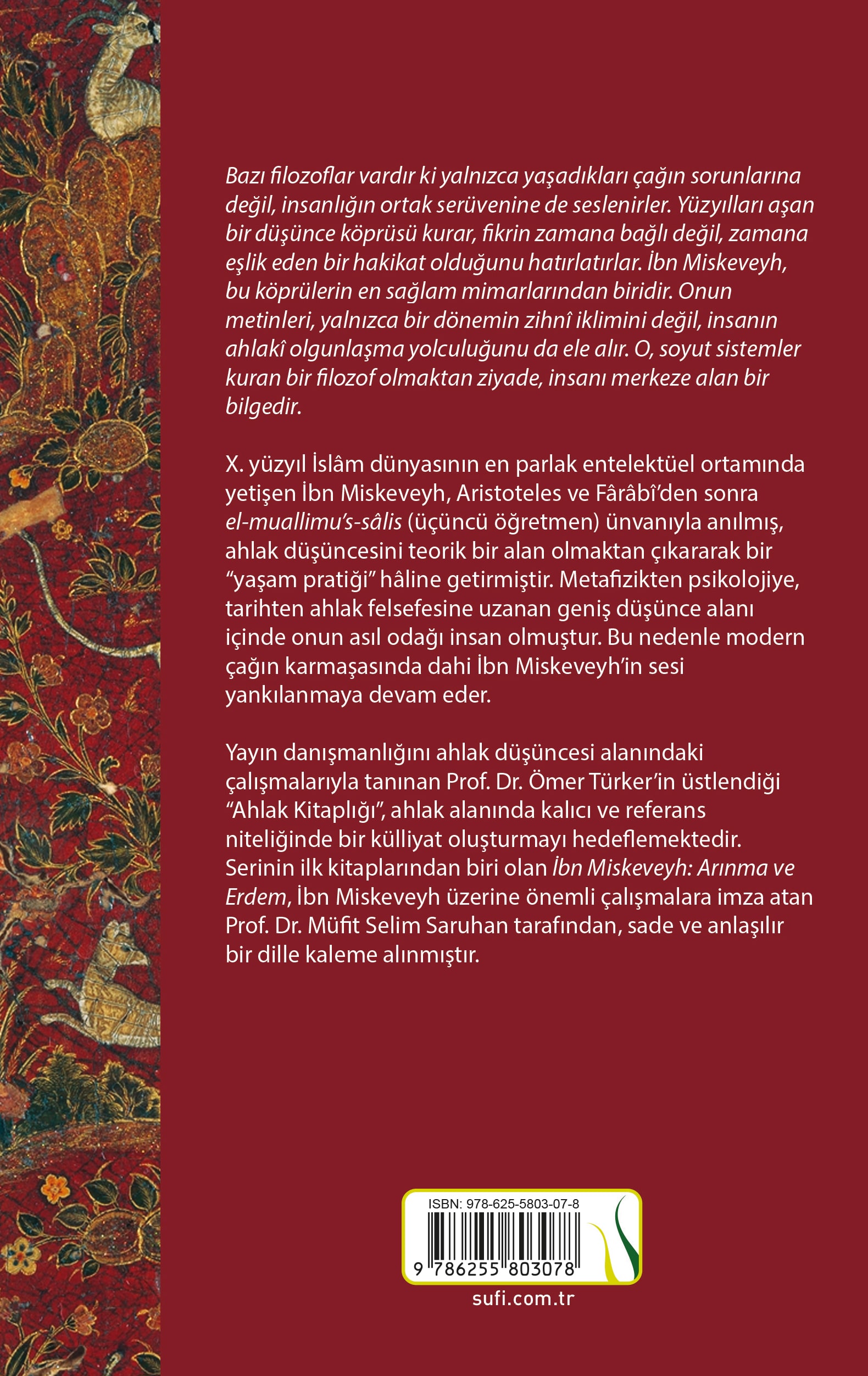 Bazı filozoflar vardır ki yalnızca yaşadıkları çağın sorunlarına değil, insanlığın ortak serüvenine de seslenirler. Yüzyılları aşan bir düşünce köprüsü kurar, fikrin zamana bağlı değil, zamana eşlik eden bir hakikat olduğunu hatırlatırlar. İbn Miskeveyh, bu köprülerin en sağlam mimarlarından biridir. Onun metinleri, yalnızca bir dönemin zihin iklimini değil, insanın ahlaki yolculuğunun da ele alır. O, soyut sistemler kuran bir filozoftan ziyade, insanı merkeze alan bir bilgedir. X. yüzyıl İslam dünyasının en parlak entelektüel ortamında yetişen İbn Miskeveyh, Aristoteles ve Fârâbî’den sonra el-muallimü’s-sâlis (üçüncü öğretmen) ünvanıyla anılmış, ahlak düşüncesini teorik bir alan olmaktan çıkararak bir “yaşam pratiği” hâline getirmiştir. Metafizikten psikolojiye, tarihten ahlak felsefesine uzanan geniş düşünce alanı içinde onun asıl odağı insan olmuştur. Bu nedenle modern çağın karmaşasında dahi İbn Miskeveyh’in sesi yankılanmaya devam eder. Yayın danışmanlığını ahlak düşüncesi alanındaki çalışmalarıyla tanınan Prof. Dr. Ömer Türker’in üstlendiği “Ahlak Kitaplığı”, ahlak alanında kalıcı ve referans niteliğinde bir külliyat oluşturmayı hedeflemektedir. Serinin ilk kitaplarından biri olan İbn Miskeveyh: Arınma ve Erdem, İbn Miskeveyh üzerine önemli çalışmalara imza atan Prof. Dr. Müfit Selim Saruhan tarafından sade ve anlaşılır bir dille kaleme alınmıştır.